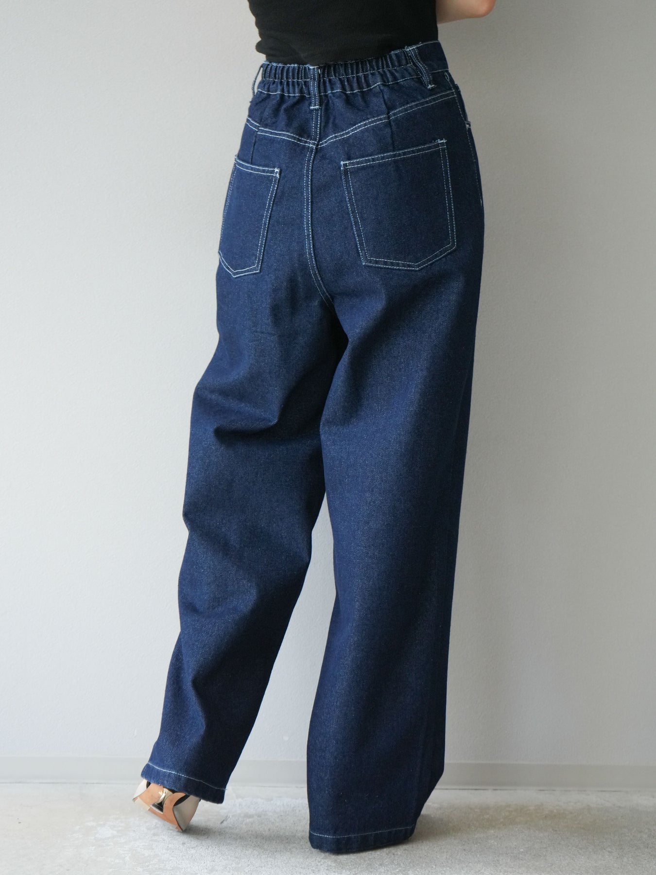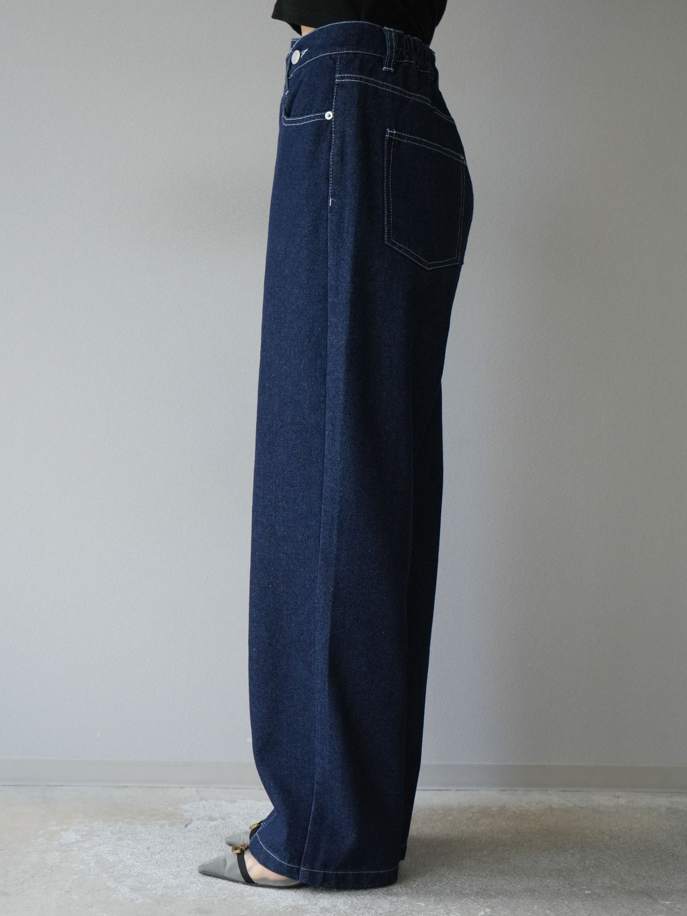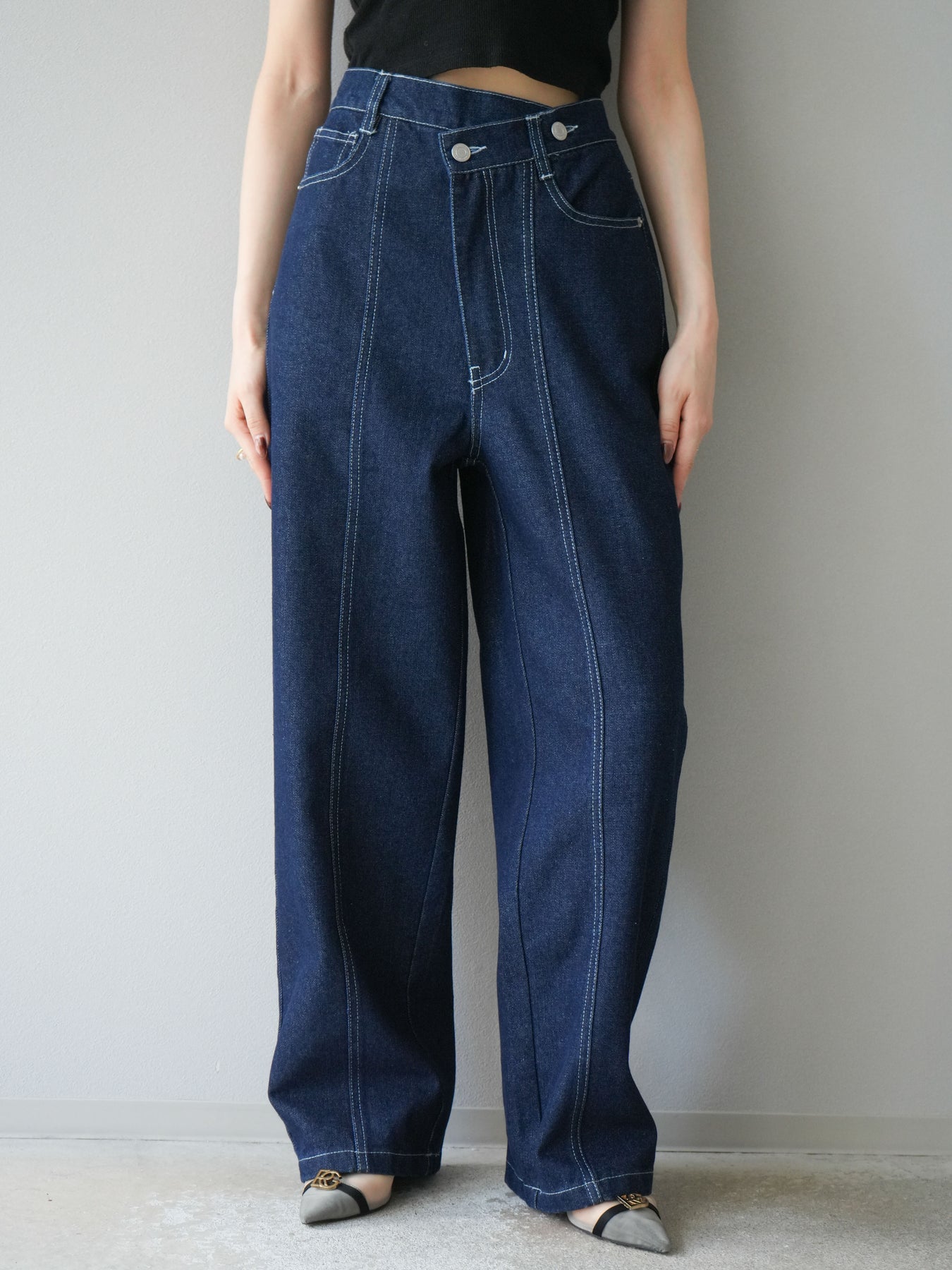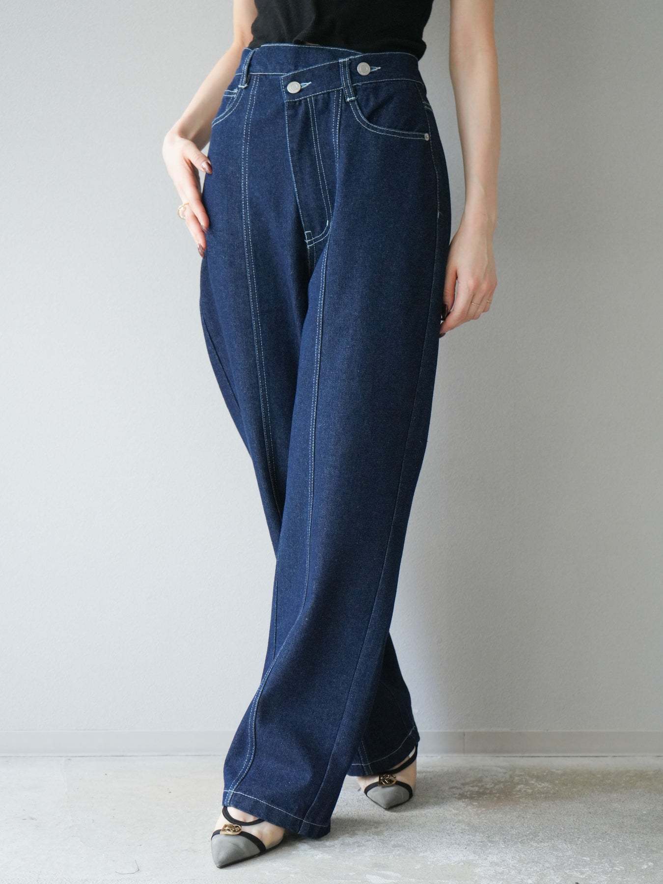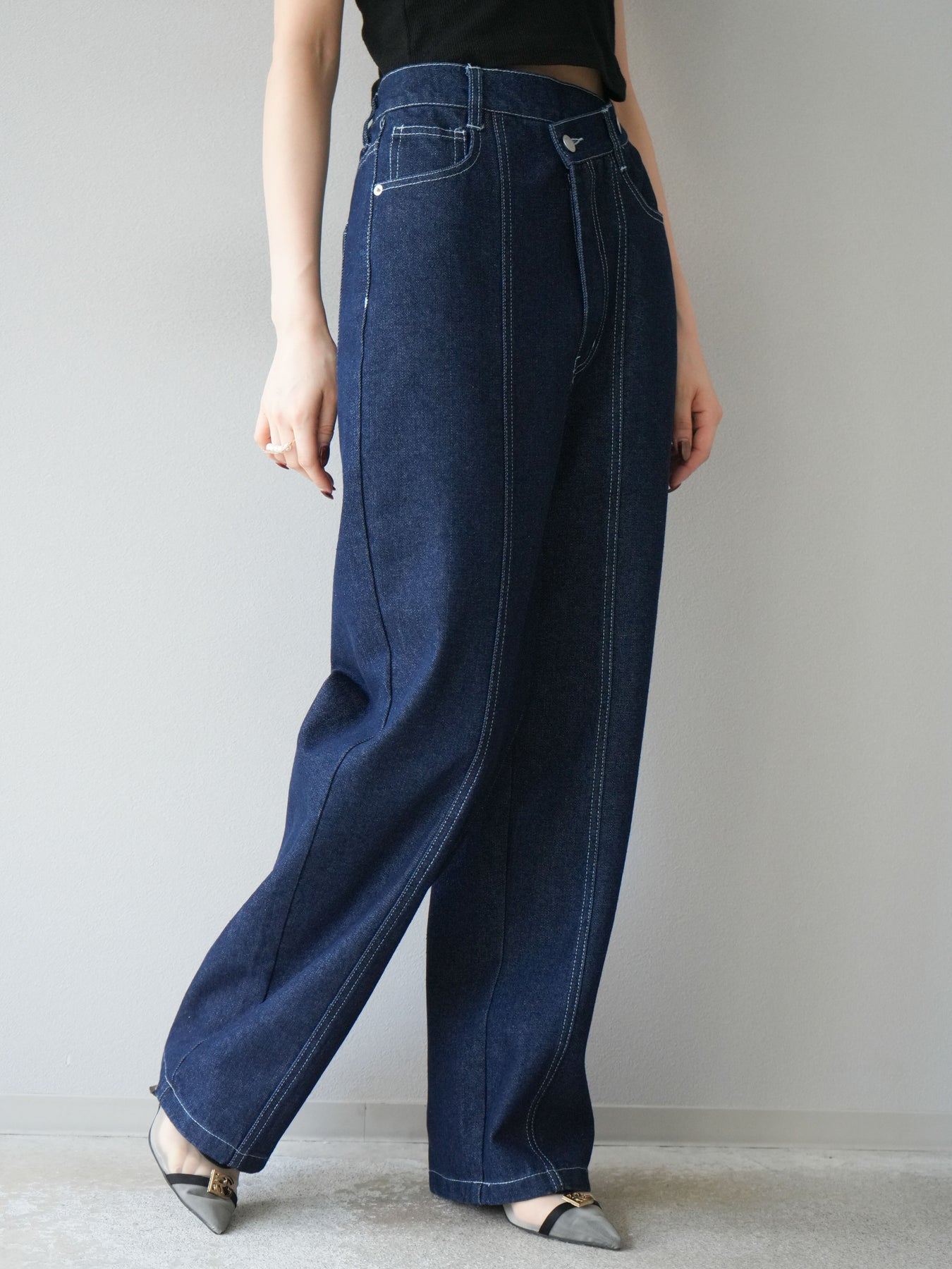 ラップ風ウエストがアクセントになった、モード感漂うストレートデニム。 センターシームと立体的なステッチワークが縦のラインを強調し、すっきりとした印象に。 程よいハリ感のある素材と計算されたシルエットで、美脚見えを叶えます。 Tシャツやブラウスとのスタイリングも映える、主役級の一本です。