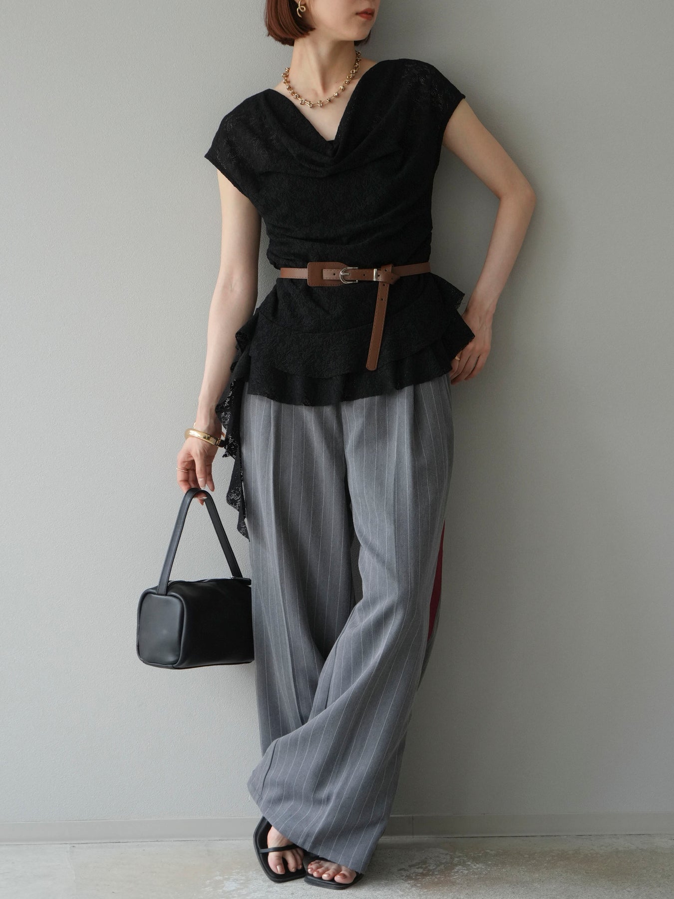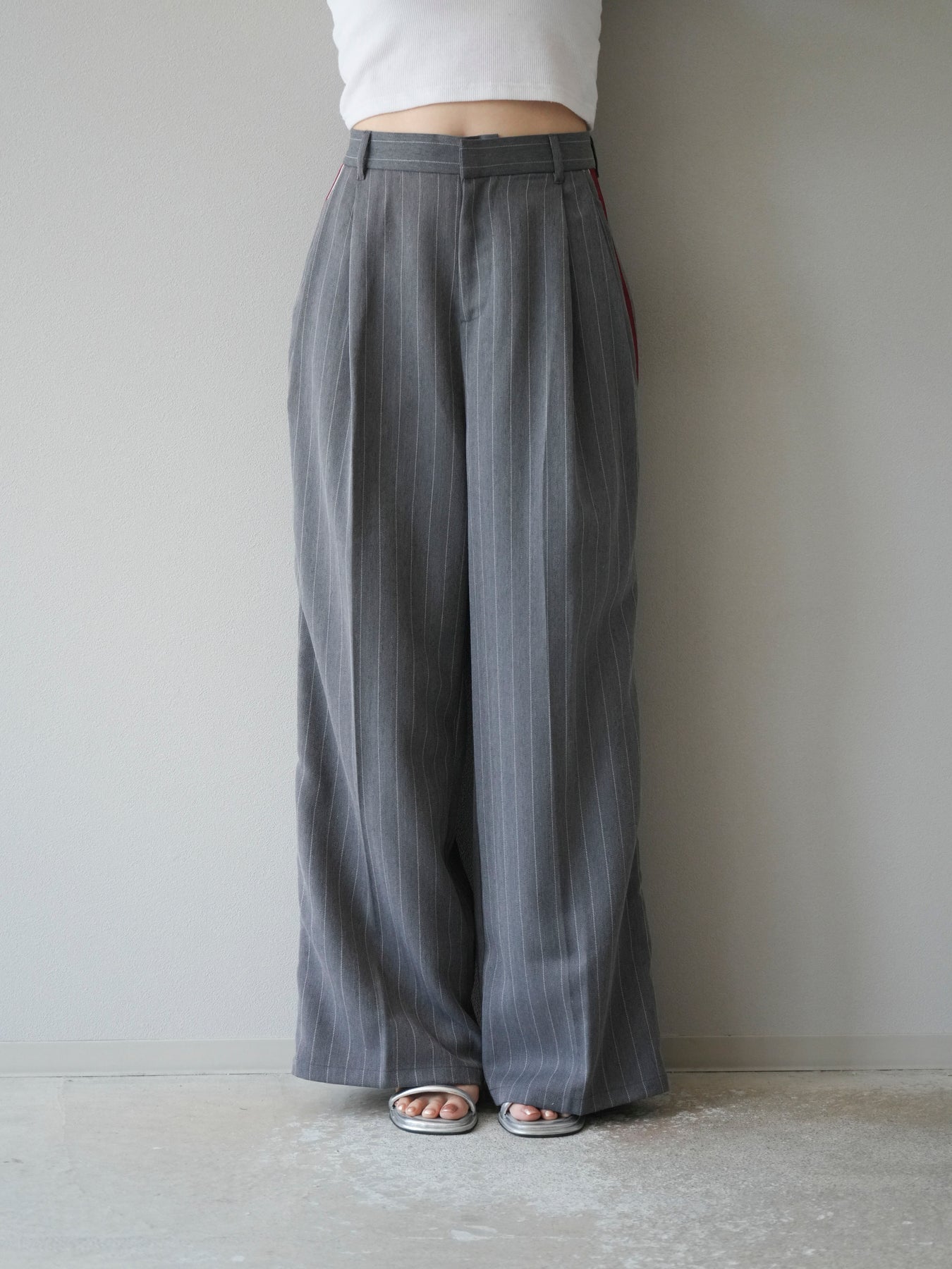 クラシックなストライプ柄に、サイドの配色ラインでスポーティさをプラスしたワイドパンツ。 ストンと落ちるワイドシルエットが脚のラインを拾わず、リラクシーな穿き心地ながらもスマートな印象に。 ウエストはタック入りで、立体感のあるフォルムに仕上げています。 サイドのラインがさりげなくアクセントになり、シンプルなトップスとも相性抜群。 通勤スタイルから休日のカジュアルまで、幅広く活躍する一本です。