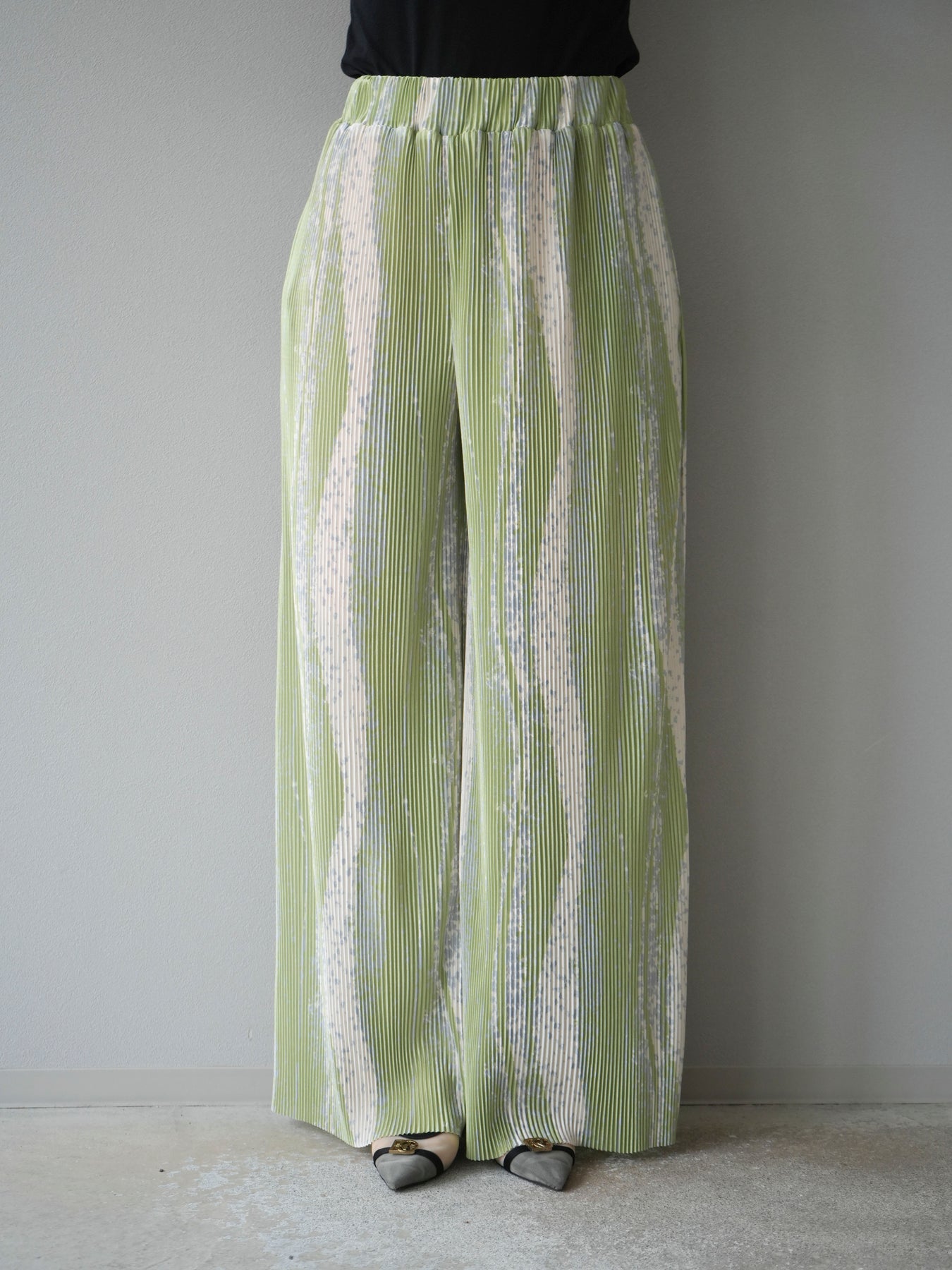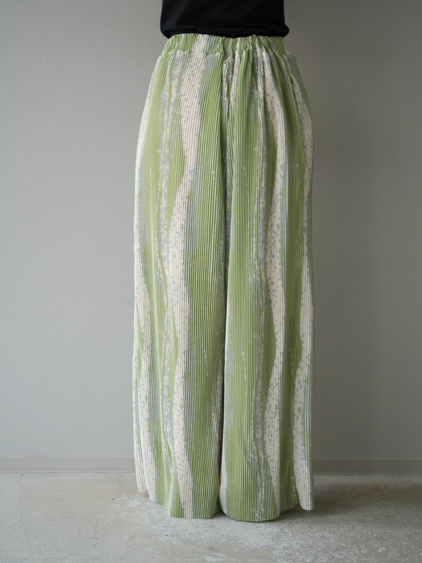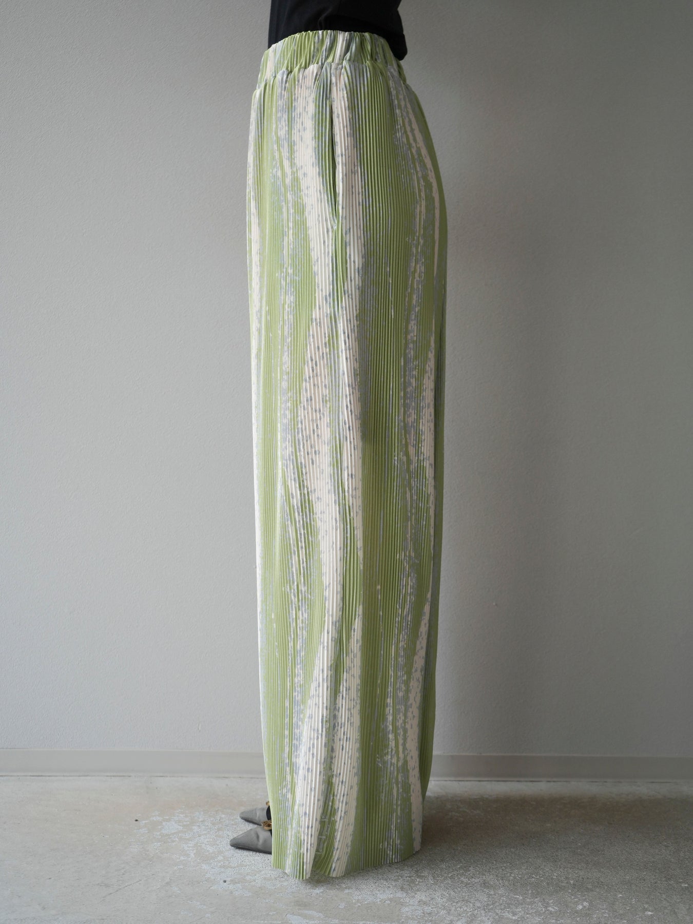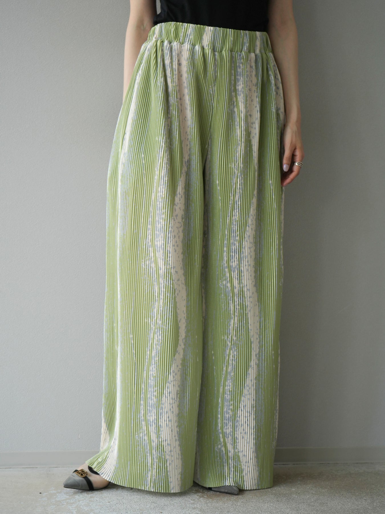 ランダムな柄使いと細プリーツが目を惹くデザインワイドパンツ。ストレッチ性のある軽やかな素材で快適な着心地を叶えながら、動くたびに表情が生まれる立体的なシルエットに。ウエストは総ゴム仕様でストレスフリー、コーデの主役としてはもちろん、シンプルなトップスと合わせるだけでこなれたスタイルが完成。