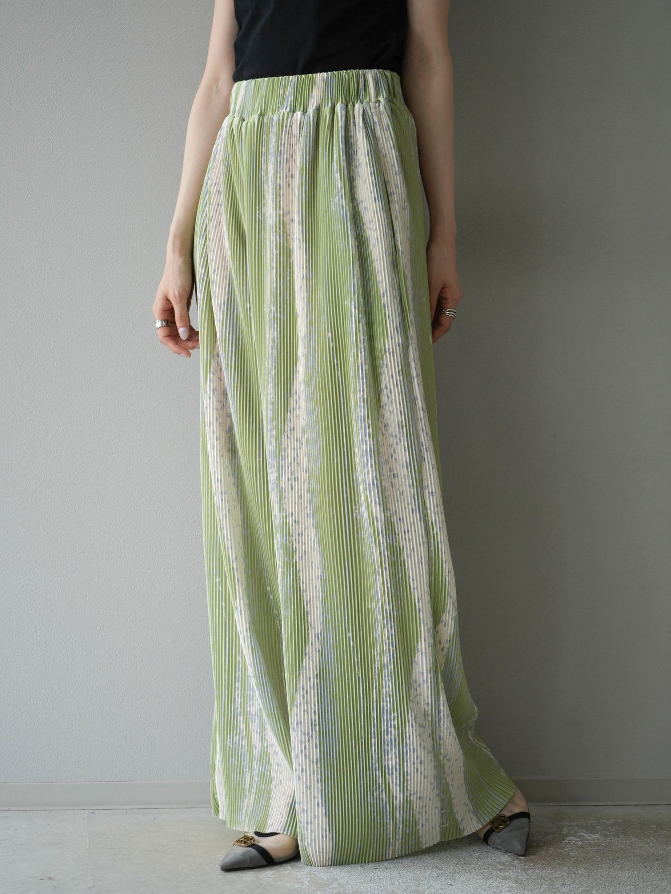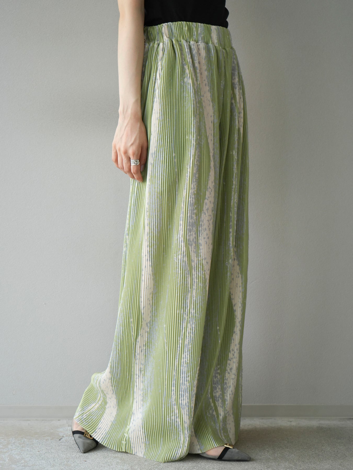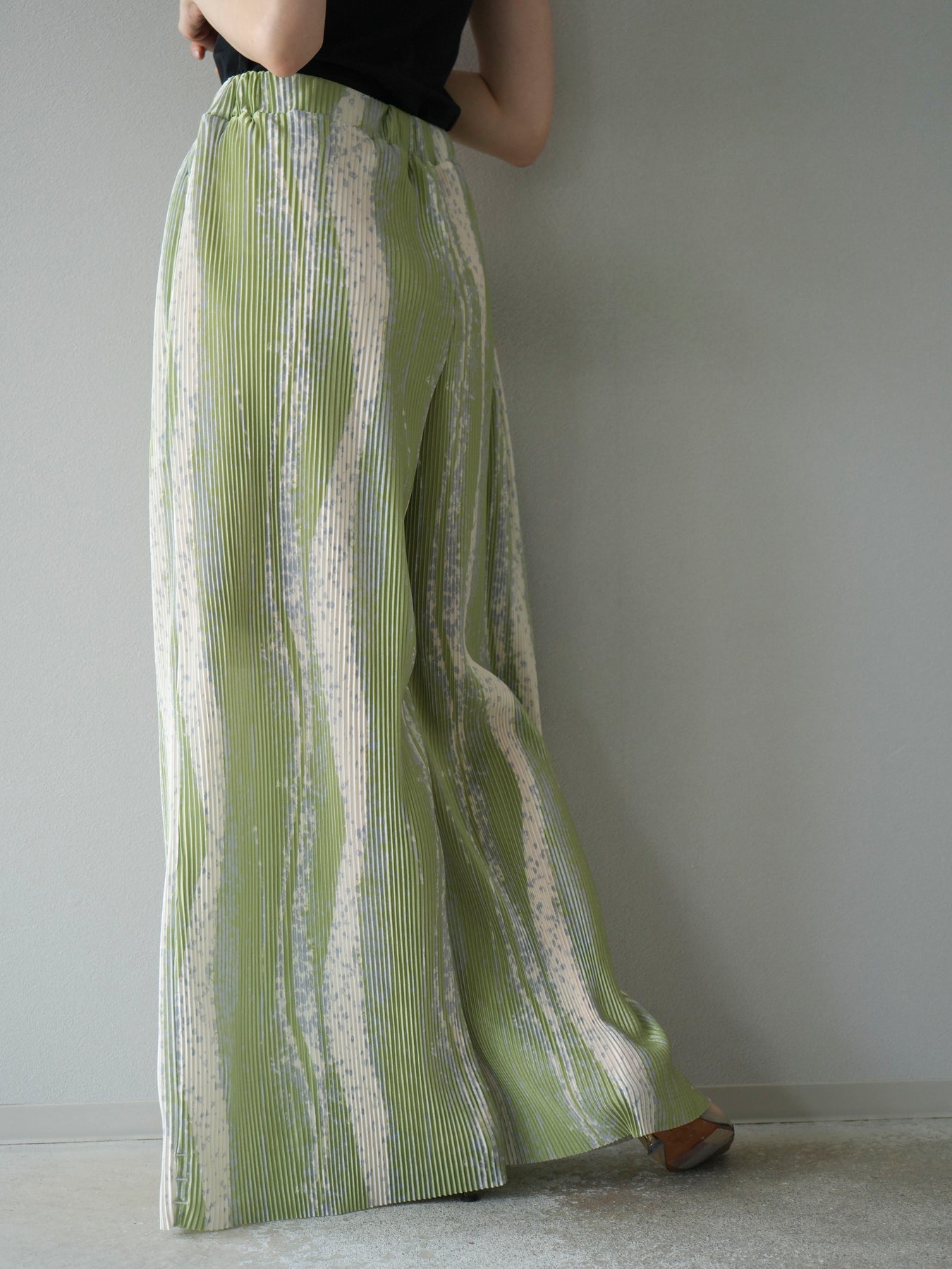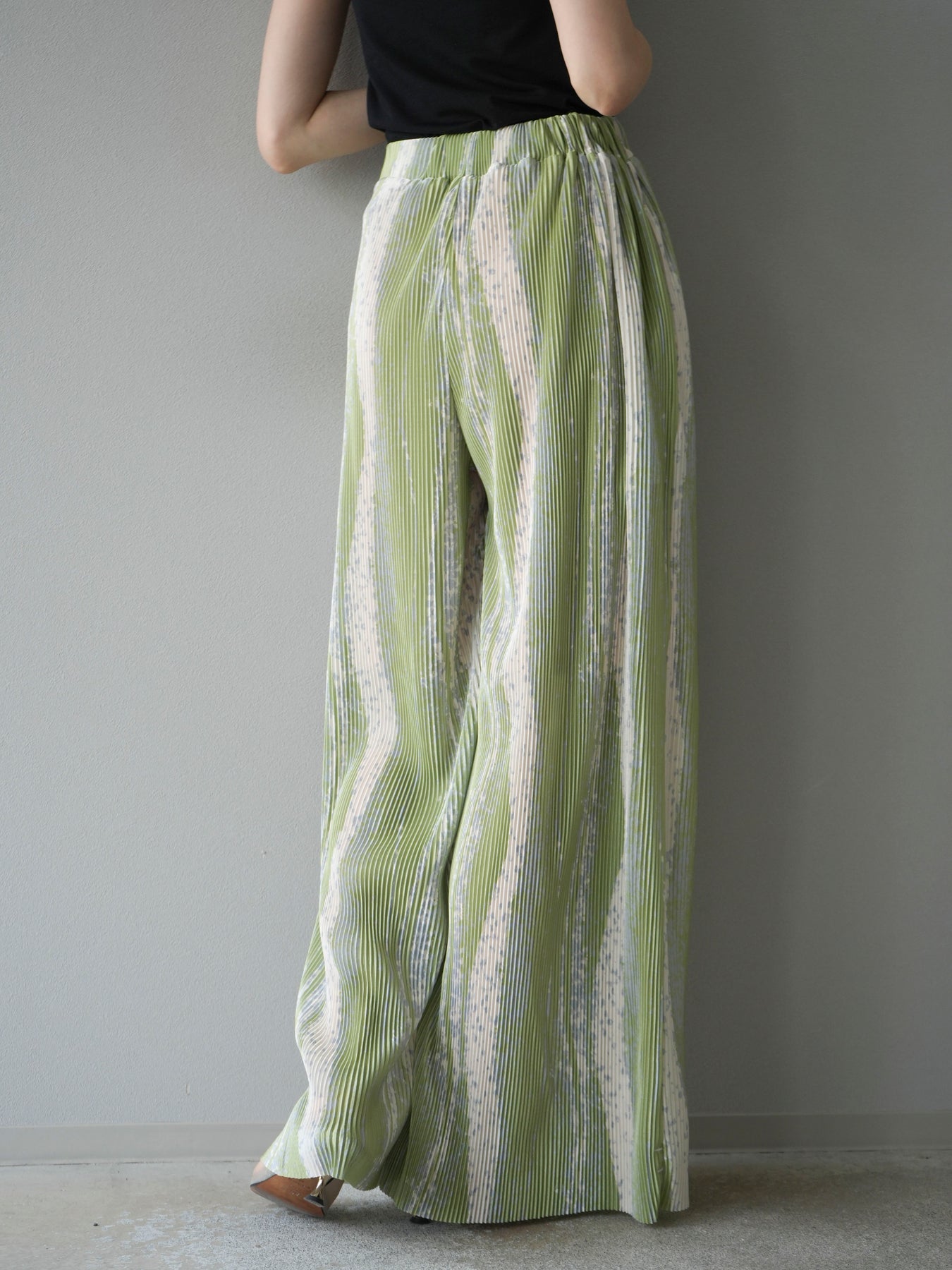 ランダムな柄使いと細プリーツが目を惹くデザインワイドパンツ。ストレッチ性のある軽やかな素材で快適な着心地を叶えながら、動くたびに表情が生まれる立体的なシルエットに。ウエストは総ゴム仕様でストレスフリー、コーデの主役としてはもちろん、シンプルなトップスと合わせるだけでこなれたスタイルが完成。