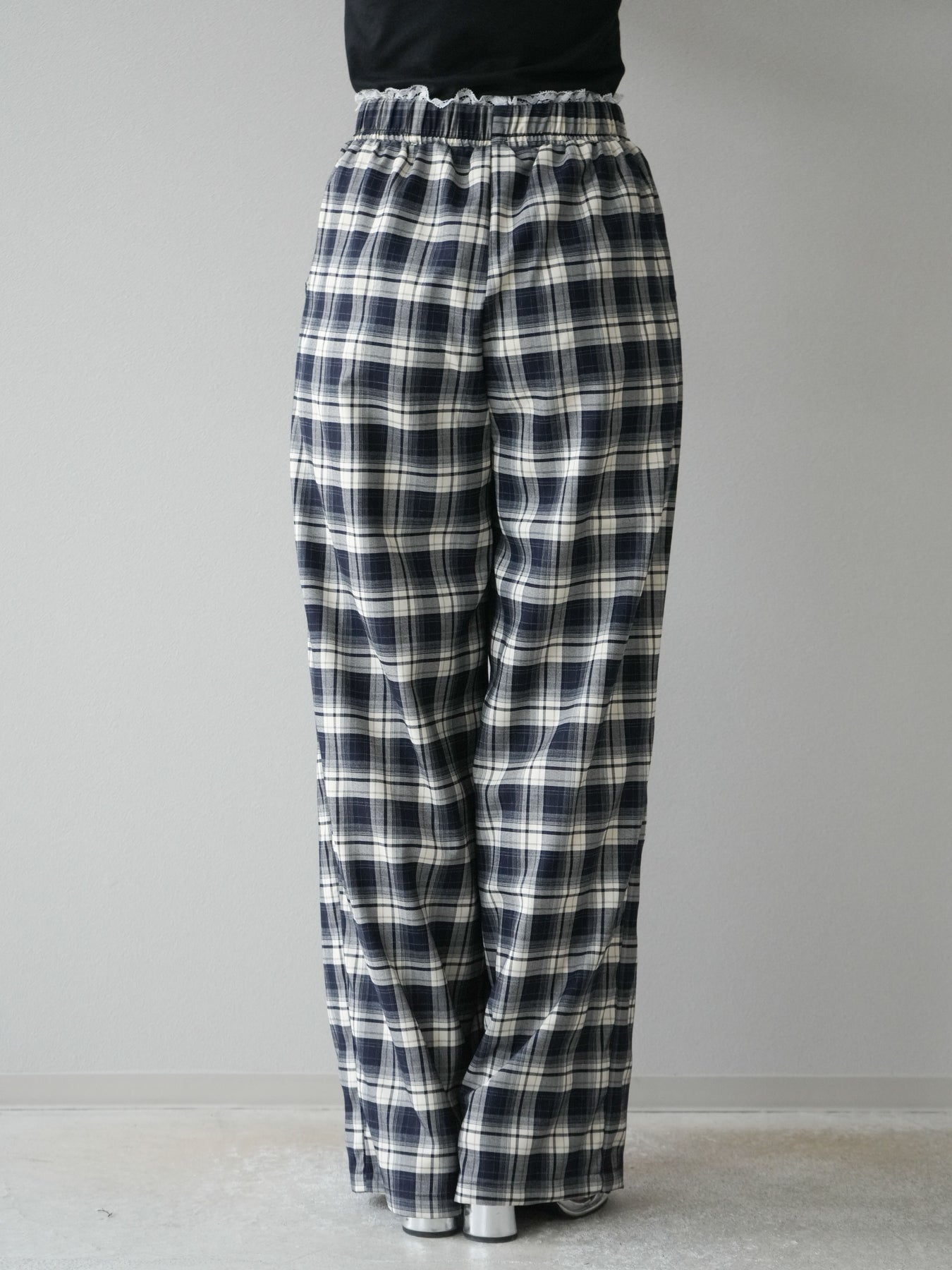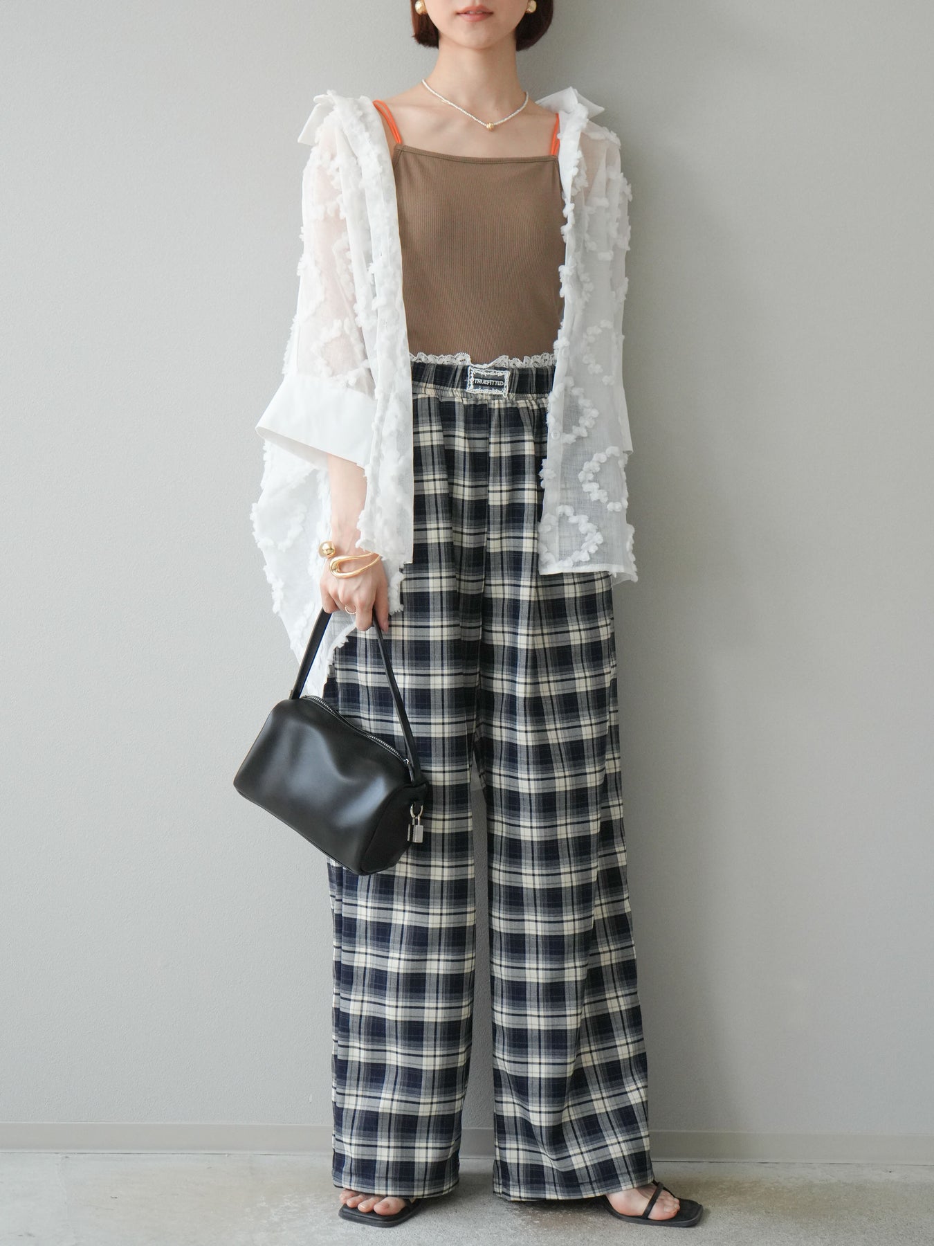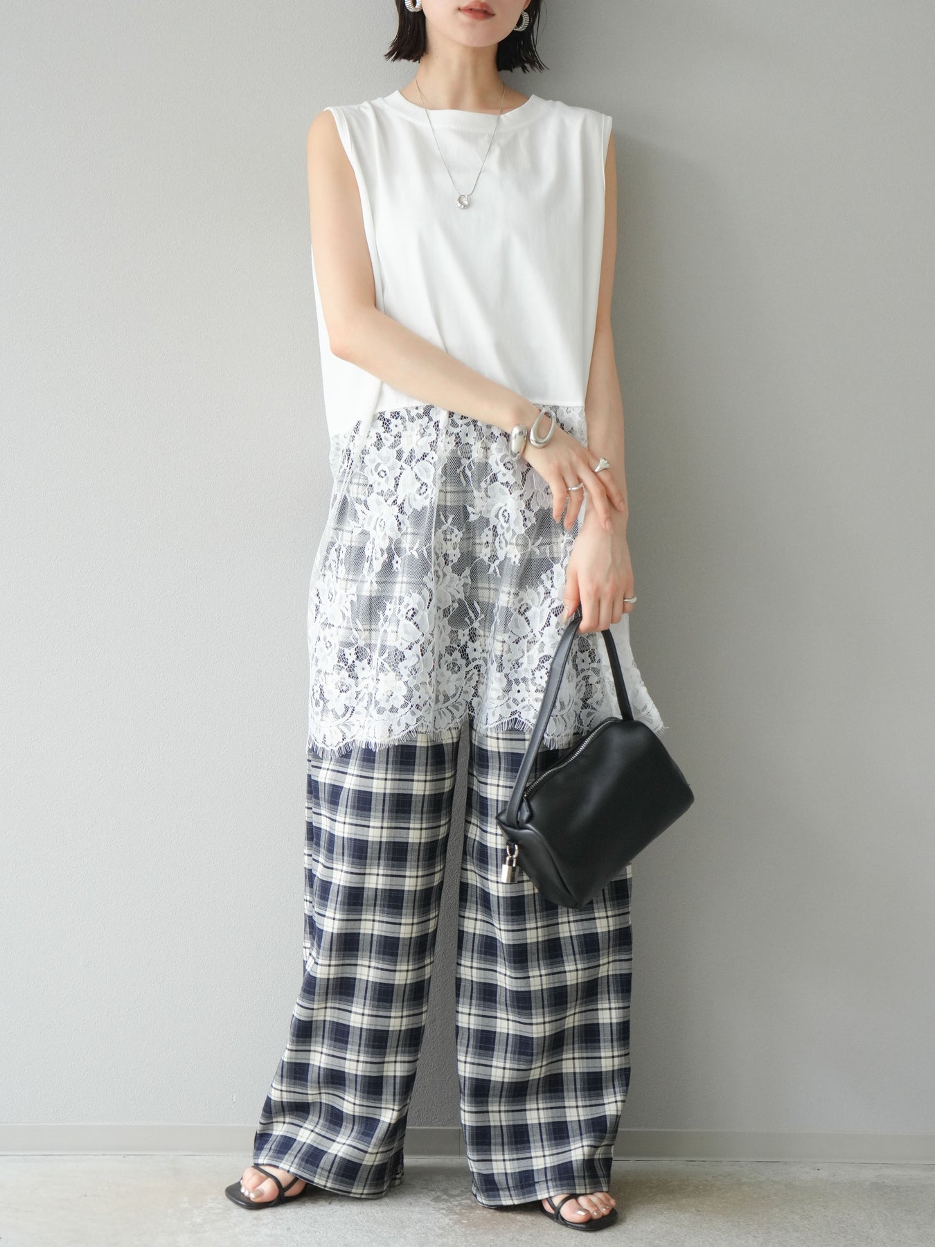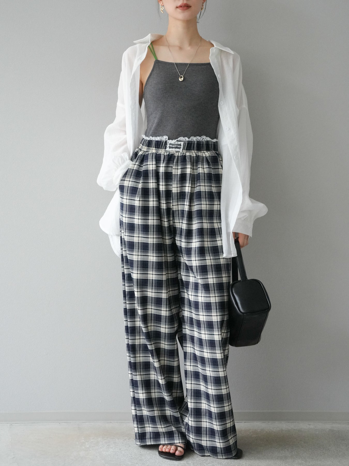 寬褲設計獨特優雅,格紋圖案上層疊蕾絲。鬆緊帶帶來寬鬆的版型。蕾絲細節增添一絲魅力,即使搭配簡約上衣也能打造出令人印象深刻的風格。這款單品以休閒風格展現優雅氣質。 *除下裝及吊帶背心(內衣)外,所有商品均為標準配置,不含內衣。