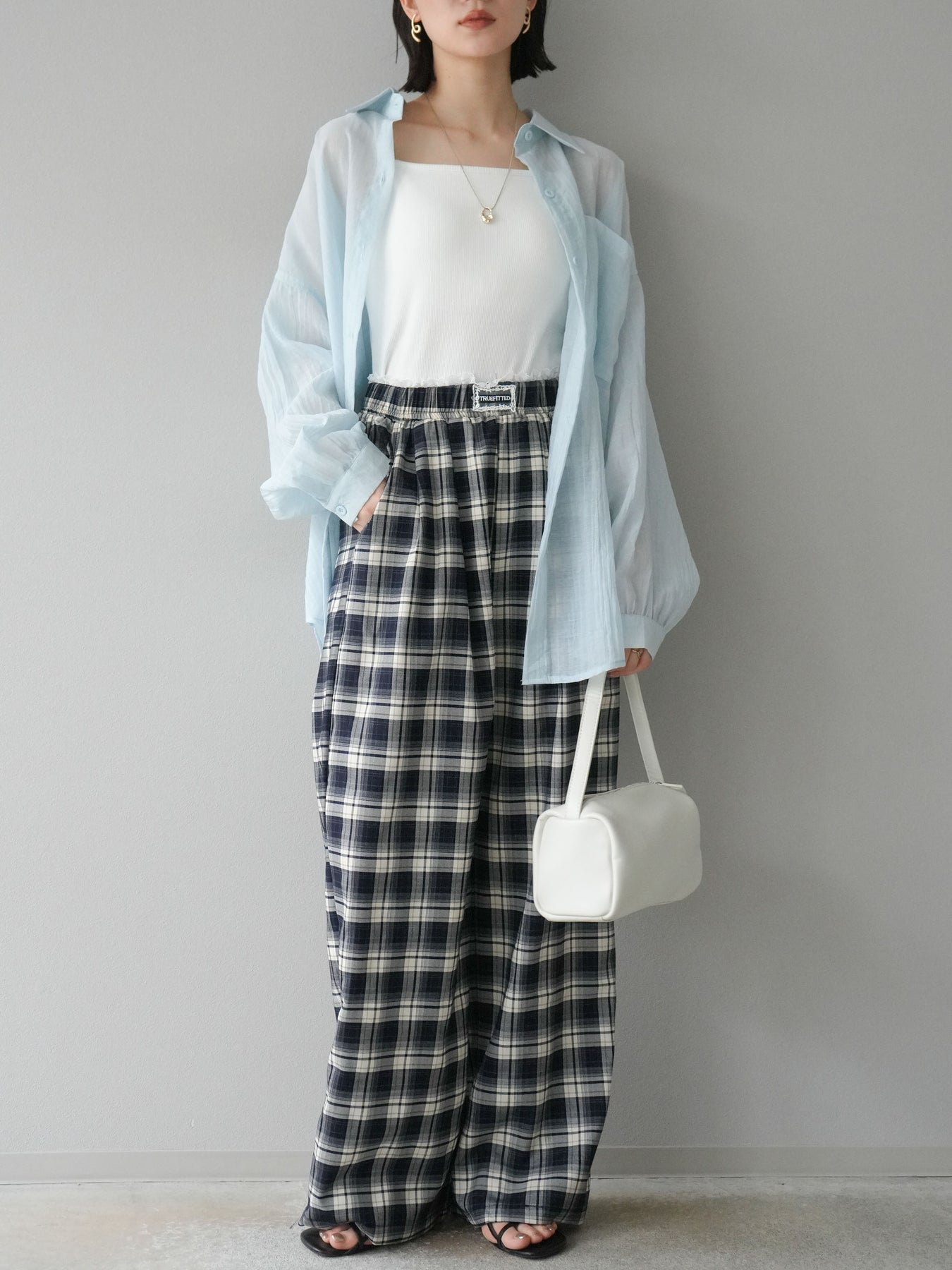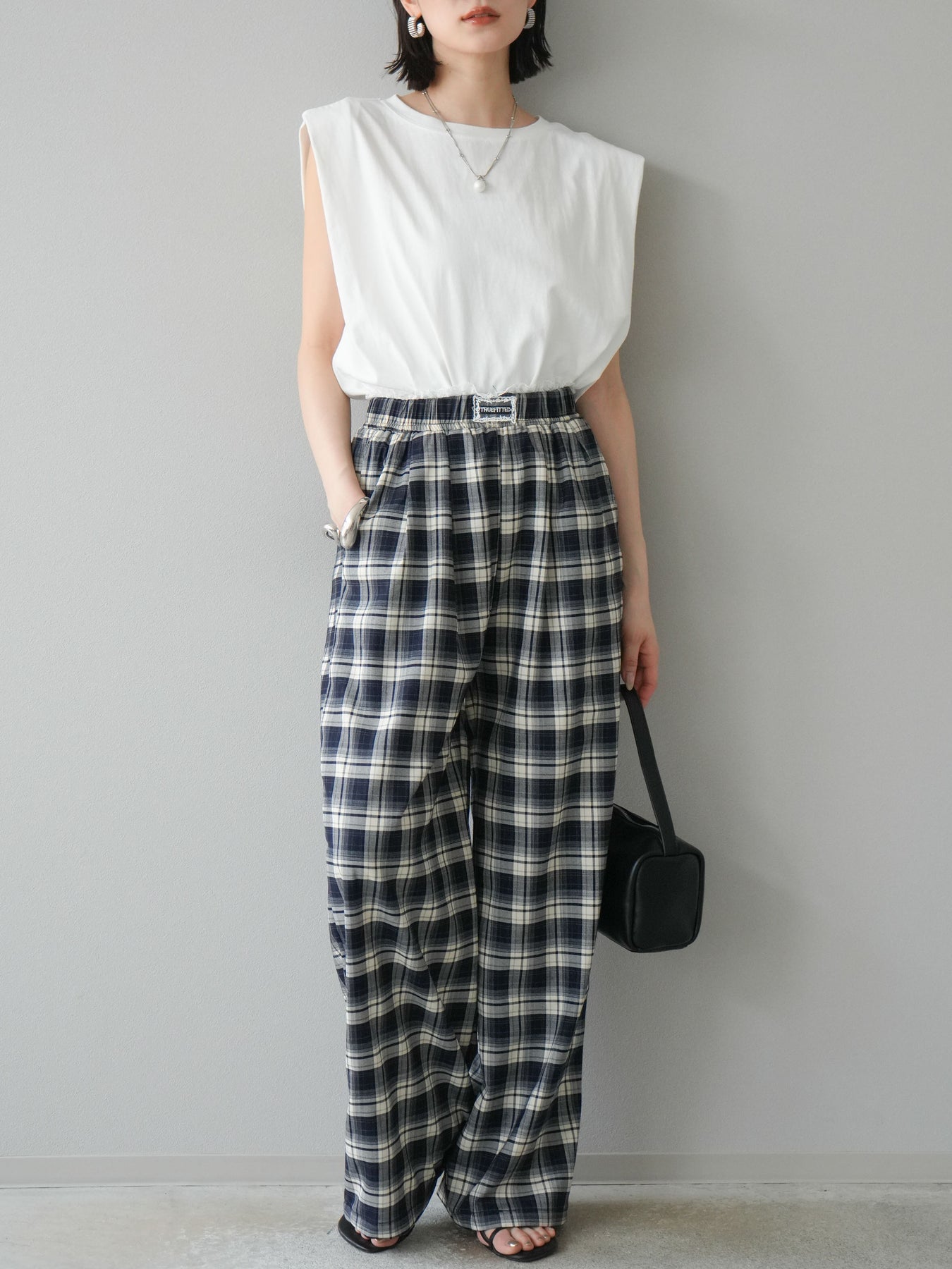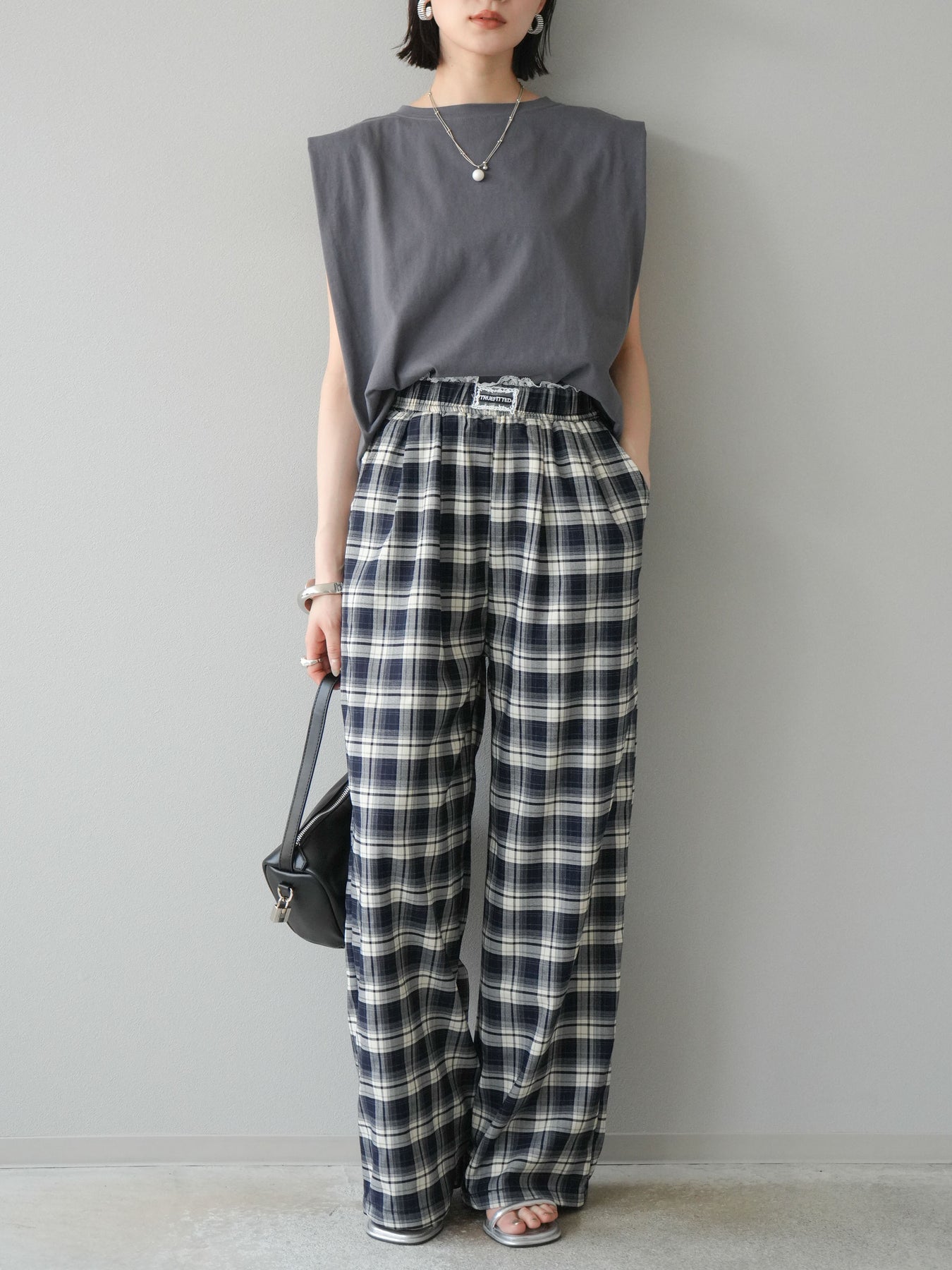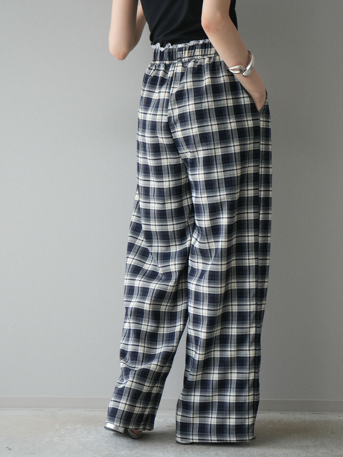 寬褲設計獨特優雅,格紋圖案上層疊蕾絲。鬆緊帶帶來寬鬆的版型。蕾絲細節增添一絲魅力,即使搭配簡約上衣也能打造出令人印象深刻的風格。這款單品以休閒風格展現優雅氣質。 *除下裝及吊帶背心(內衣)外,所有商品均為標準配置,不含內衣。