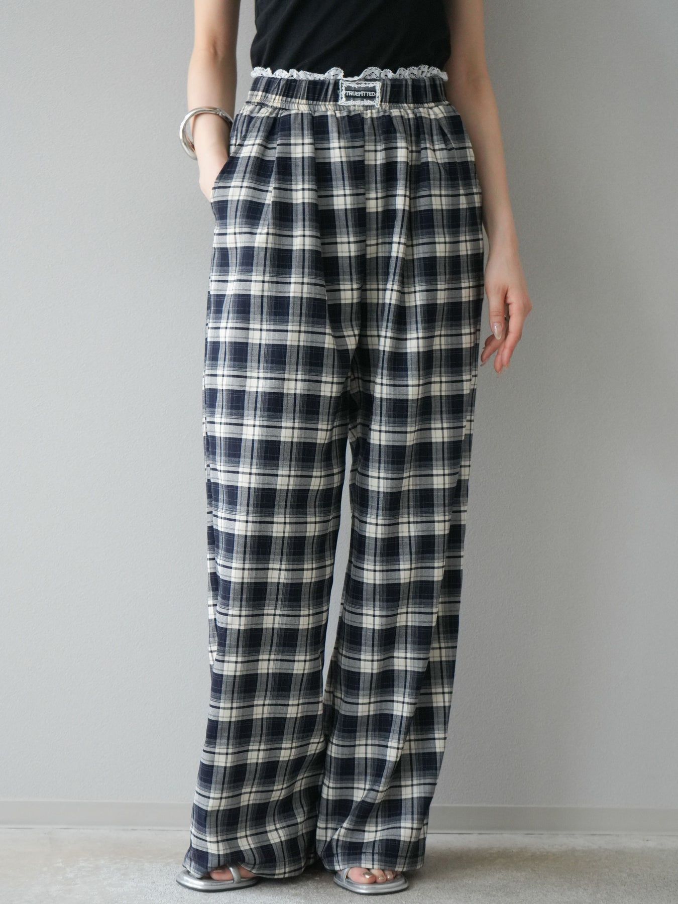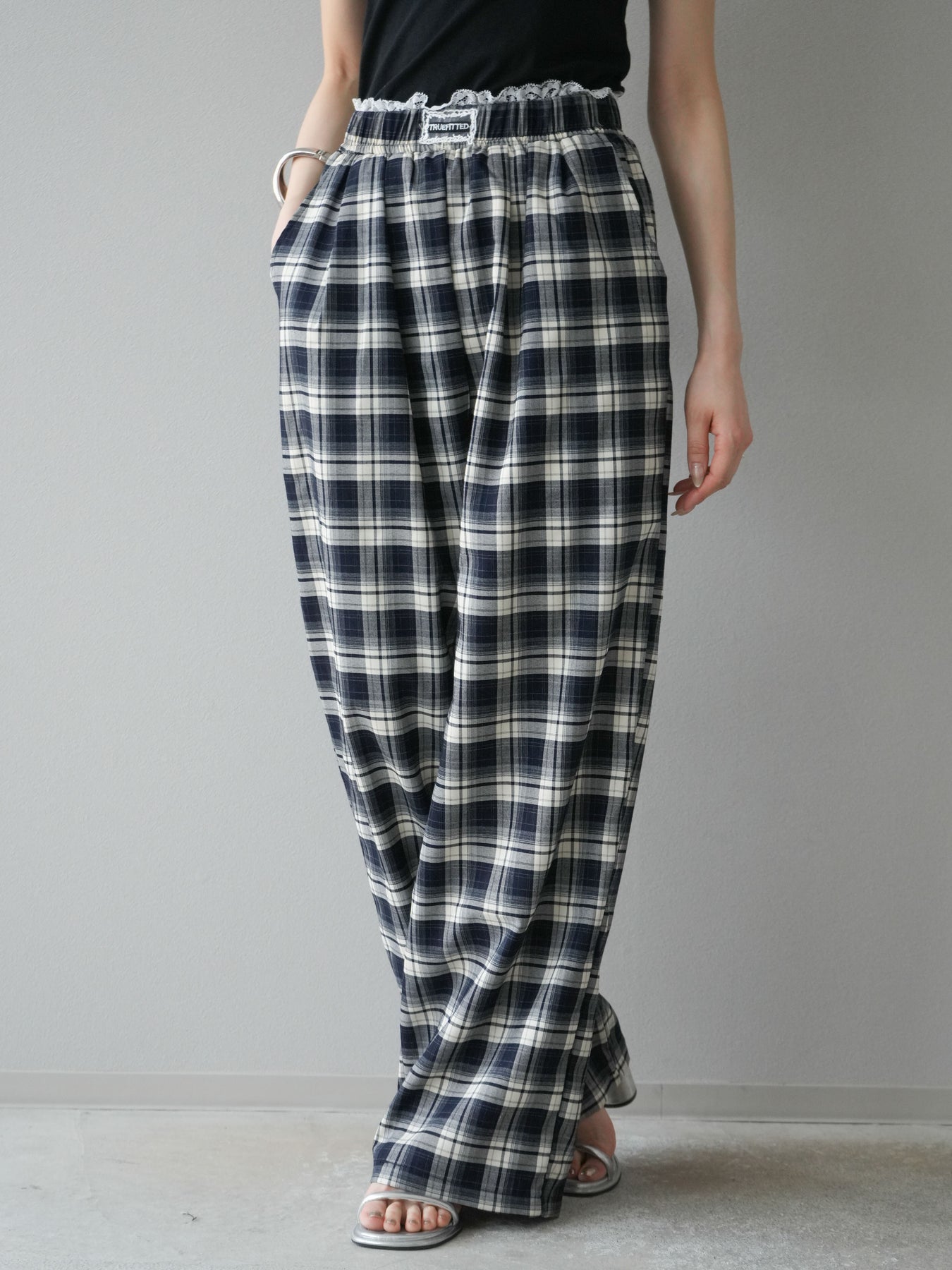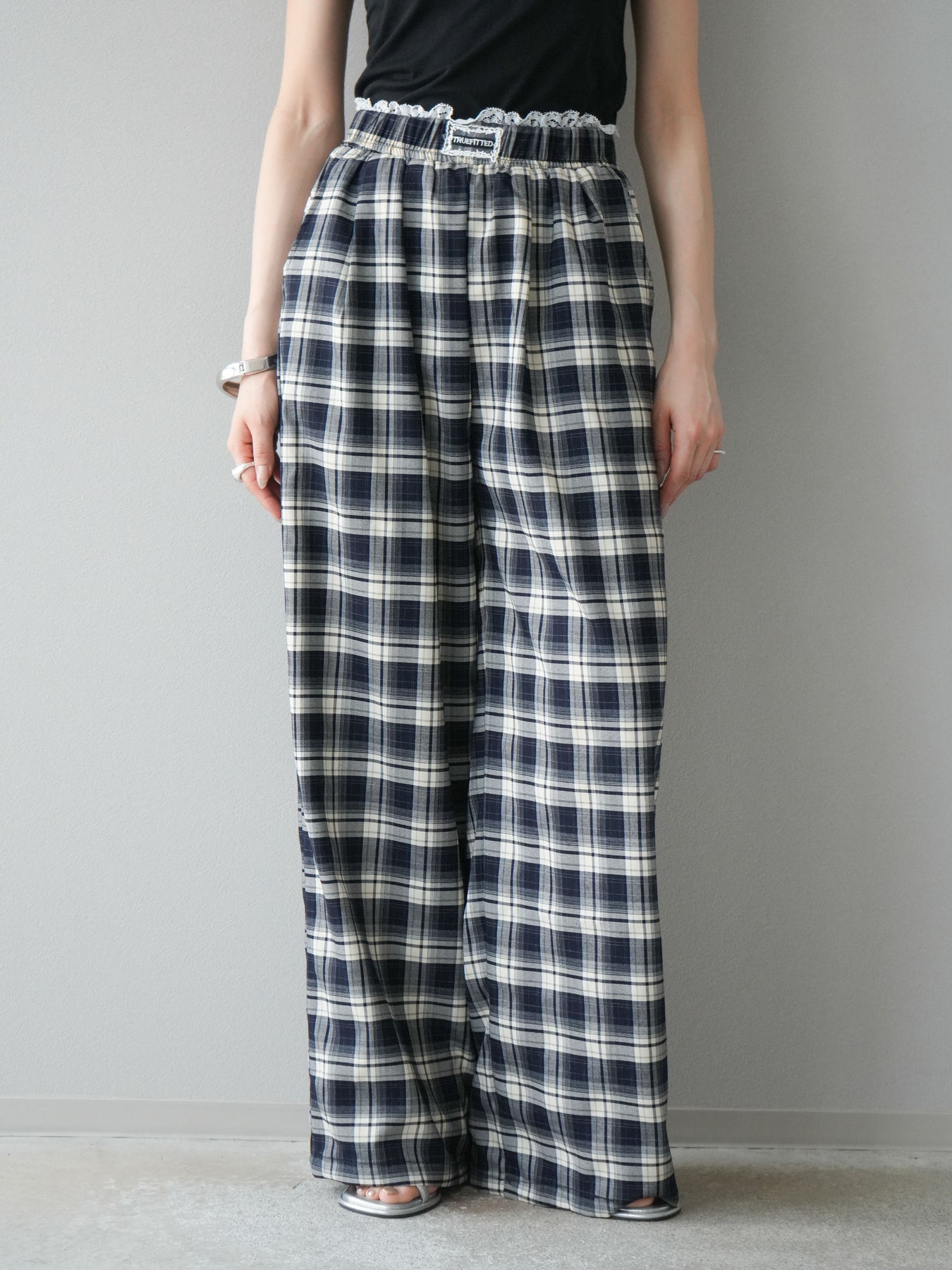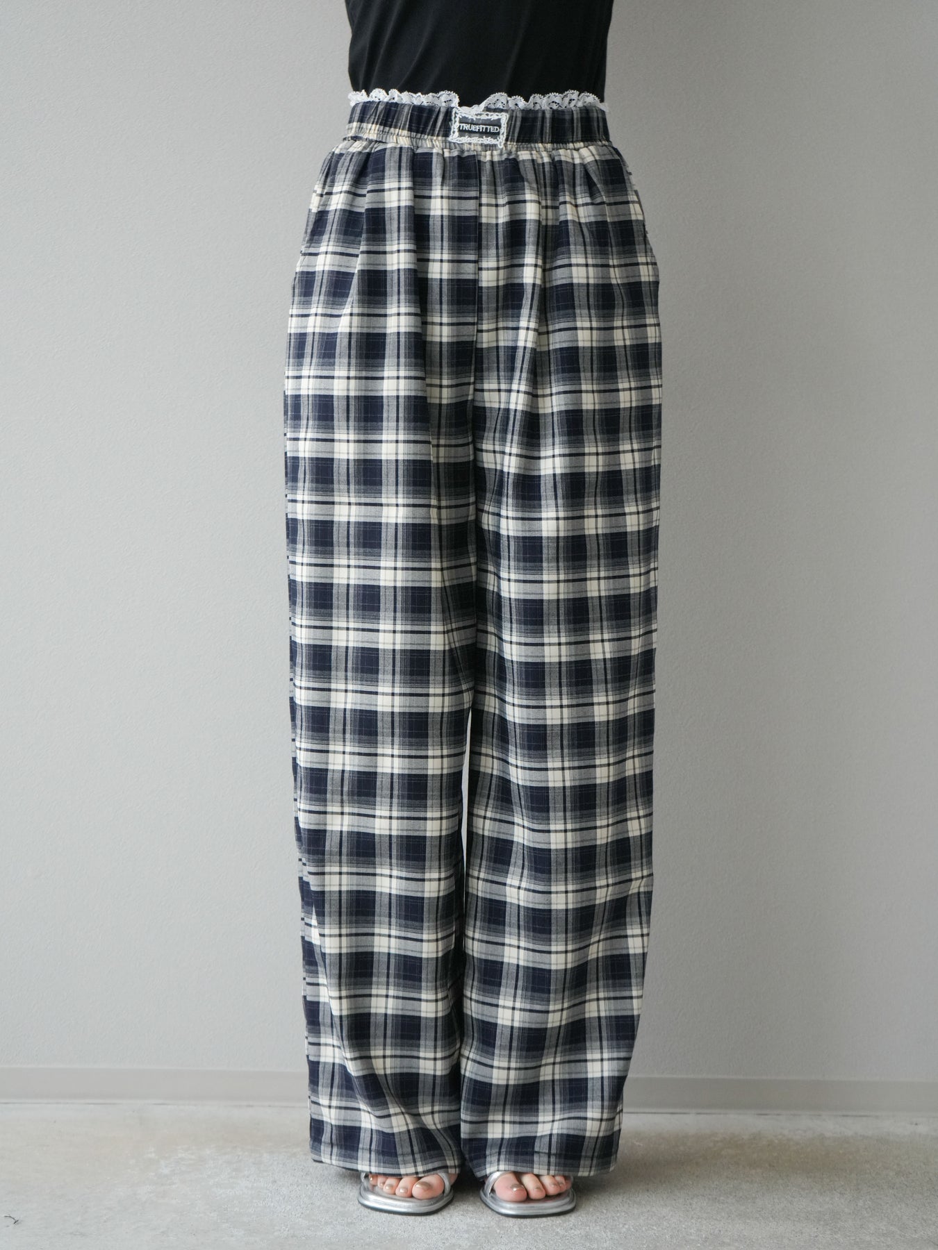 【預購】蕾絲層疊格紋寬褲/藏青色