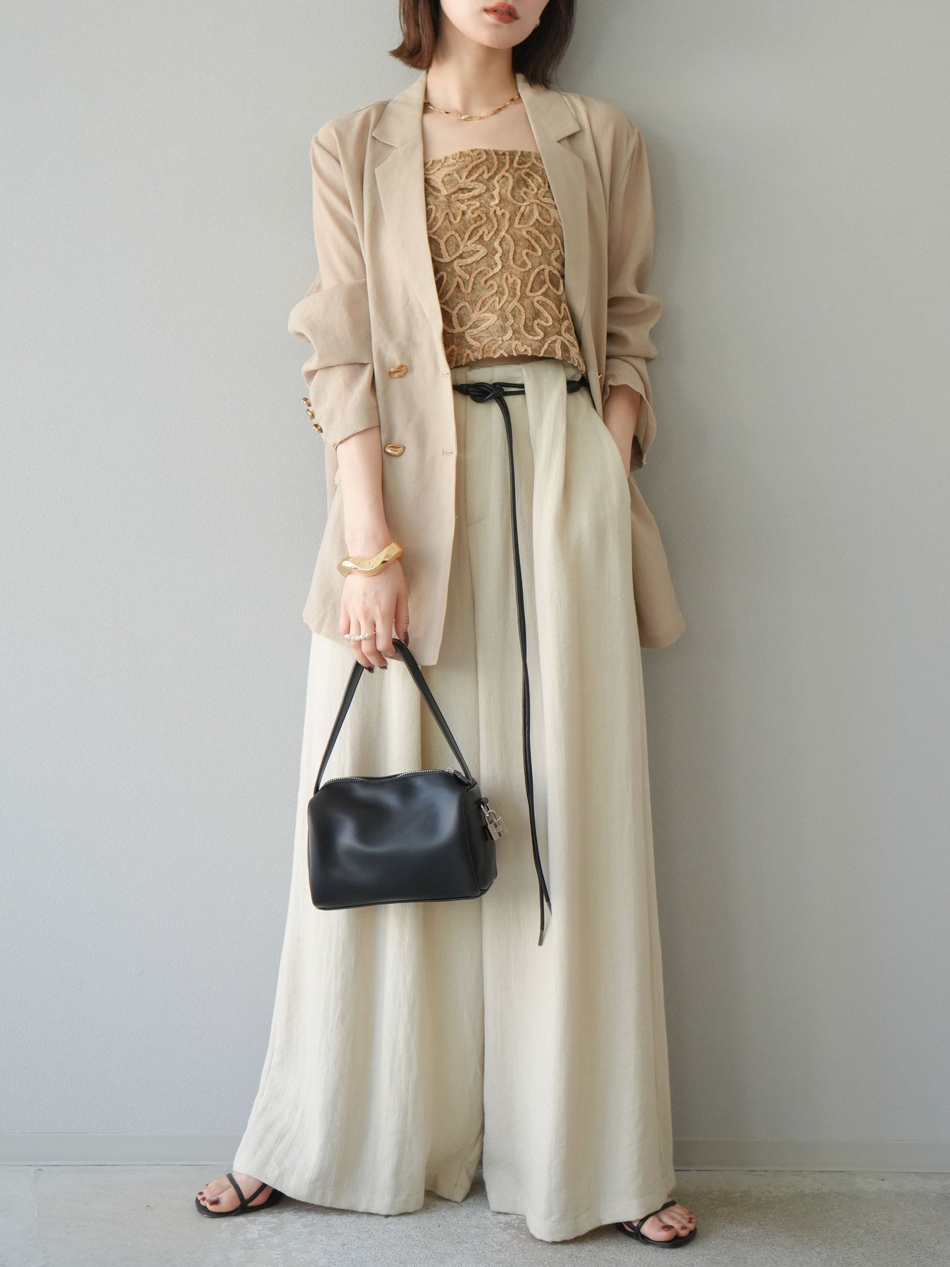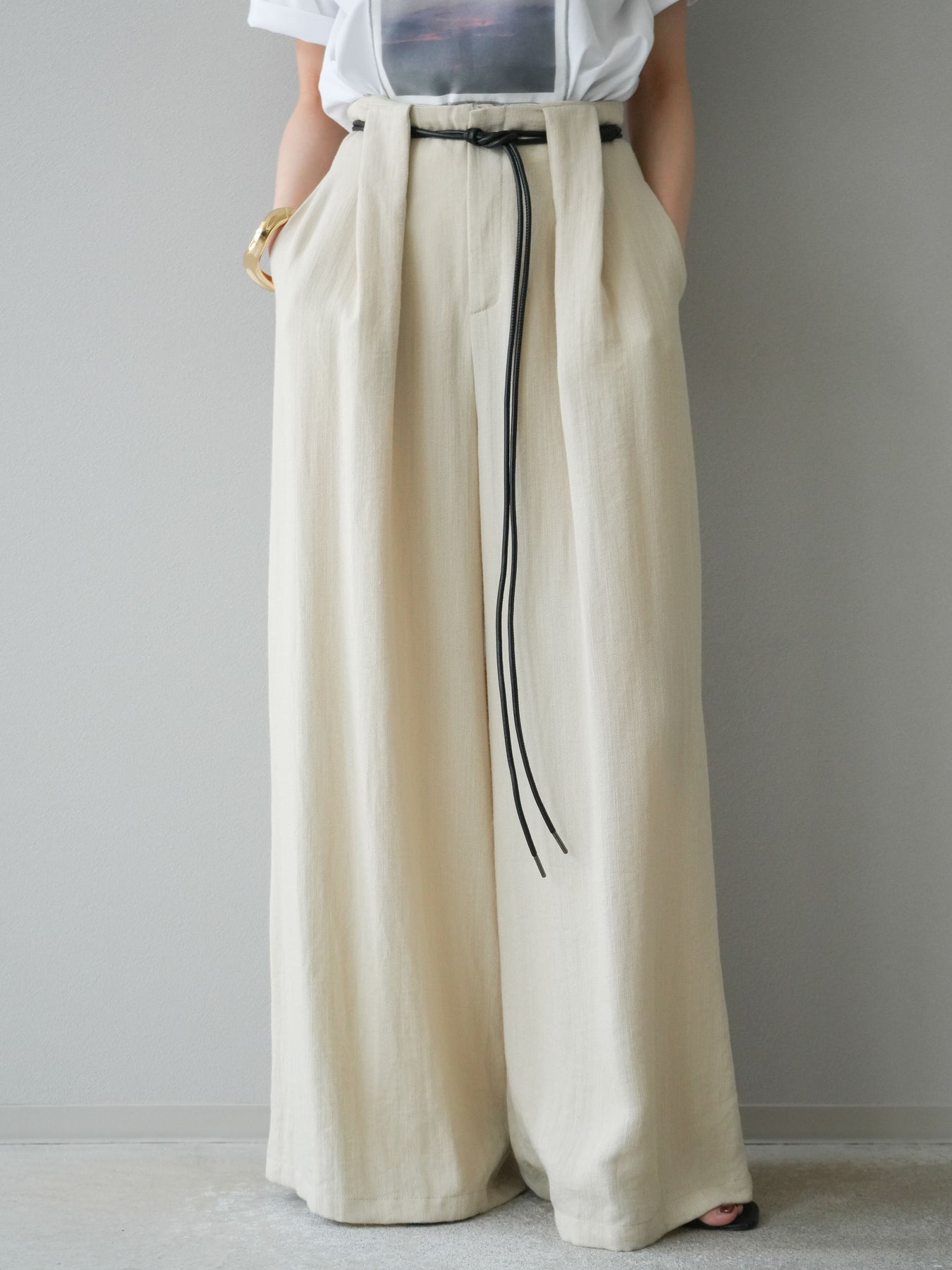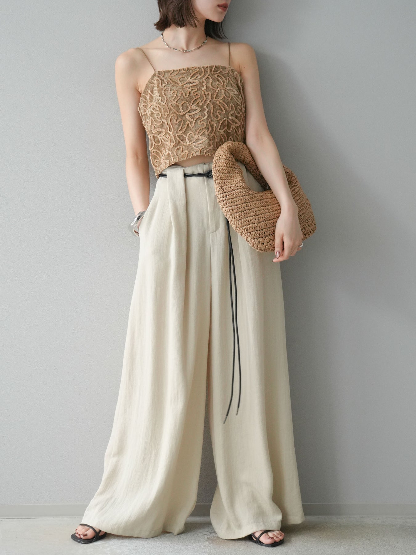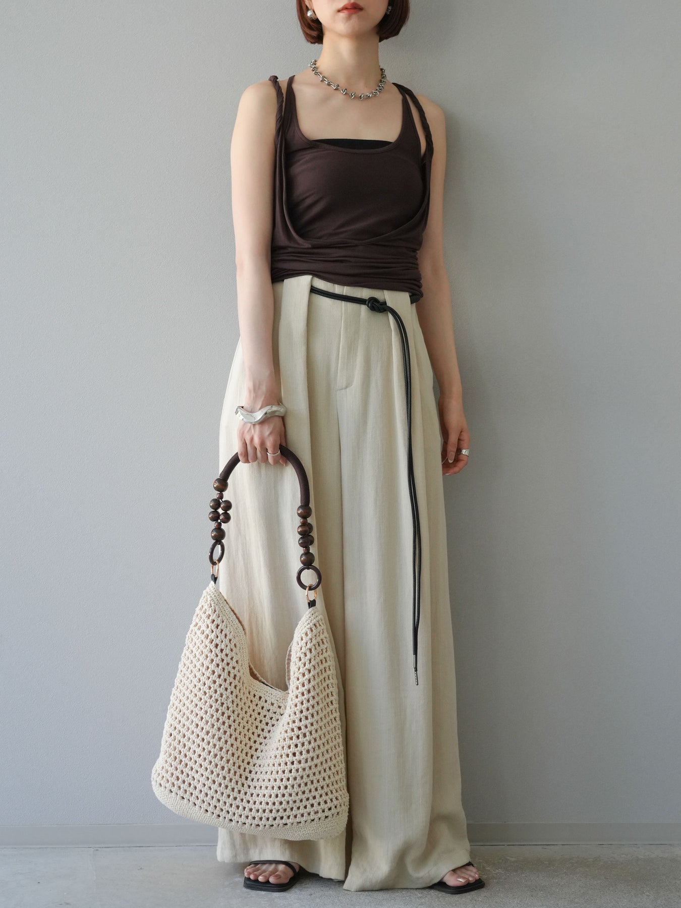寬鬆褲採用亞麻材質製成,質感自然。順滑的觸感和輕盈的垂墜感帶來舒適感,與季節氛圍相得益彰。附贈的繩帶設計更添亮點,腰部裝飾也提升了整體造型。搭配束腰上衣,展現優雅氣質。