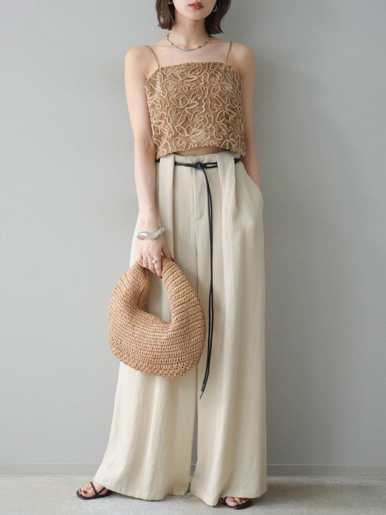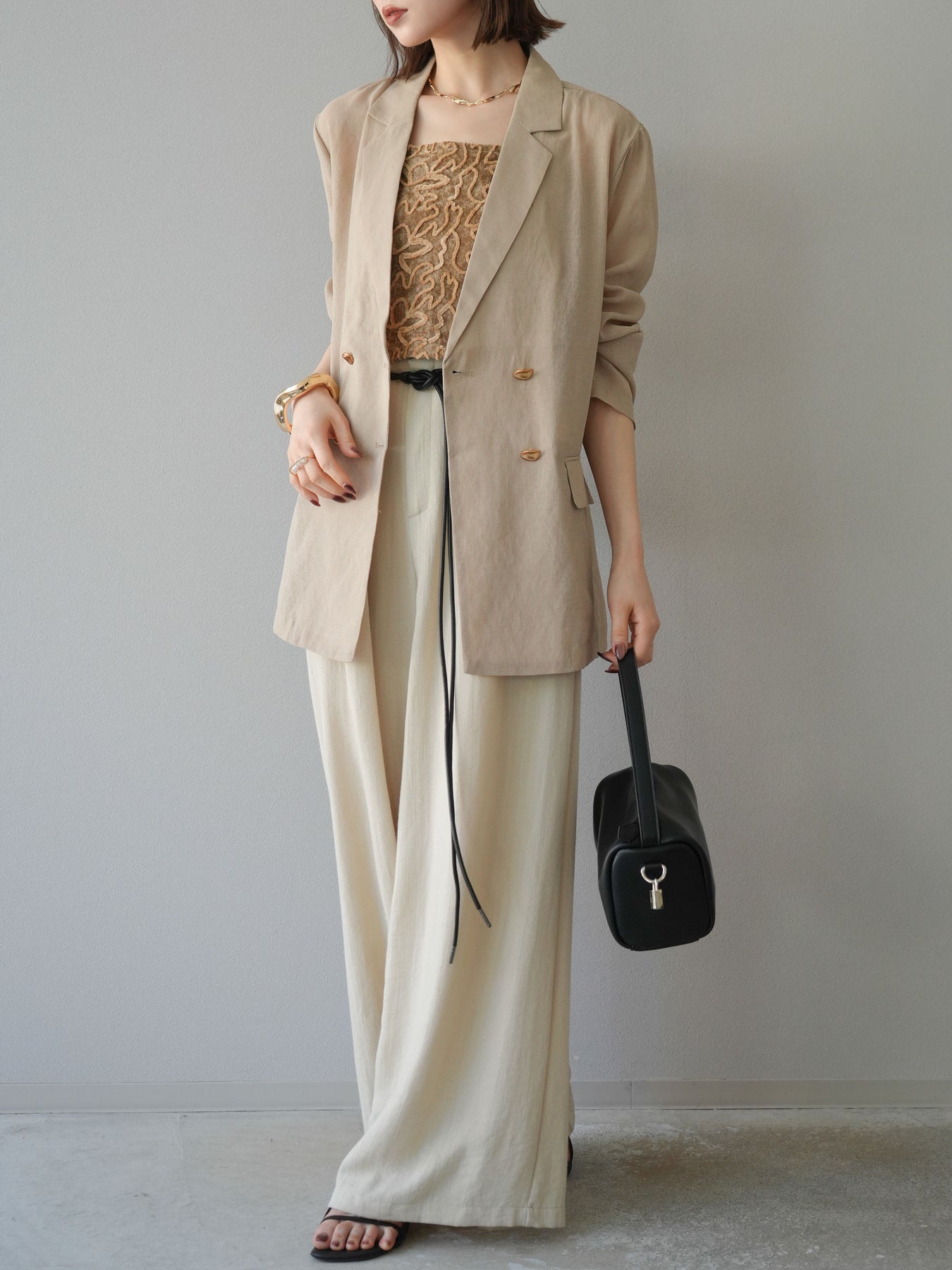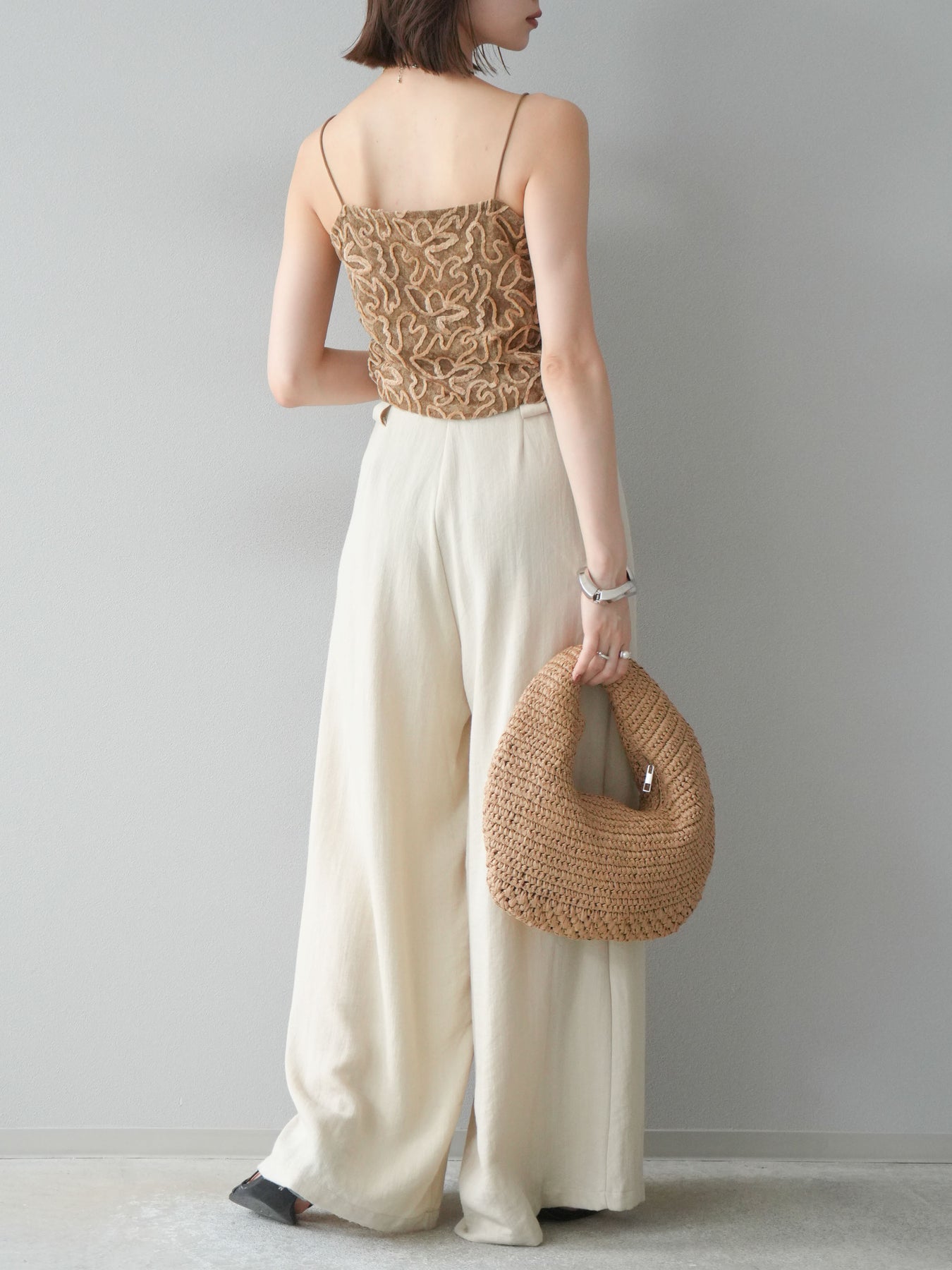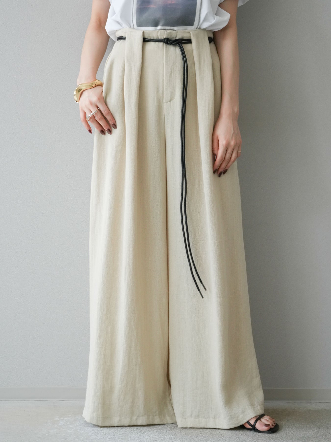 寬鬆褲採用亞麻材質製成,質感自然。順滑的觸感和輕盈的垂墜感帶來舒適感,與季節氛圍相得益彰。附贈的繩帶設計更添亮點,腰部裝飾也提升了整體造型。搭配束腰上衣,展現優雅氣質。