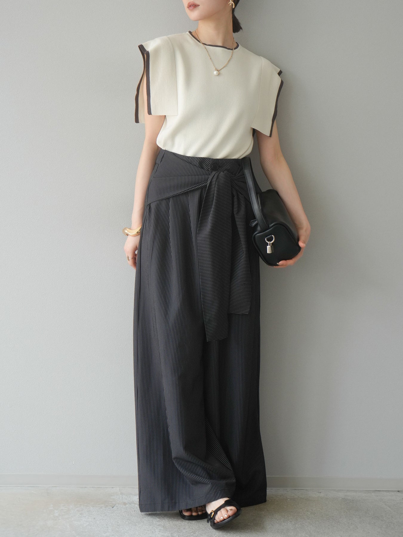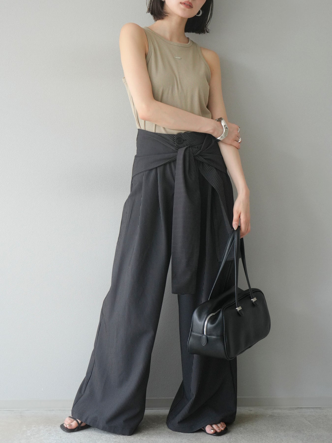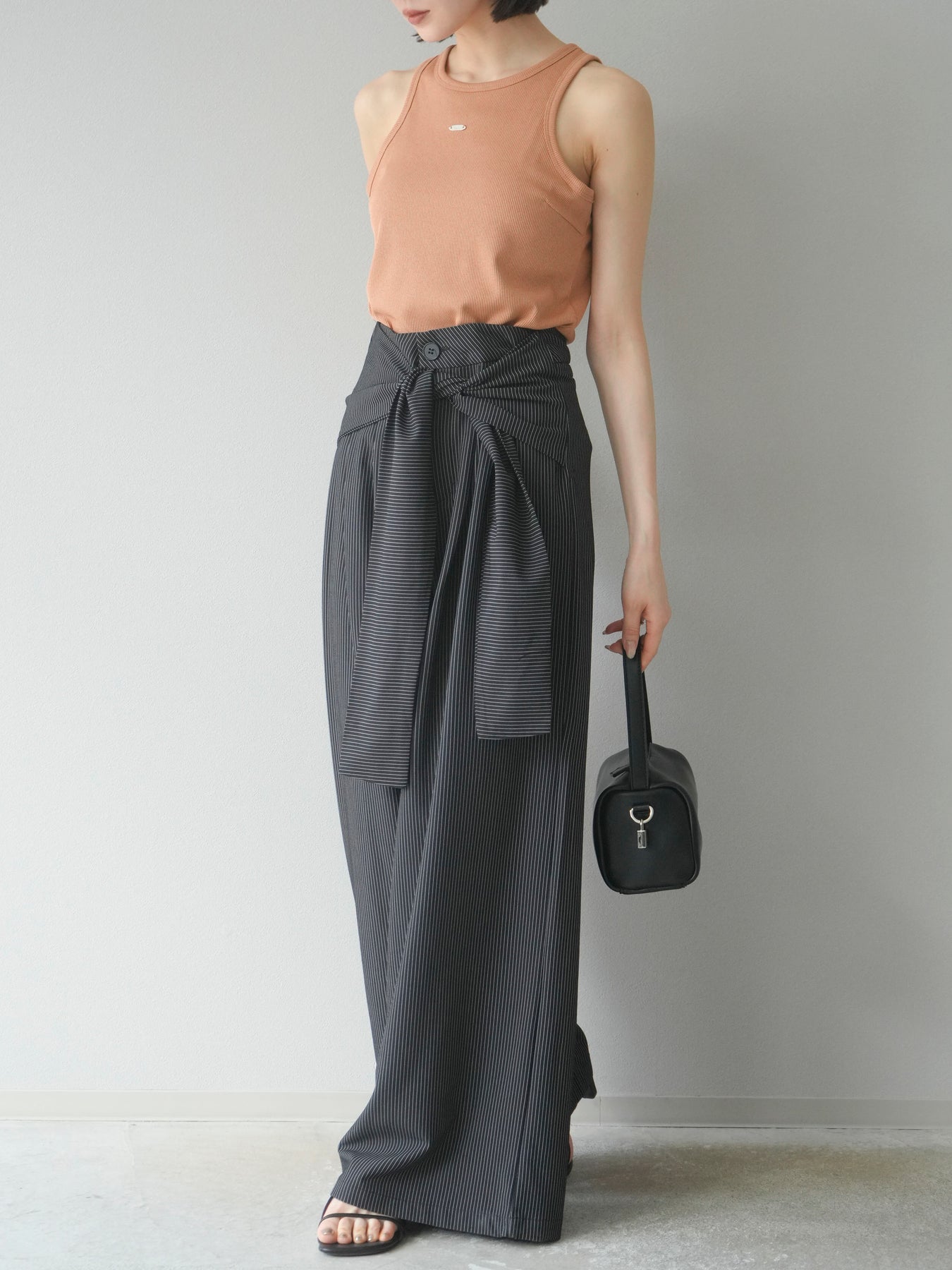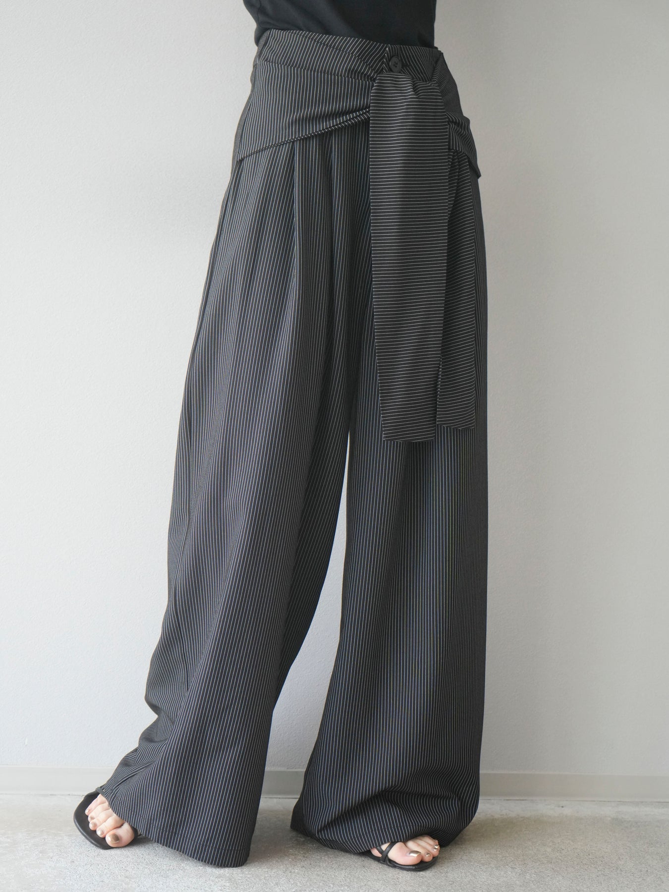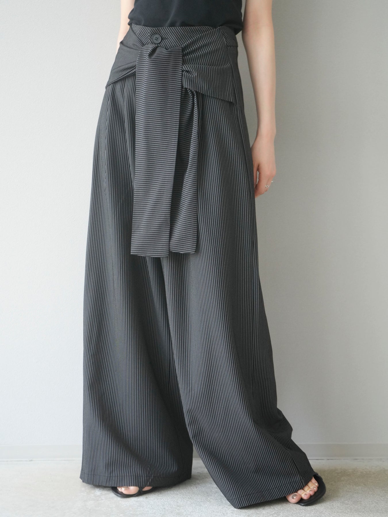 【預購】條紋裹腰闊腿褲/黑色