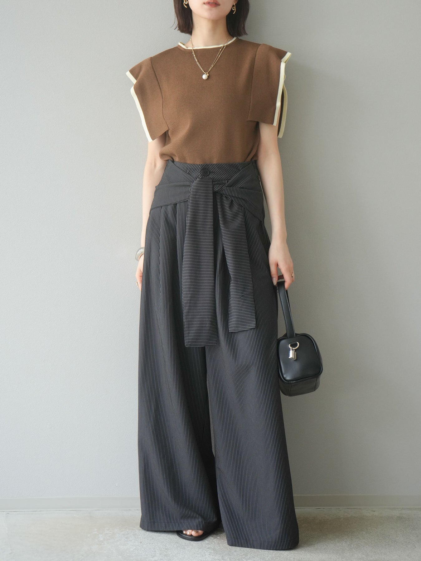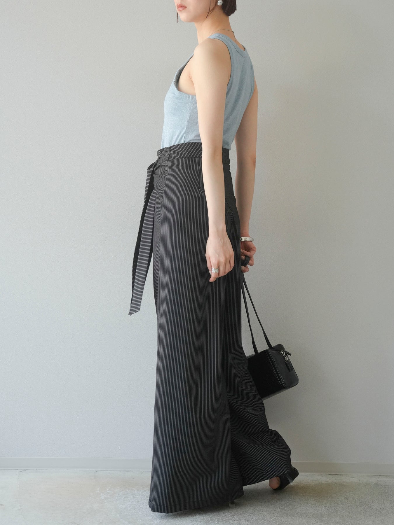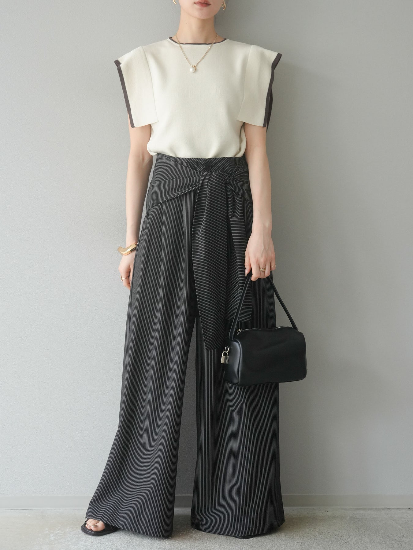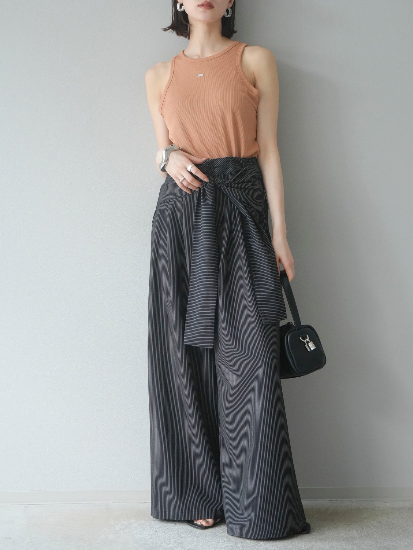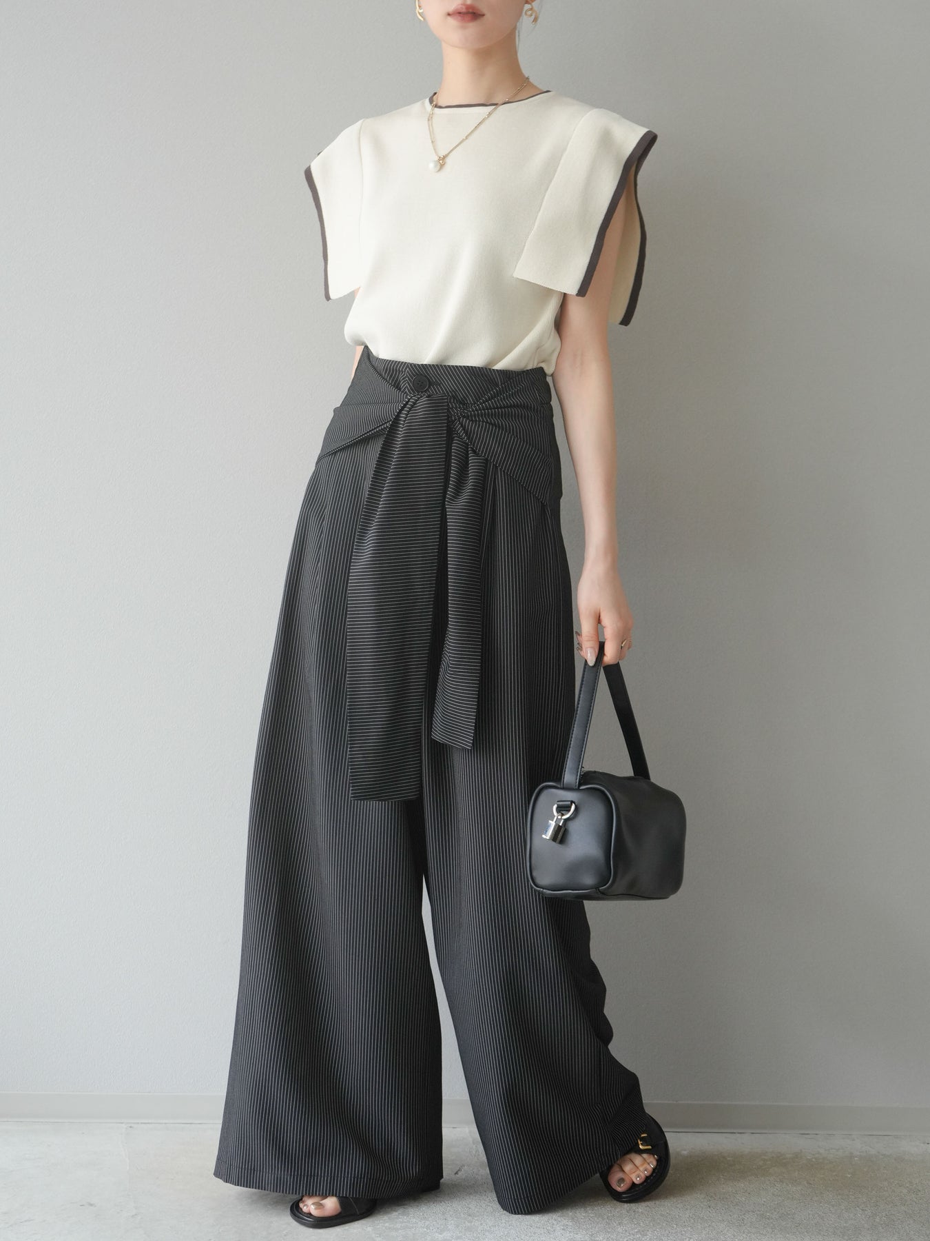 【預購】條紋裹腰闊腿褲/黑色