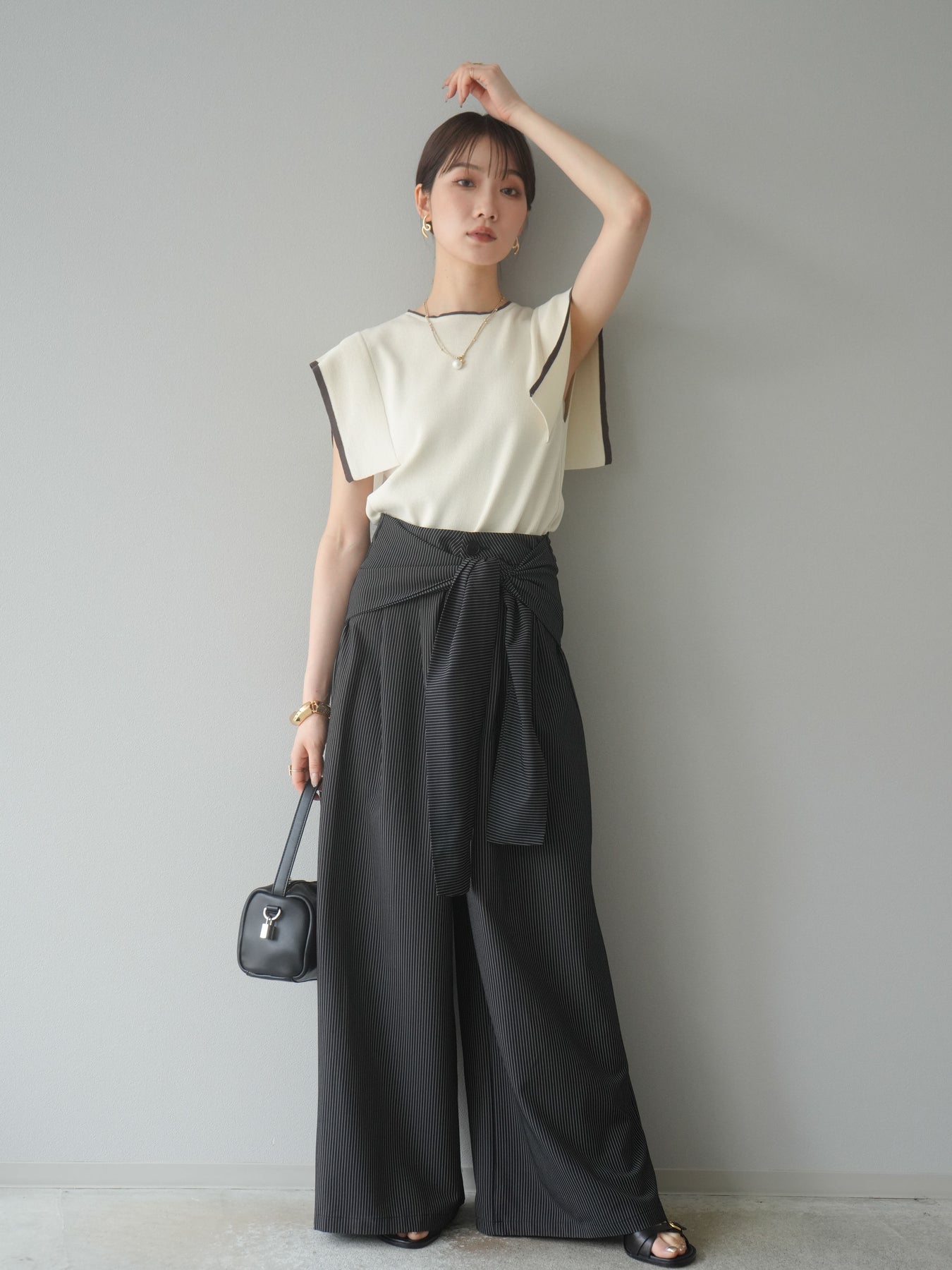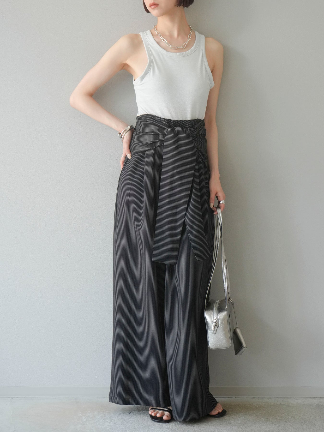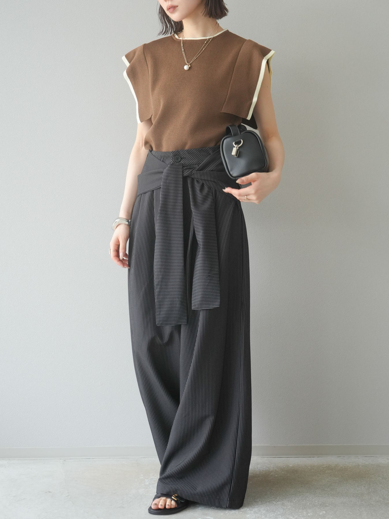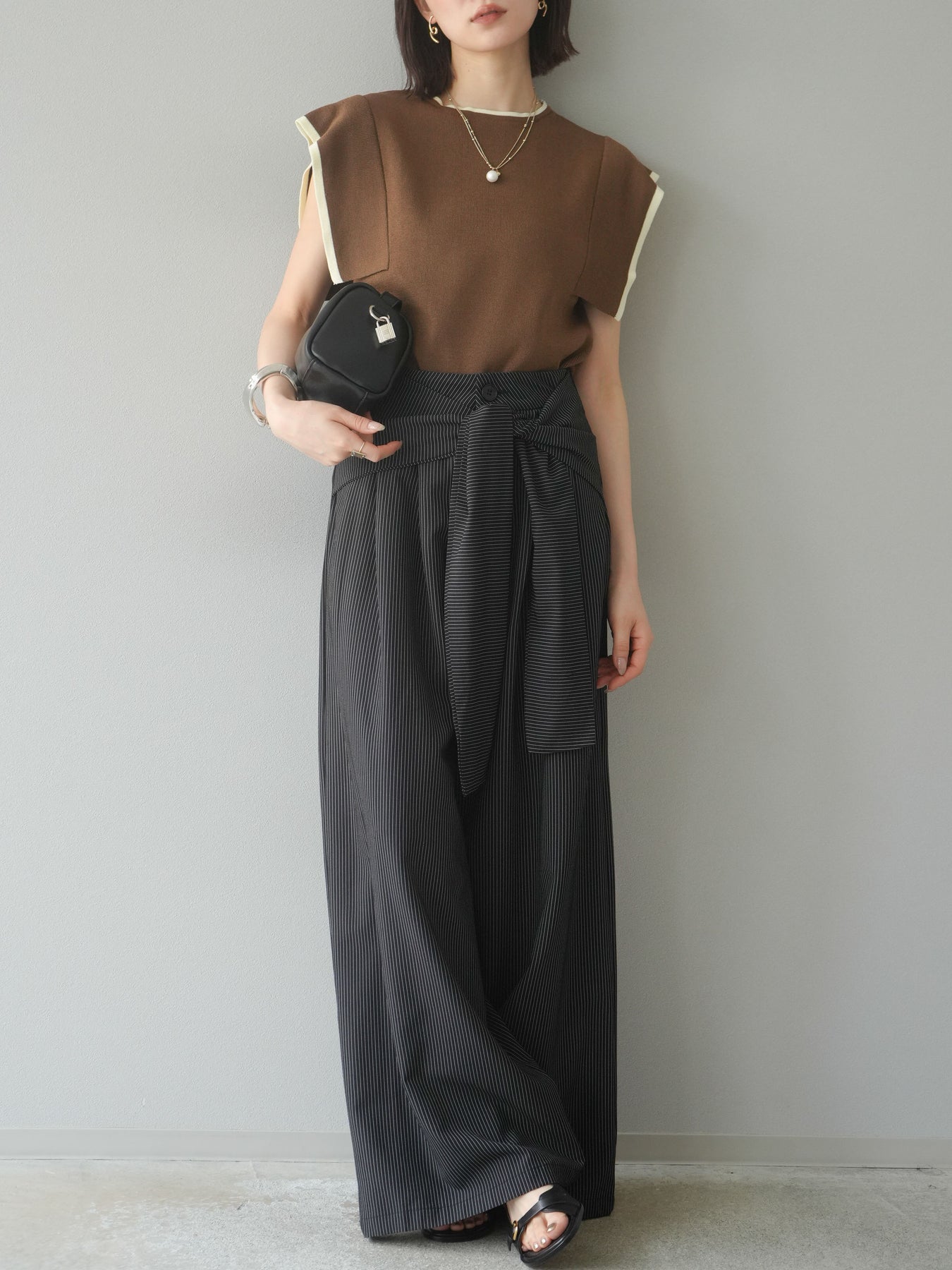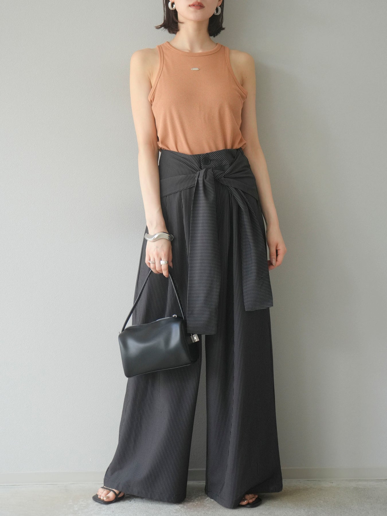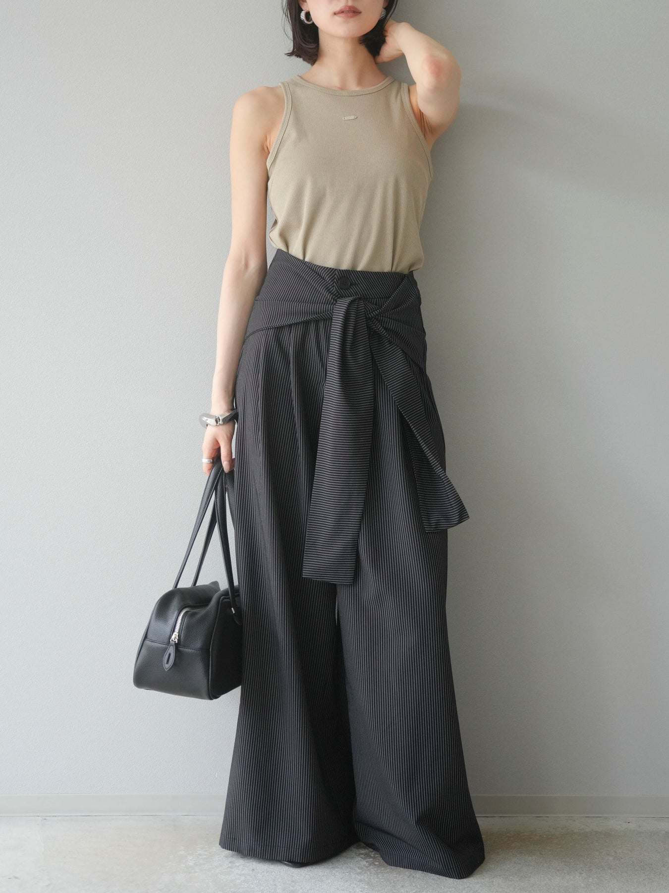 【預購】條紋裹腰闊腿褲/黑色