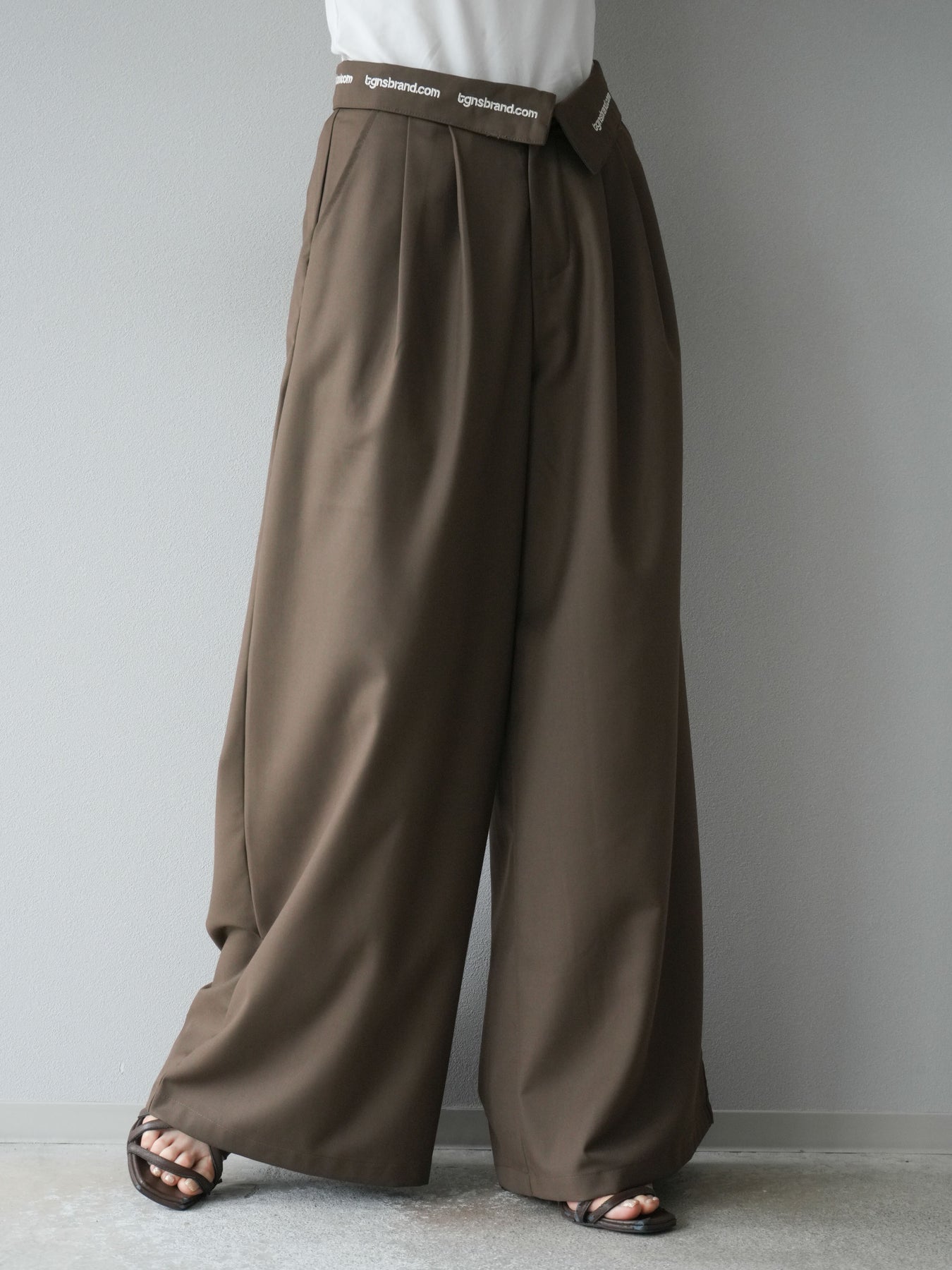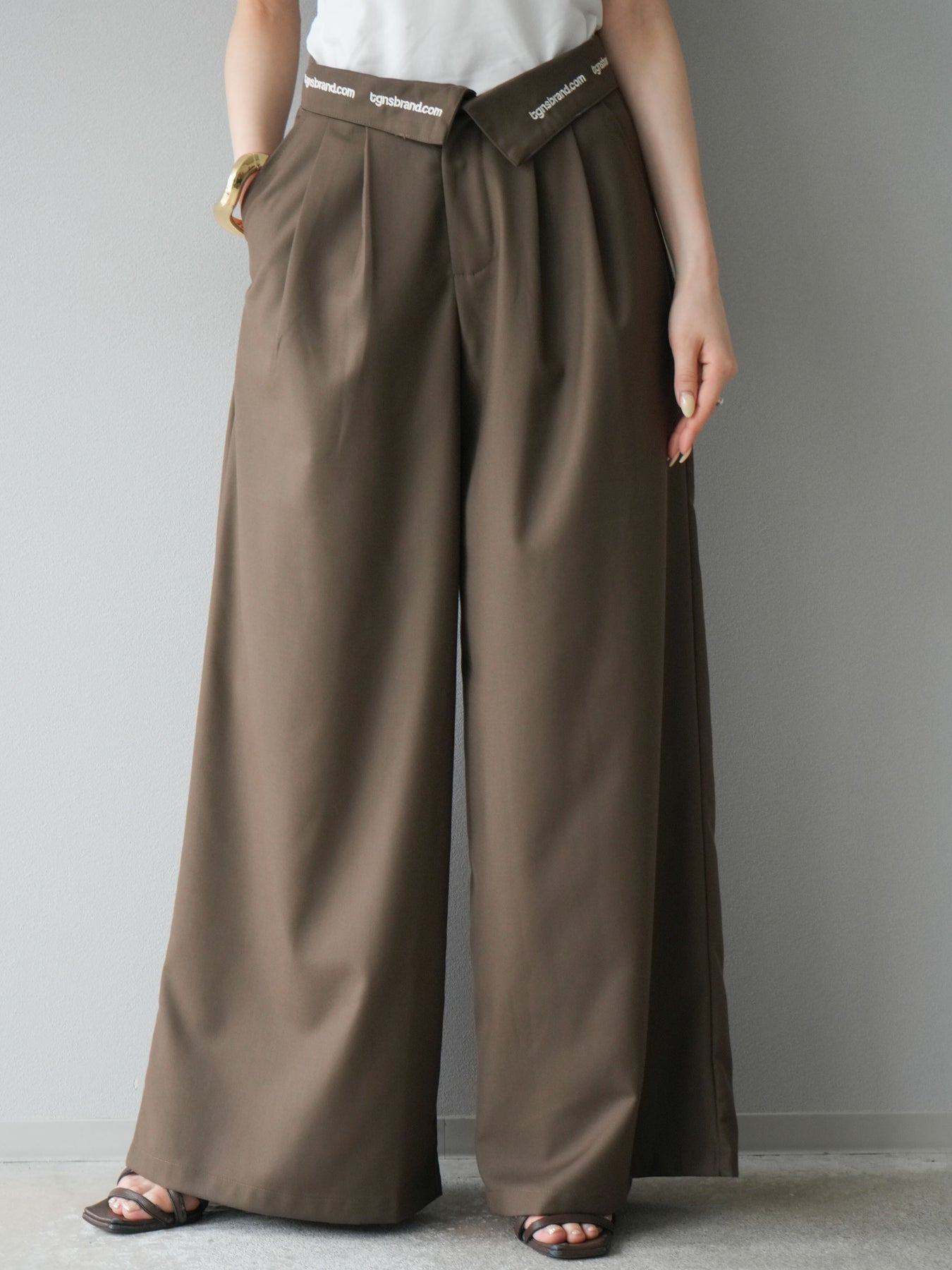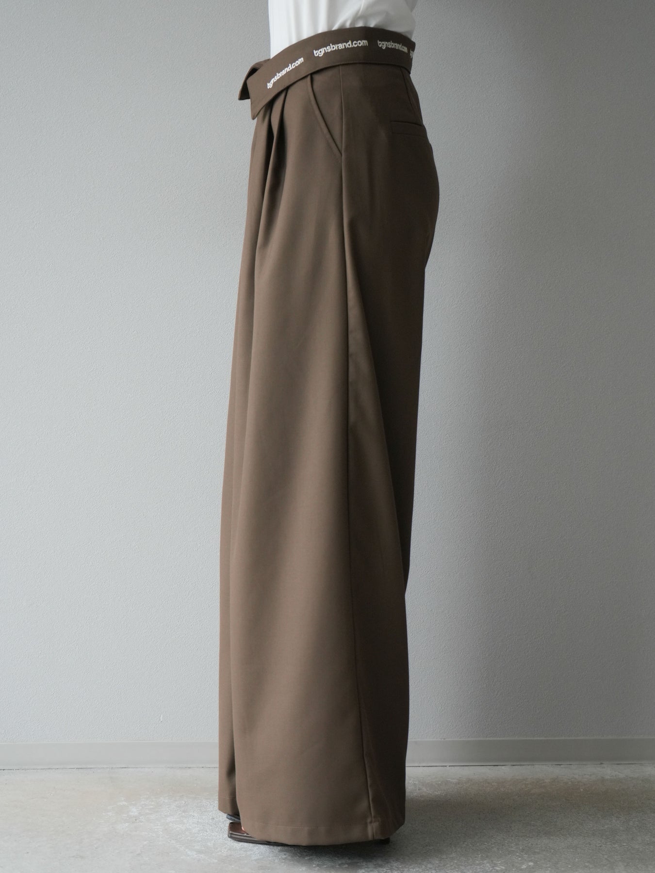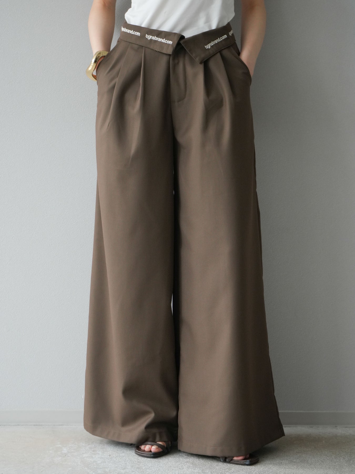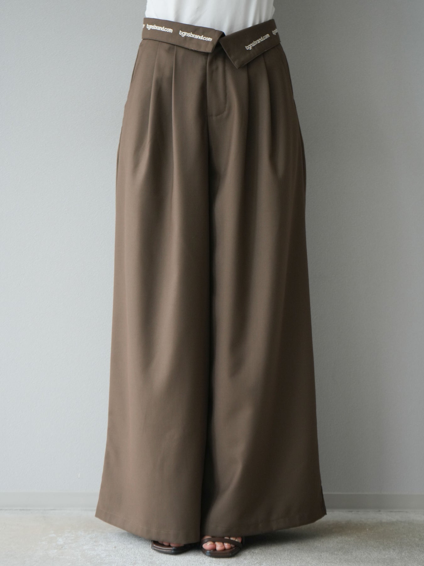 【預購】寬褲,捲腰,附logo褶/褐色