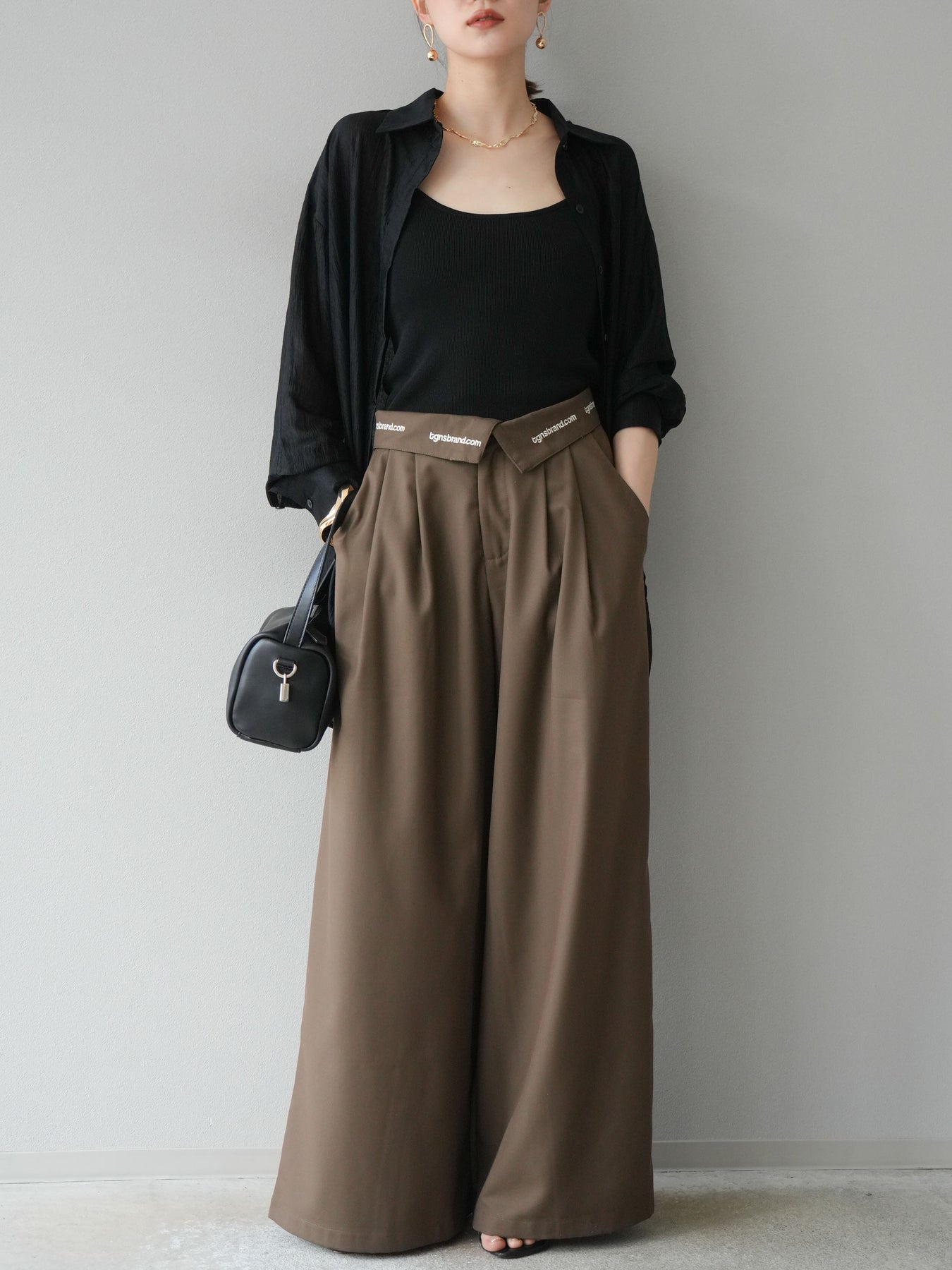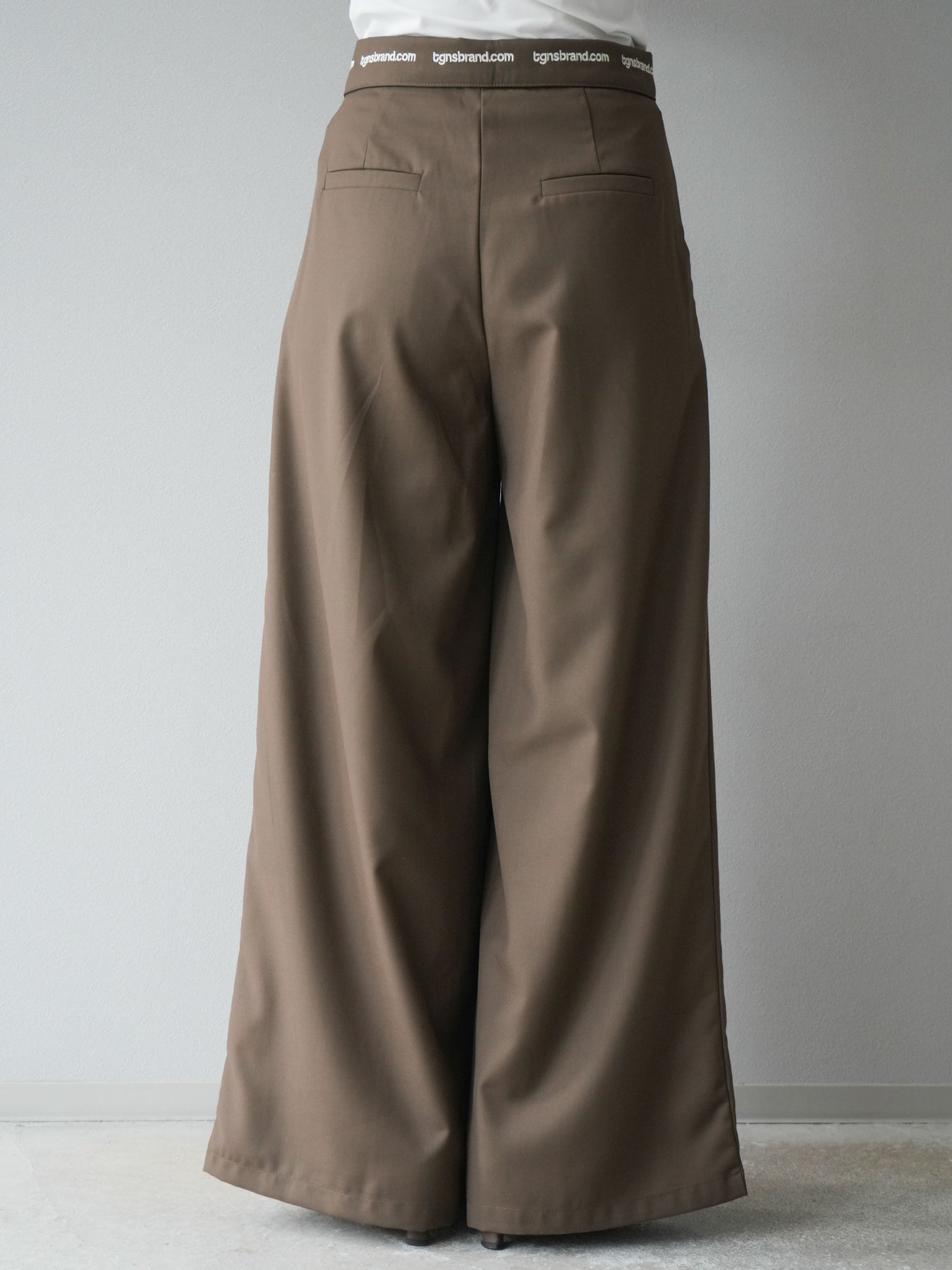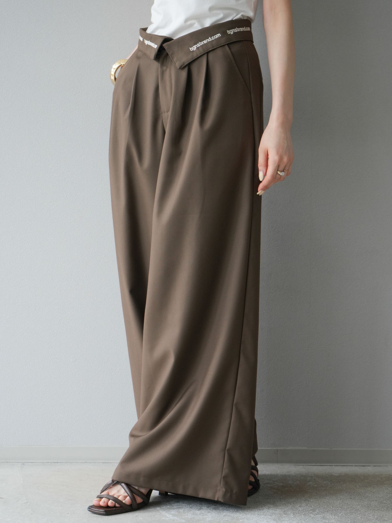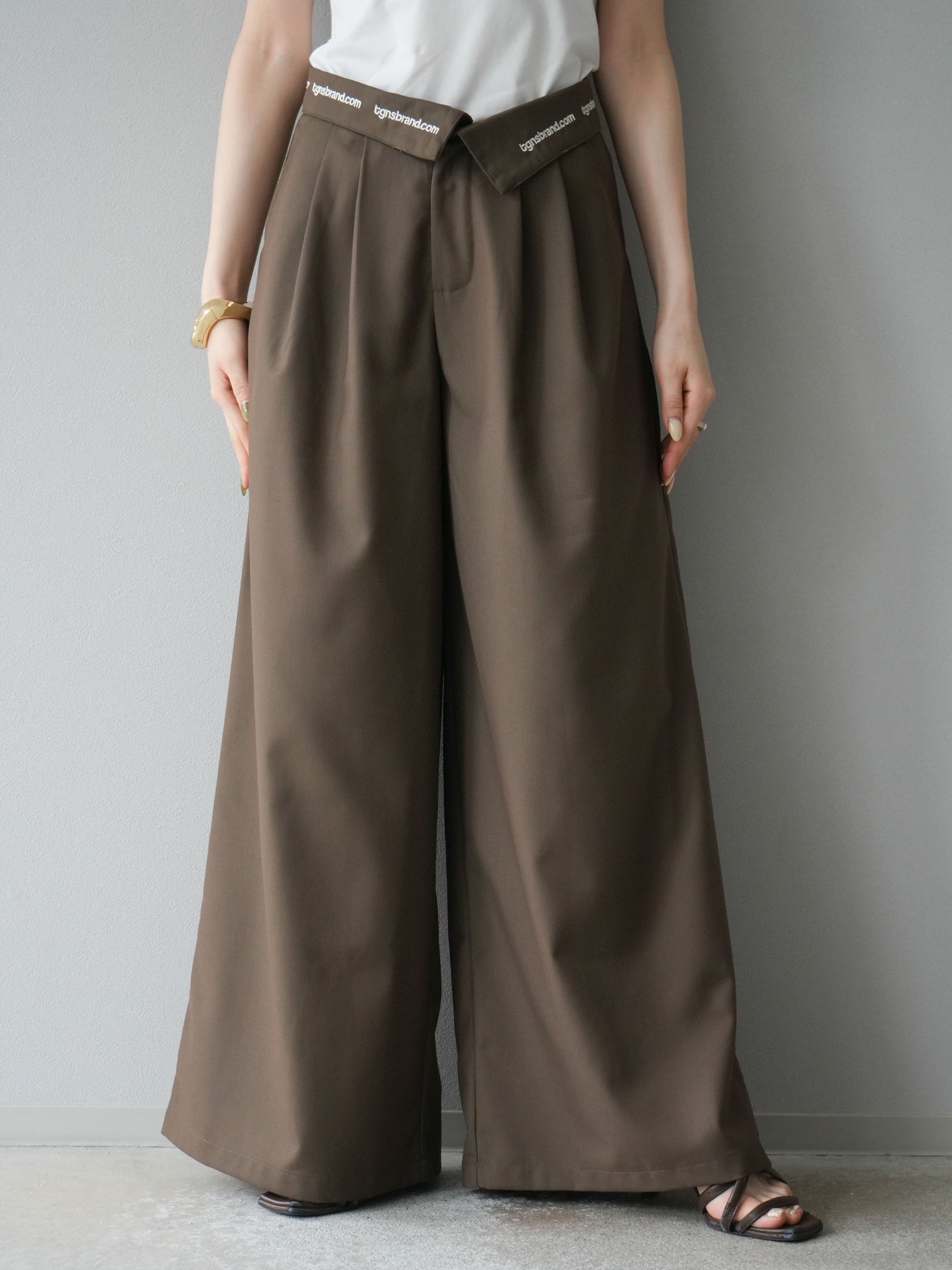 【預購】寬褲,捲腰,附logo褶/褐色