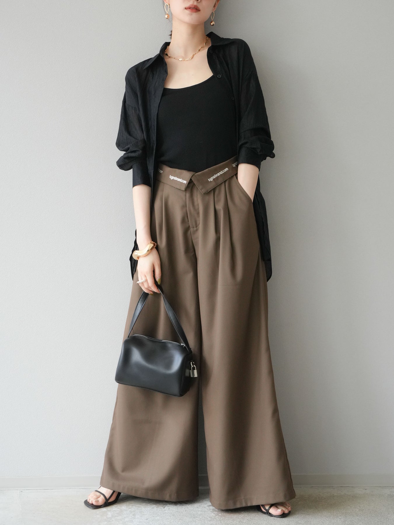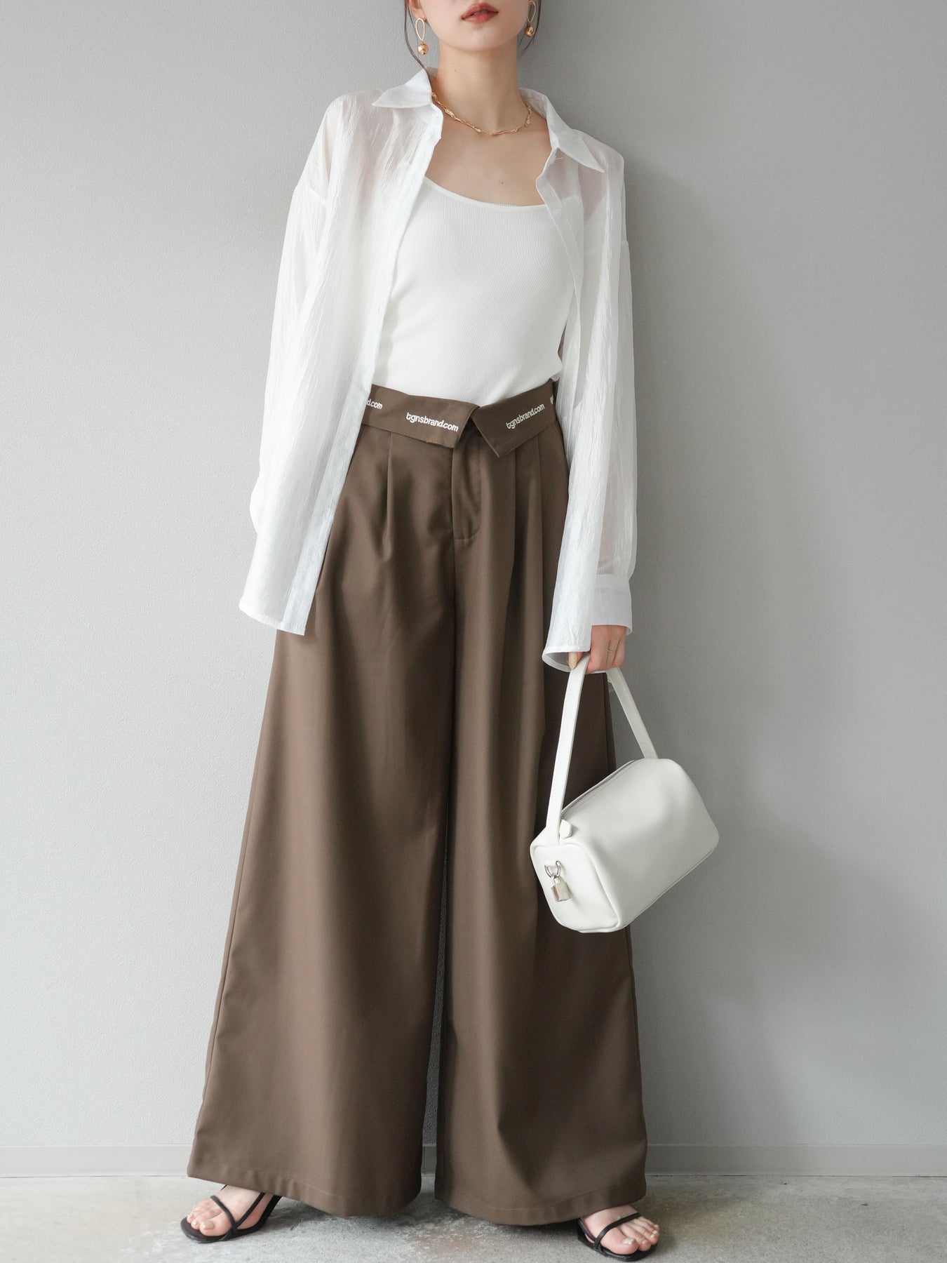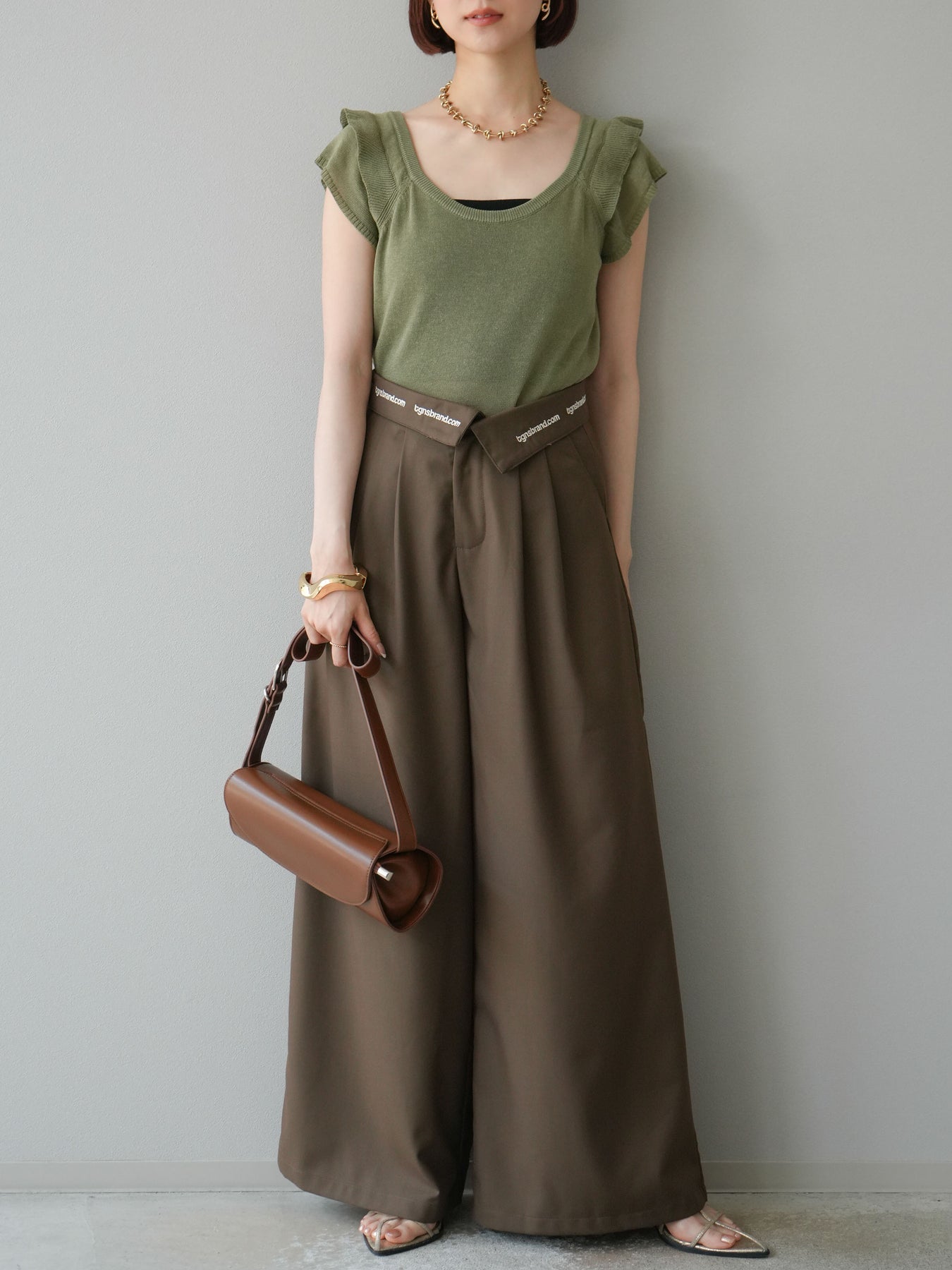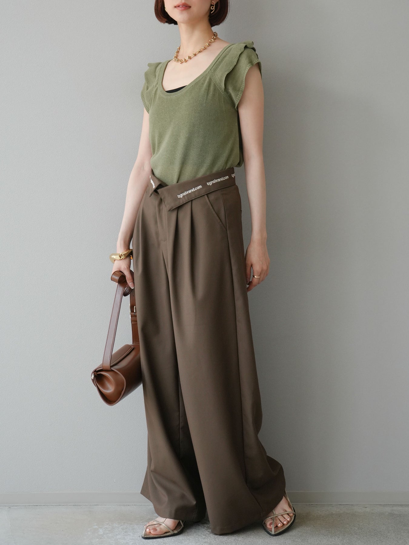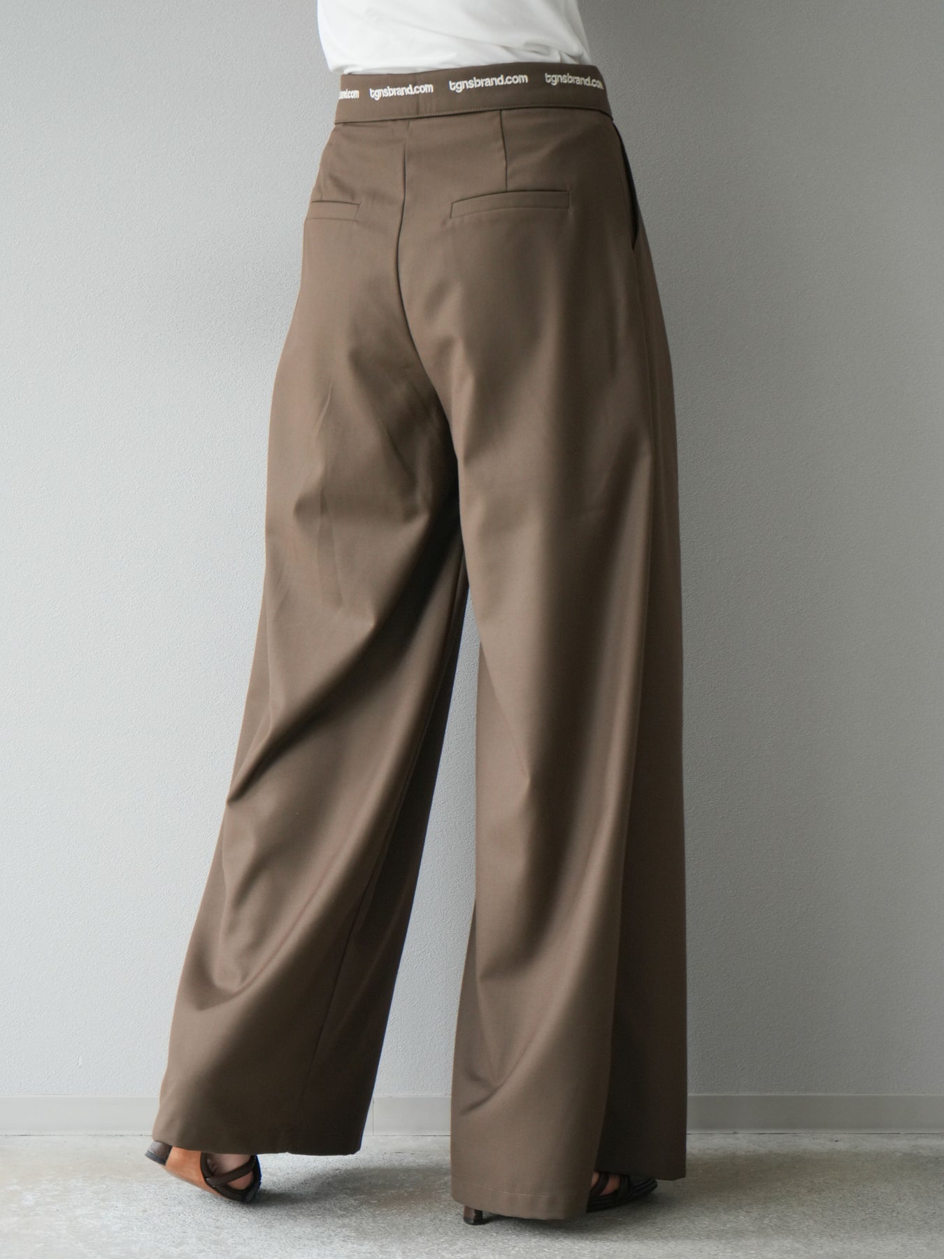 【預購】寬褲,捲腰,附logo褶/褐色
