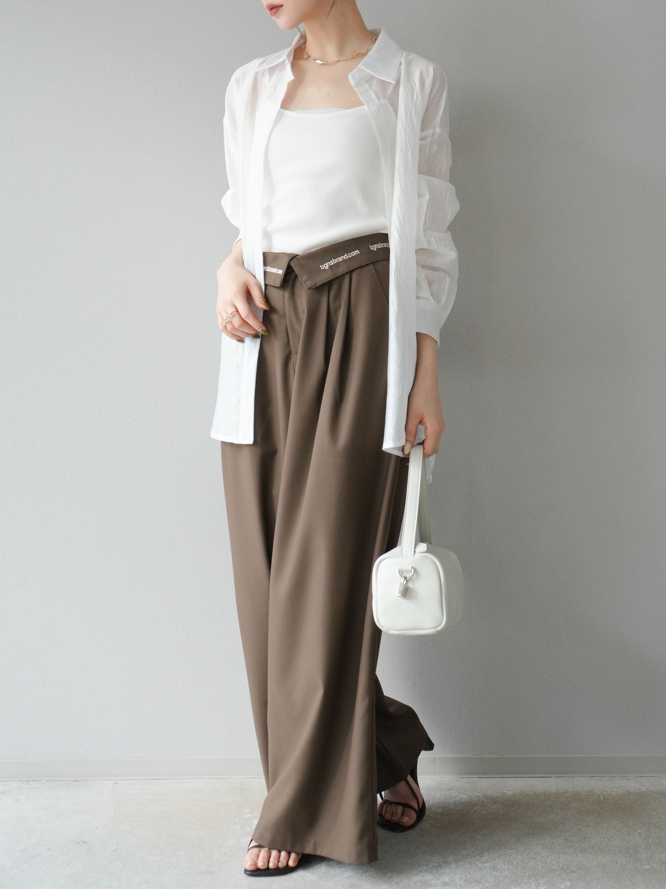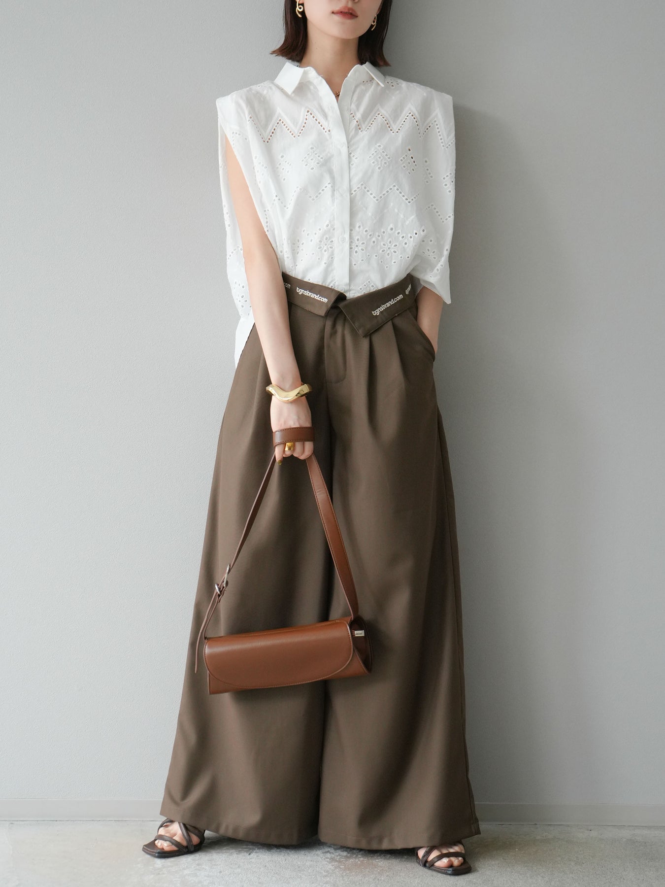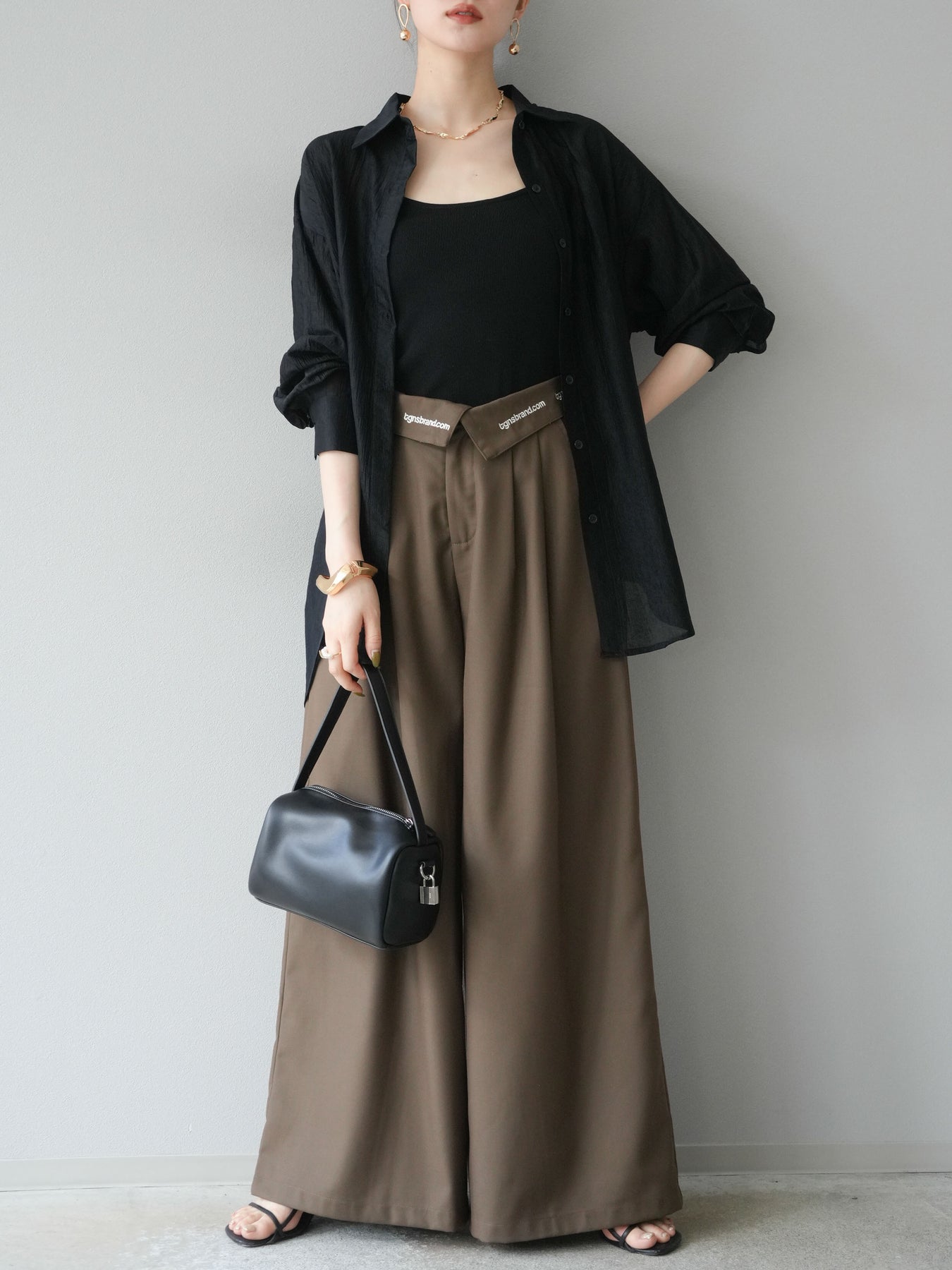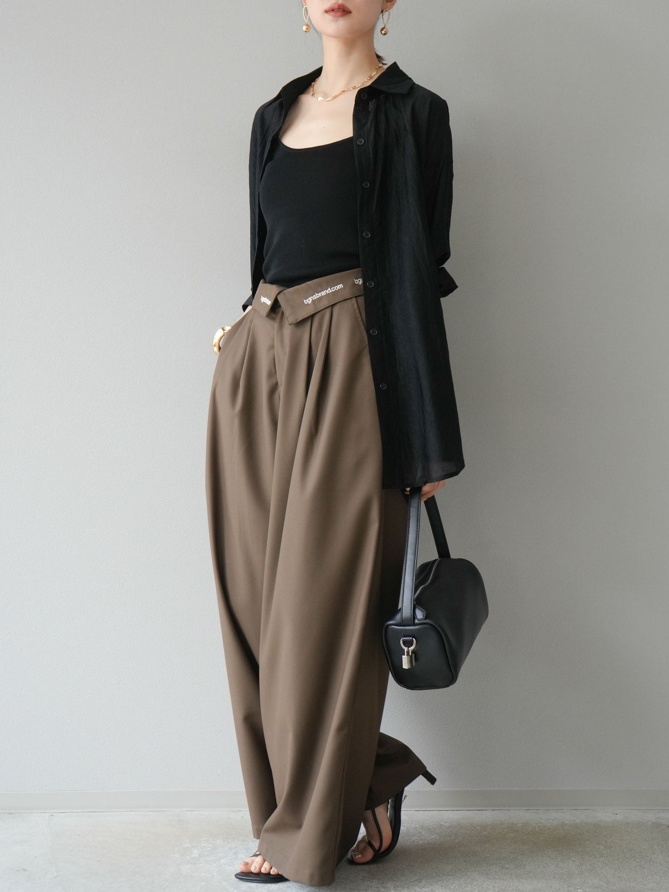 【預購】寬褲,捲腰,附logo褶/褐色