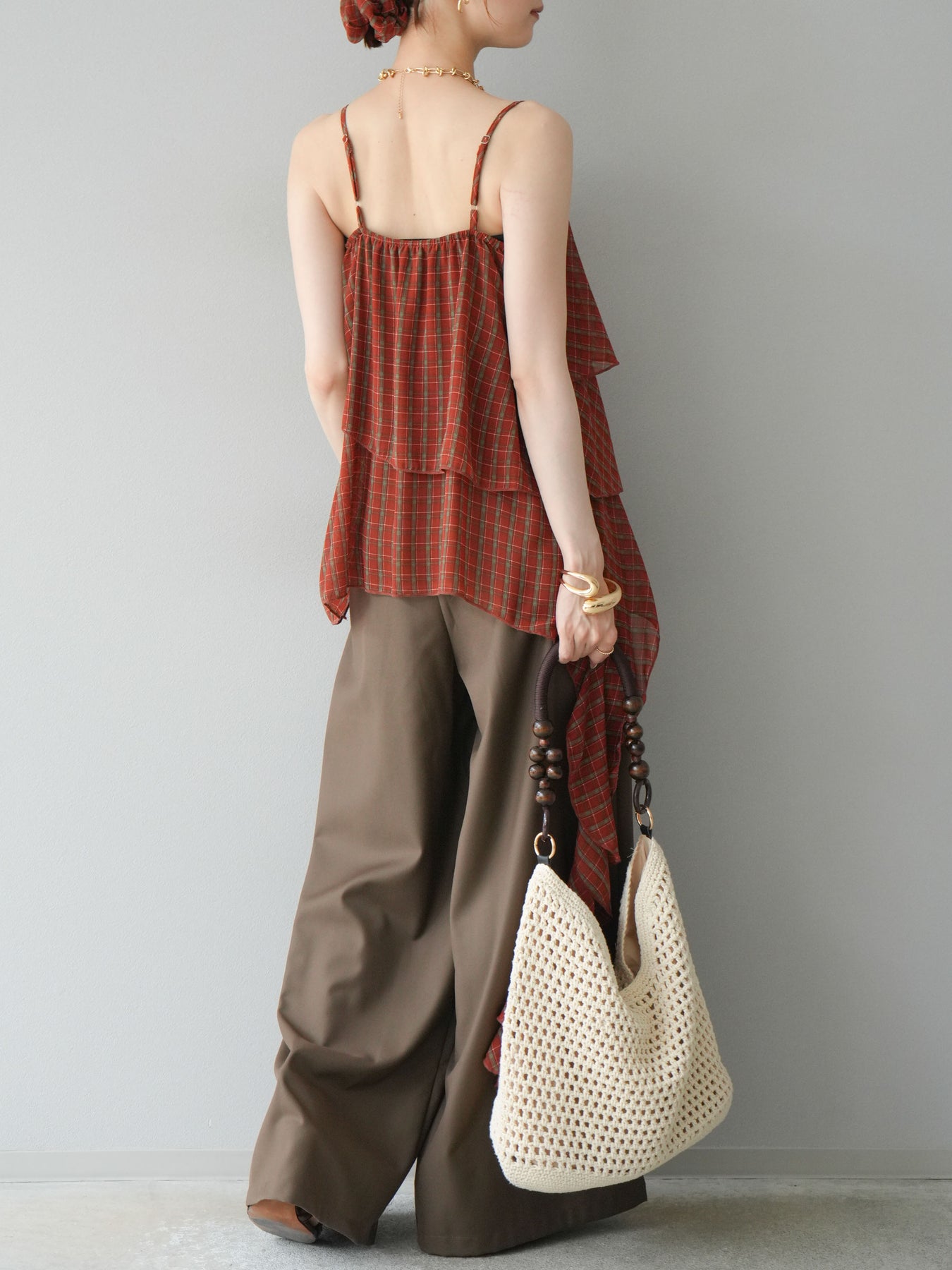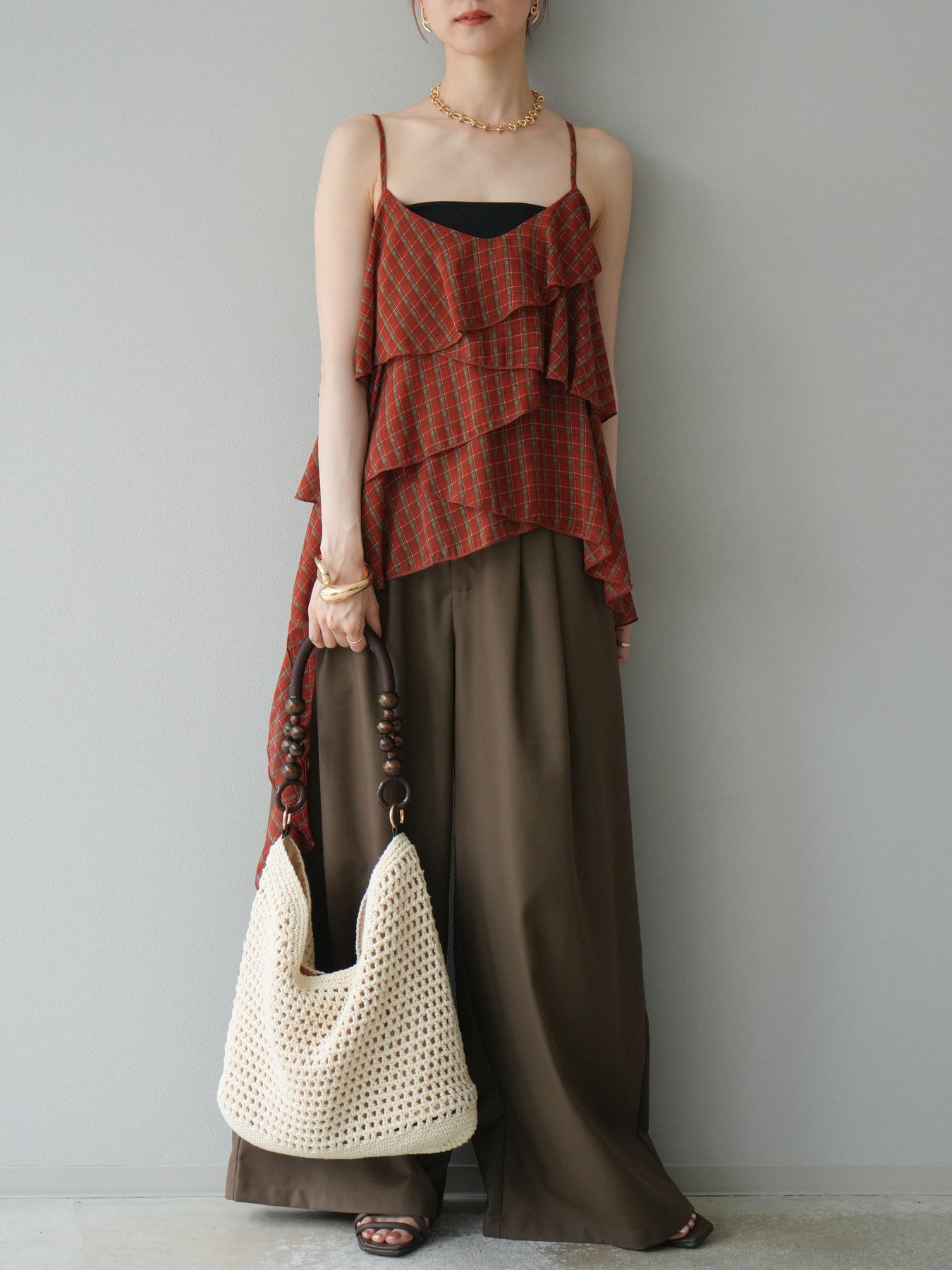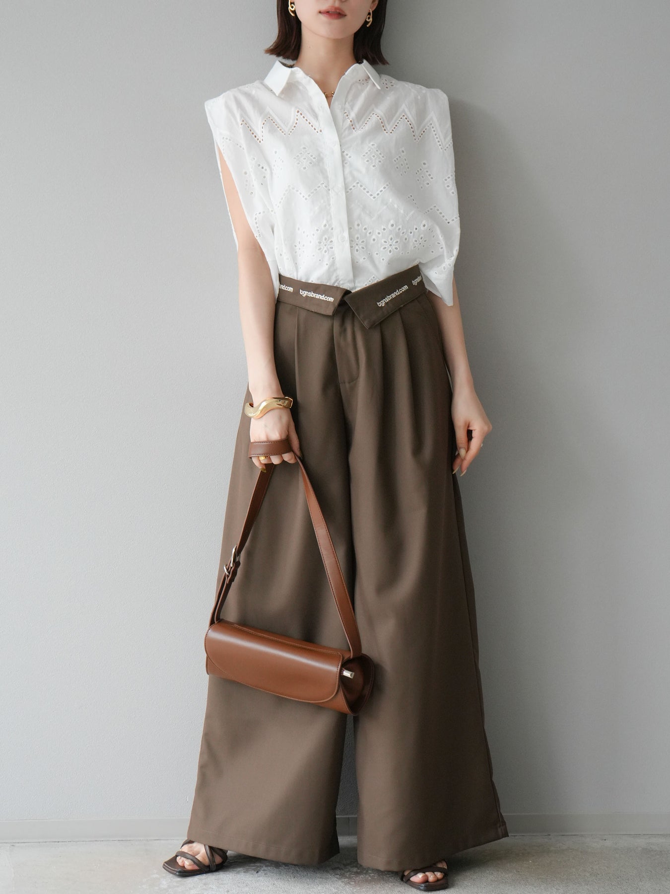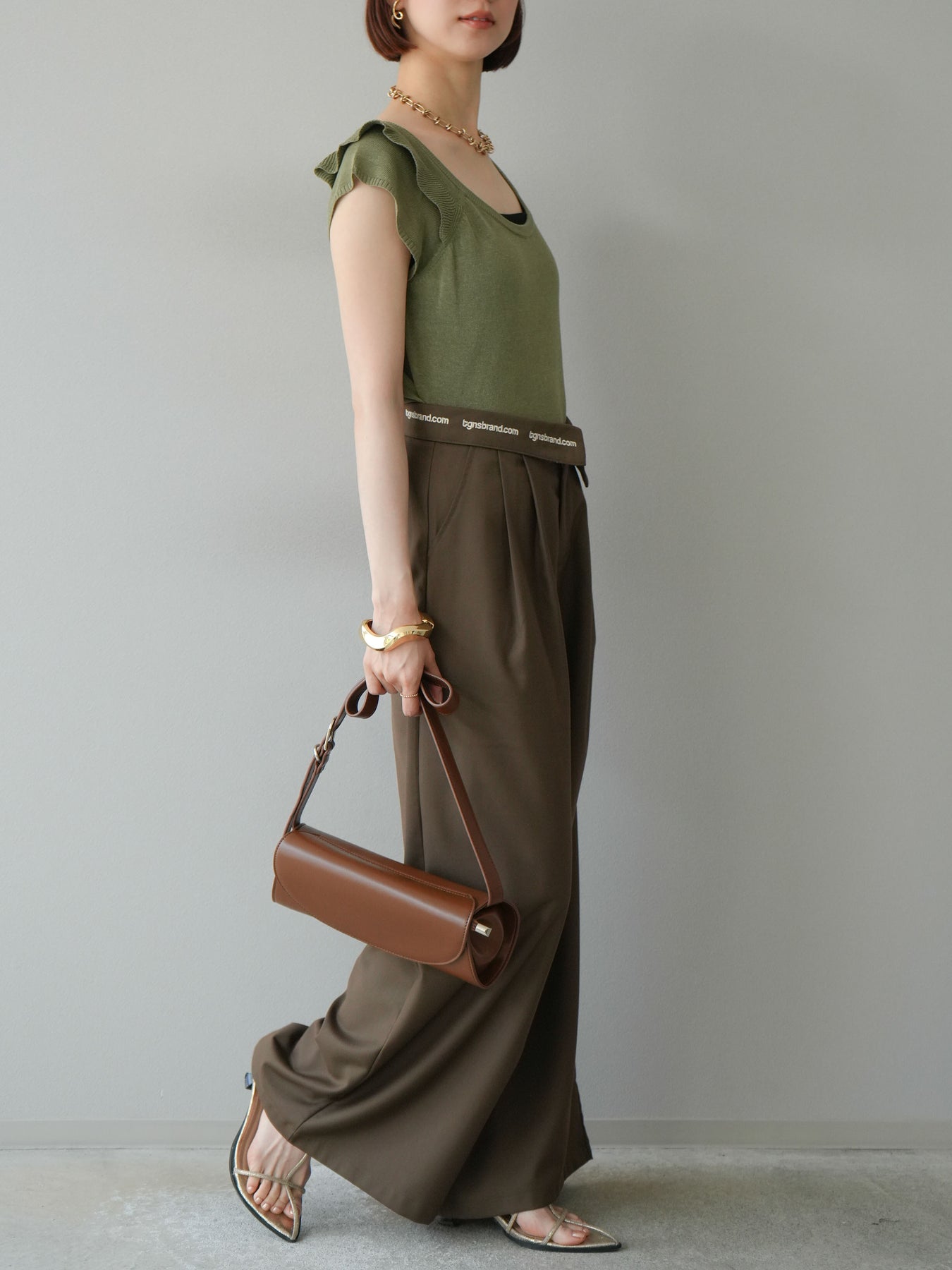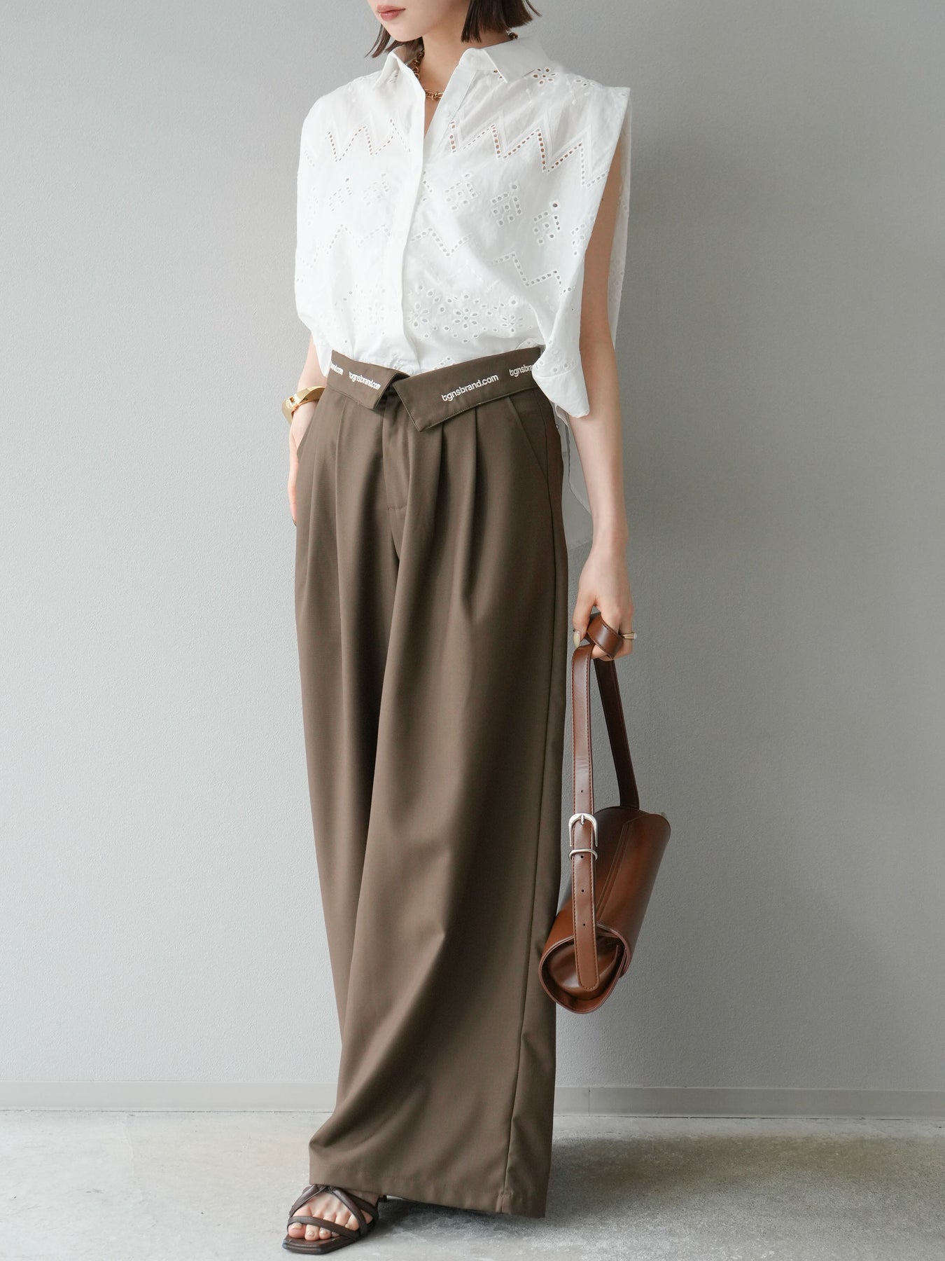 【預購】寬褲,捲腰,附logo褶/褐色