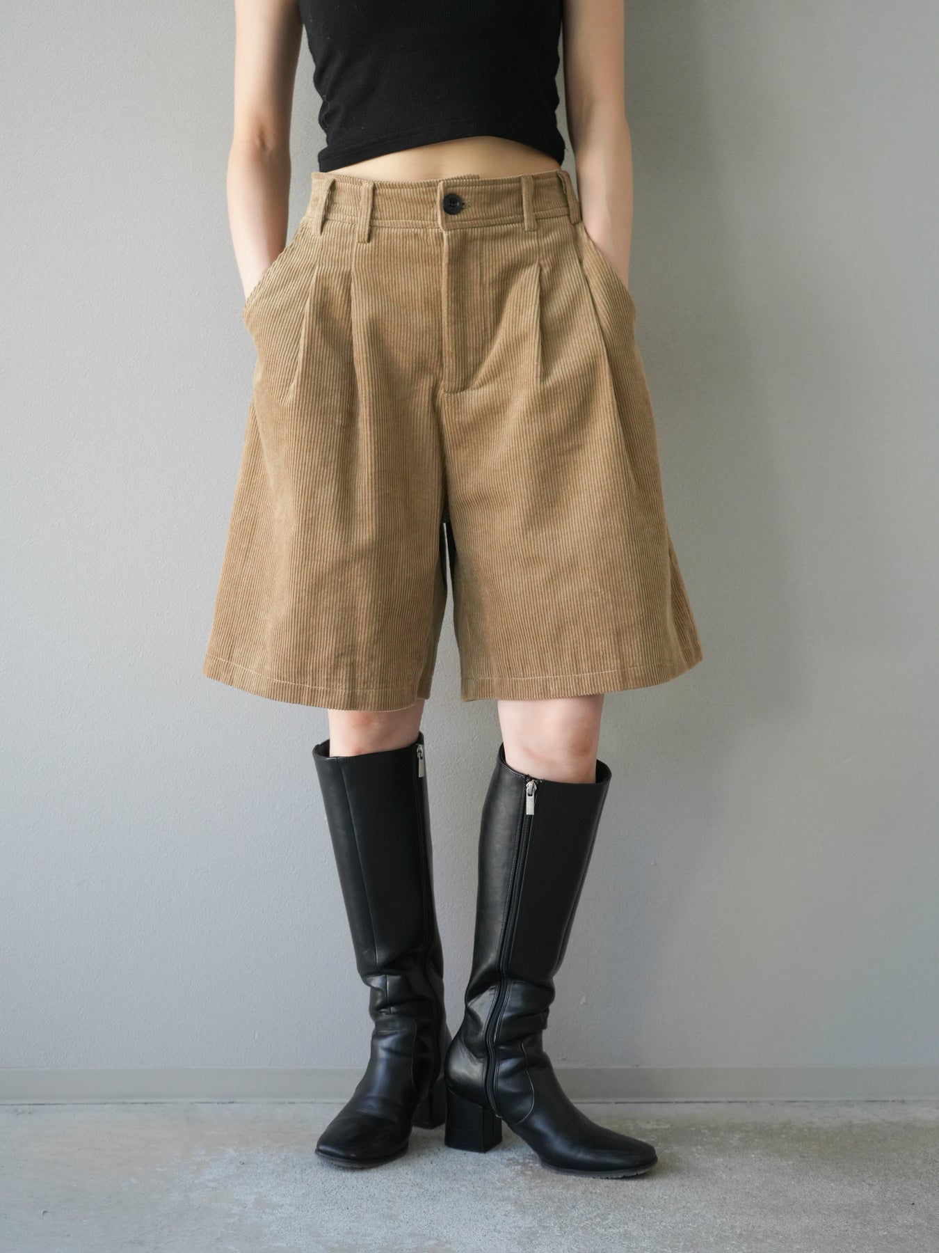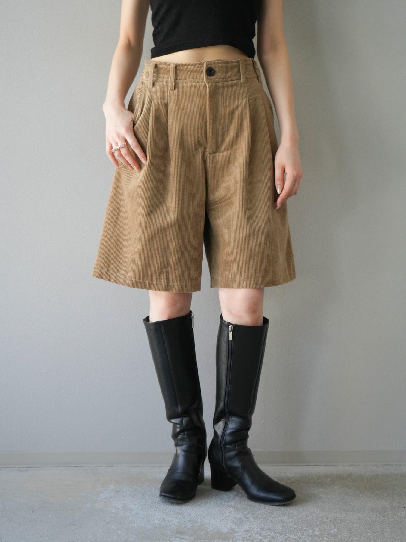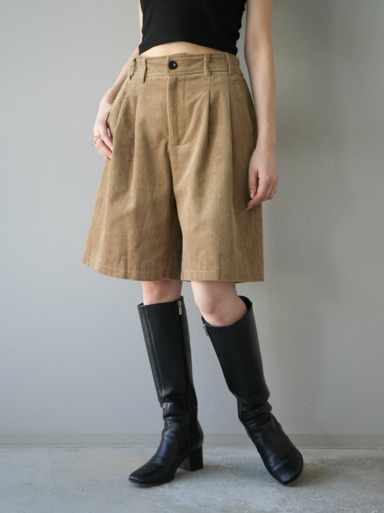 季節感のあるコーデュロイ素材を使用したハーフパンツ。程よい厚みと柔らかな質感が特徴で、ラフさの中に上品さをプラスしてくれる一枚です。タック入りのシルエットが腰回りをすっきりと見せつつ、ゆとりのあるデザインで快適な穿き心地を実現。スウェットやニットとのカジュアルな組み合わせはもちろん、シャツやジャケットと合わせて大人っぽく着こなすのもおすすめです。
