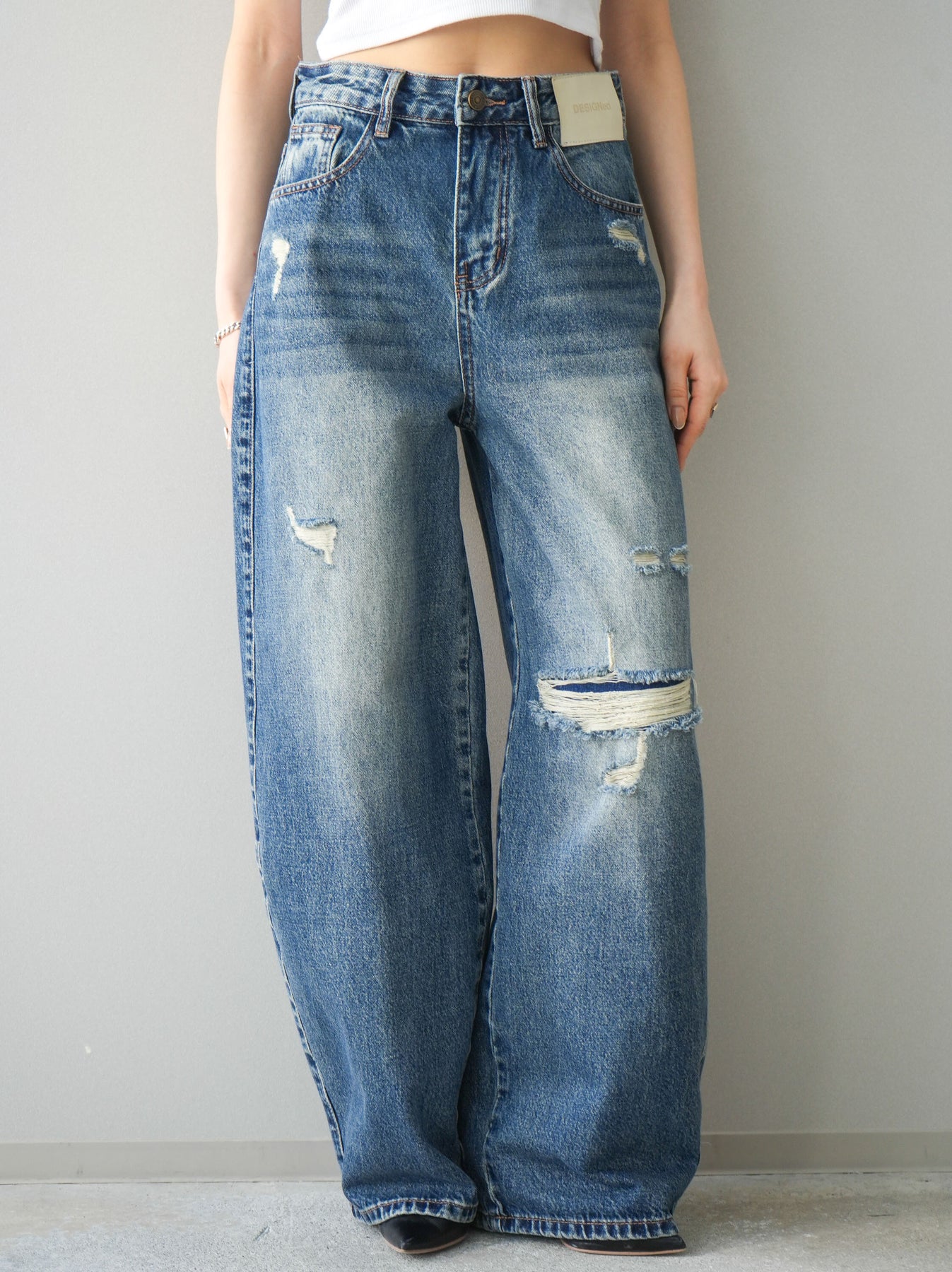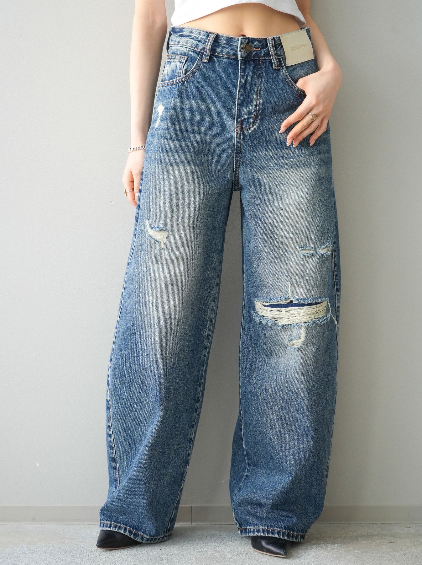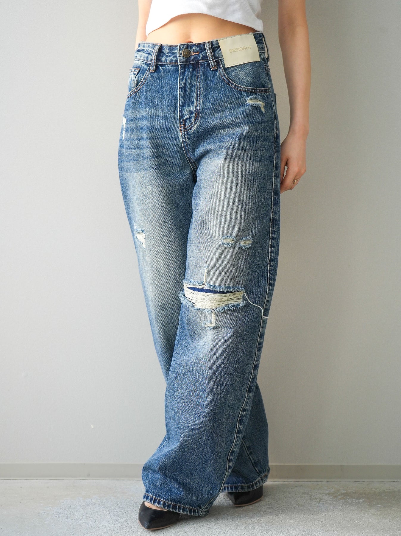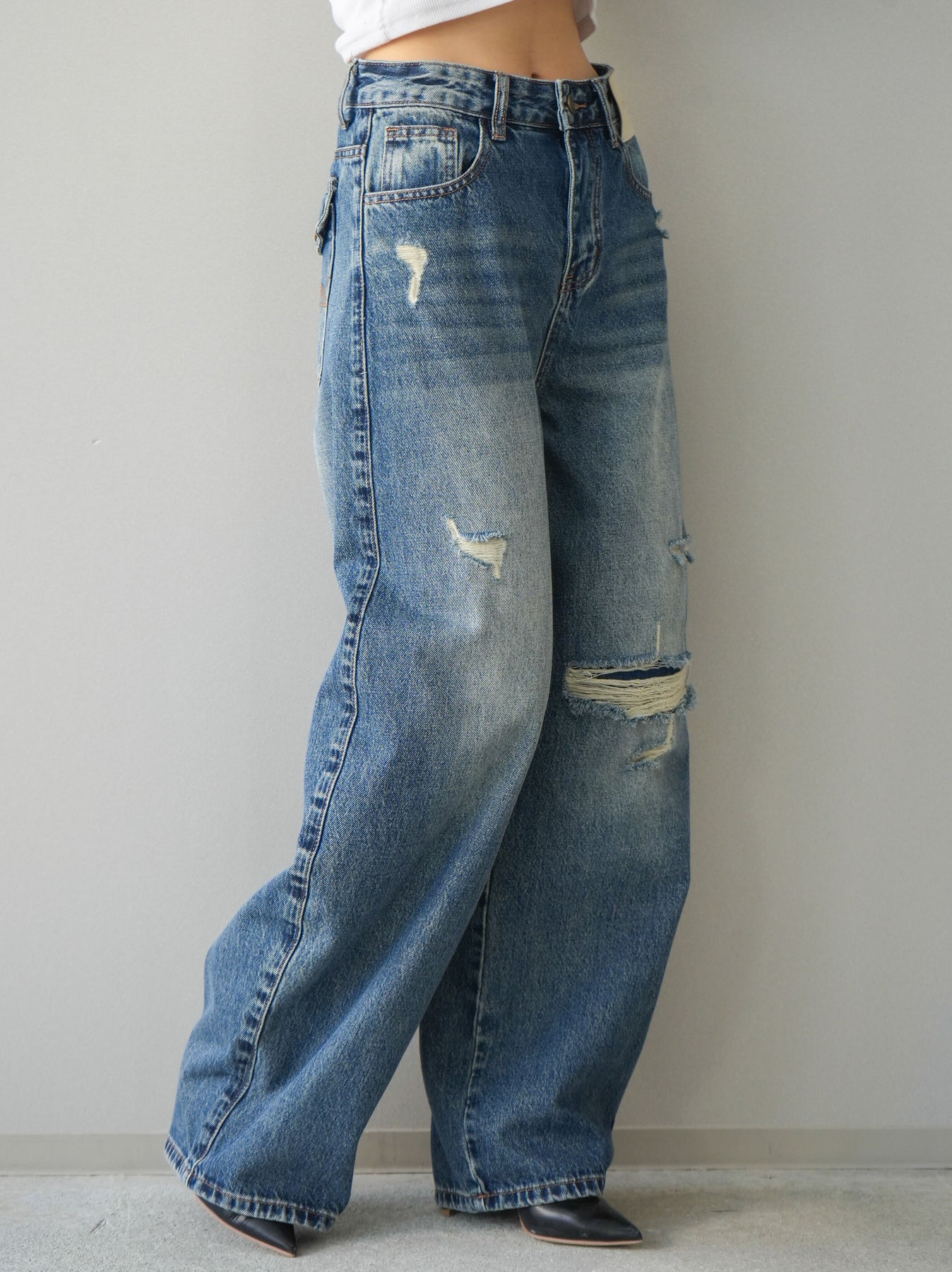 程よく施したダメージ加工がスタイリングに抜け感をプラスするデニムパンツ。ワイドなシルエットで脚のラインを拾いにくく、リラックス感のある着こなしが叶います。ヴィンテージライクな色落ちやクラッシュディテールがアクセントになり、シンプルなトップスと合わせるだけでこなれた印象に。シーズンレスで活躍する、ワードローブに加えたい一本です。 ※ボトムス、キャミソール(インナー)以外の商品は一律でインナーは付属していません