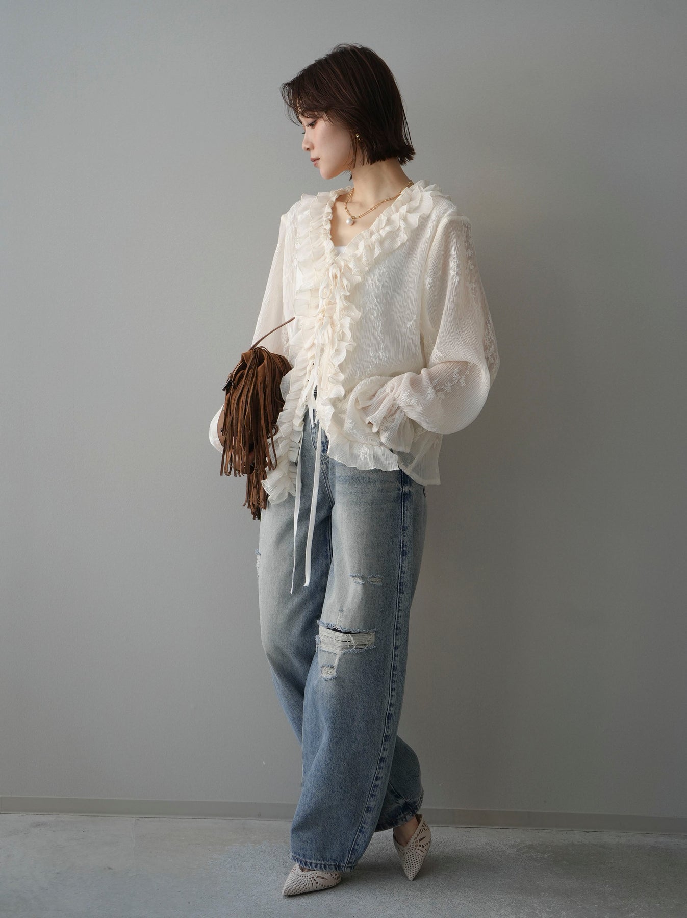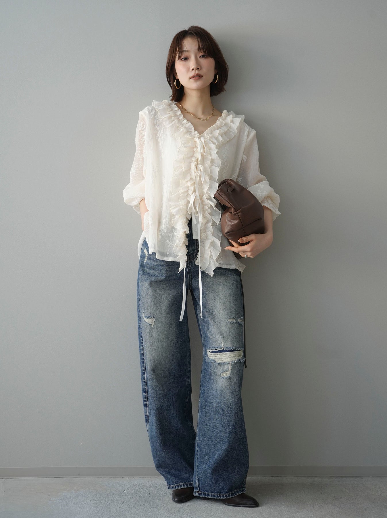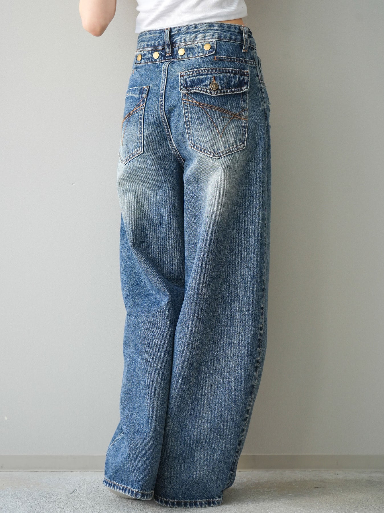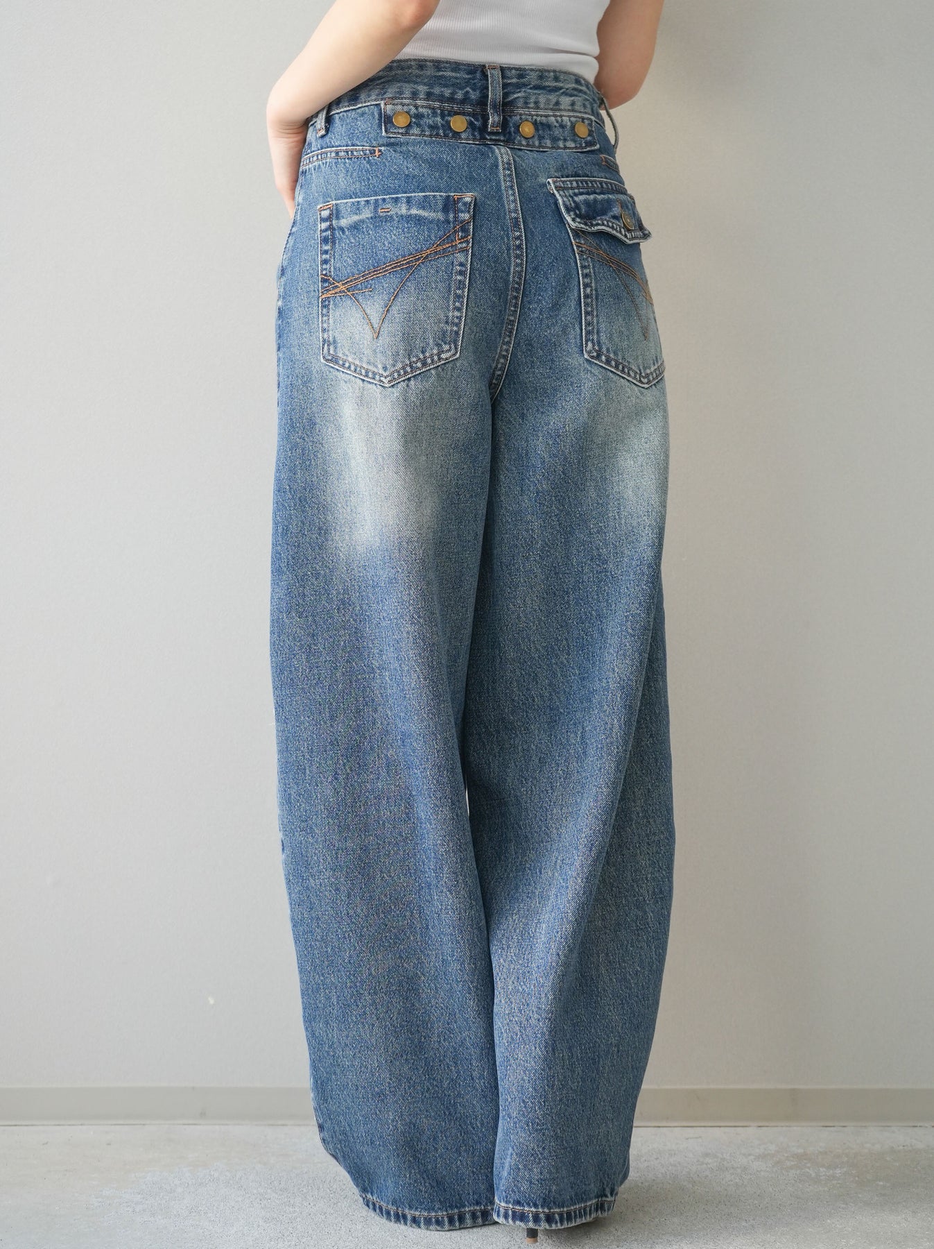 程よく施したダメージ加工がスタイリングに抜け感をプラスするデニムパンツ。ワイドなシルエットで脚のラインを拾いにくく、リラックス感のある着こなしが叶います。ヴィンテージライクな色落ちやクラッシュディテールがアクセントになり、シンプルなトップスと合わせるだけでこなれた印象に。シーズンレスで活躍する、ワードローブに加えたい一本です。 ※ボトムス、キャミソール(インナー)以外の商品は一律でインナーは付属していません