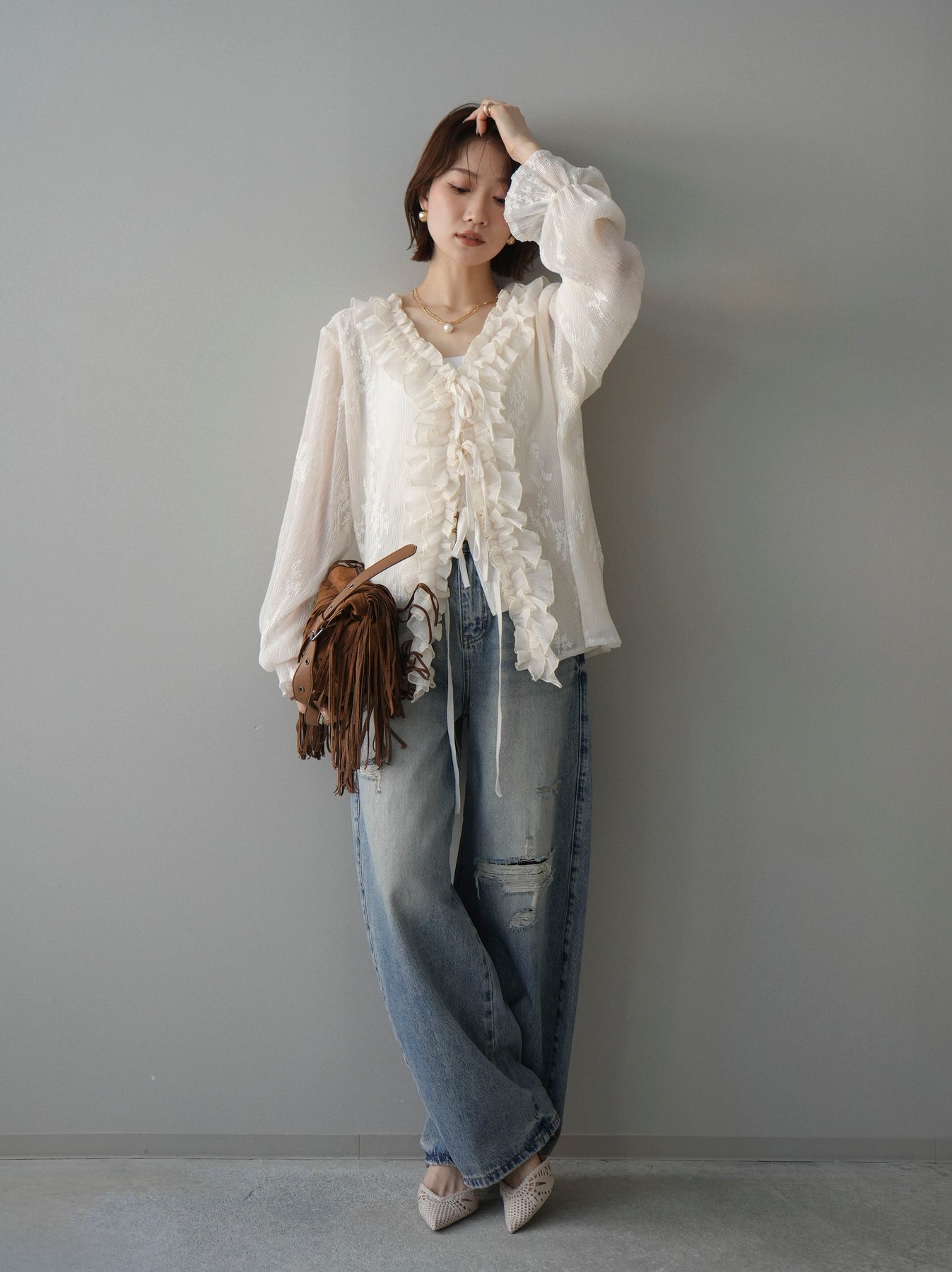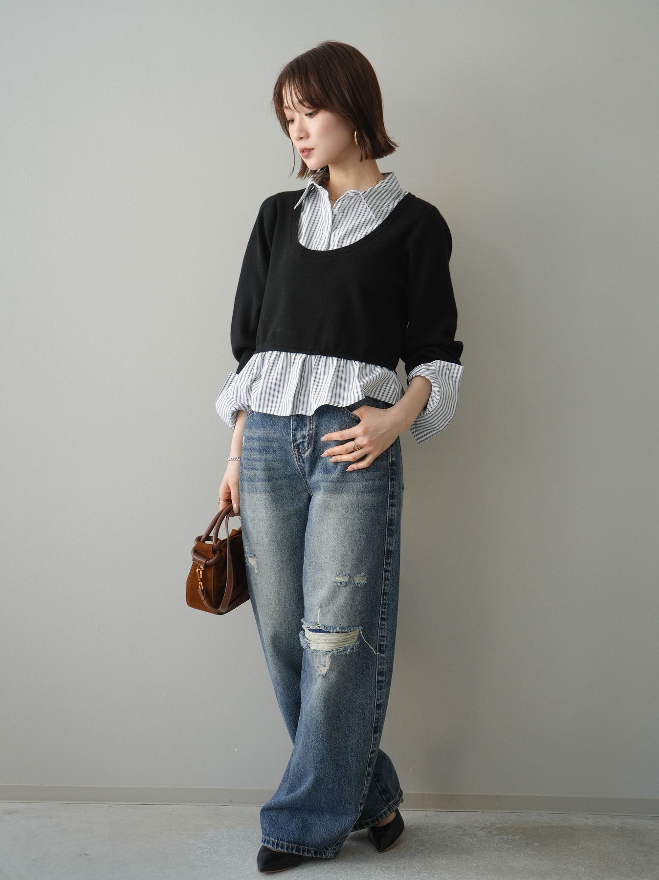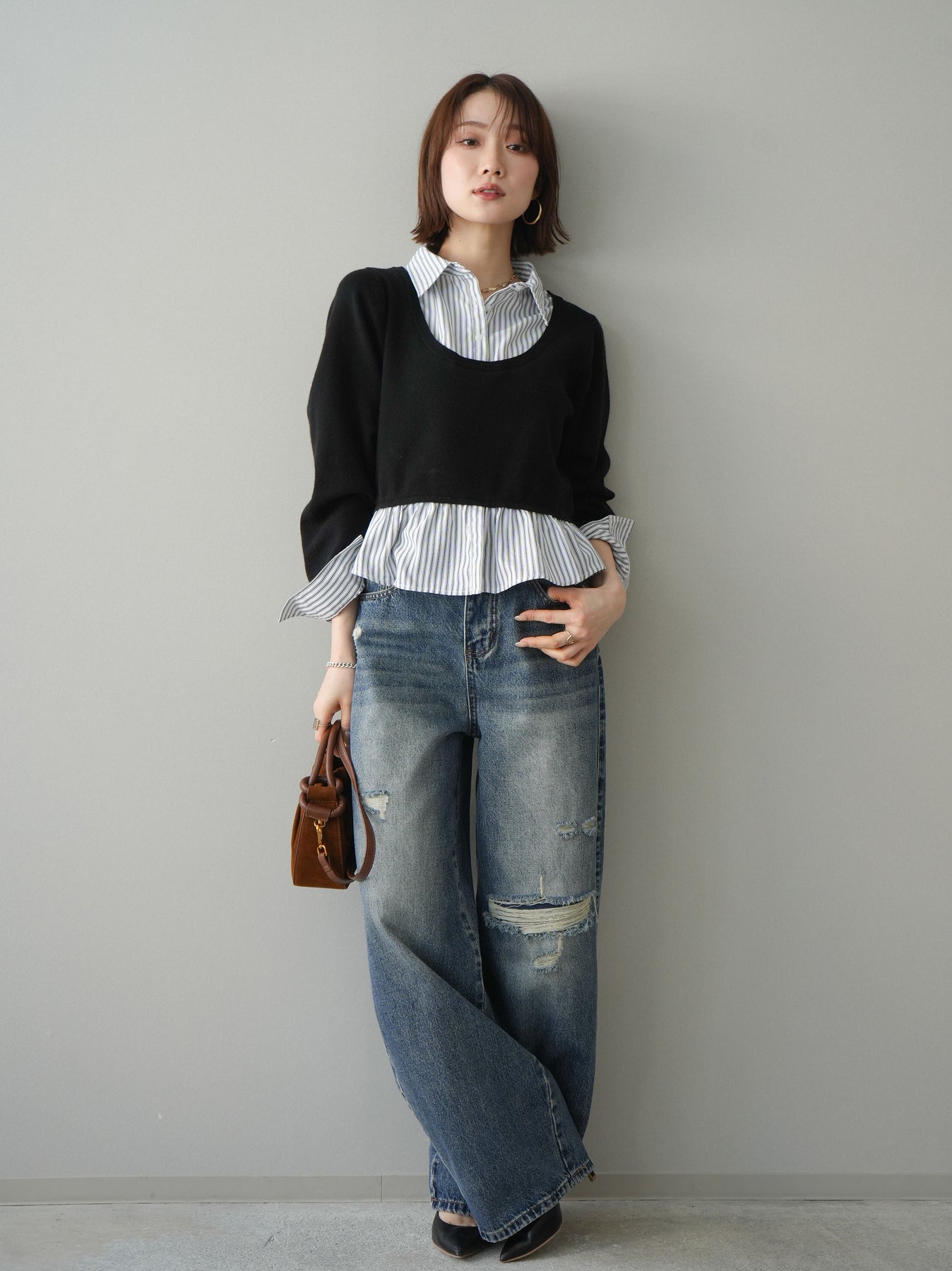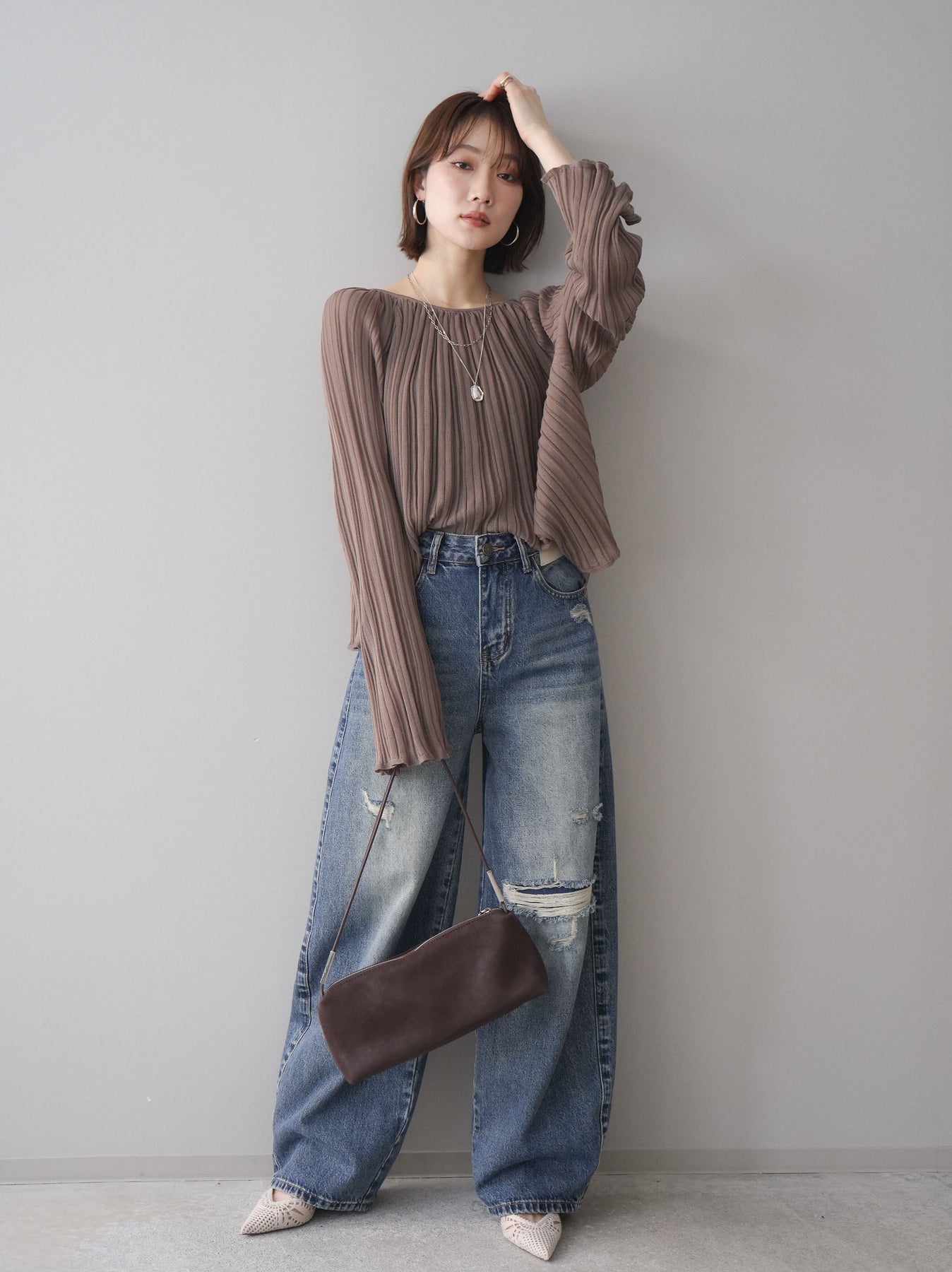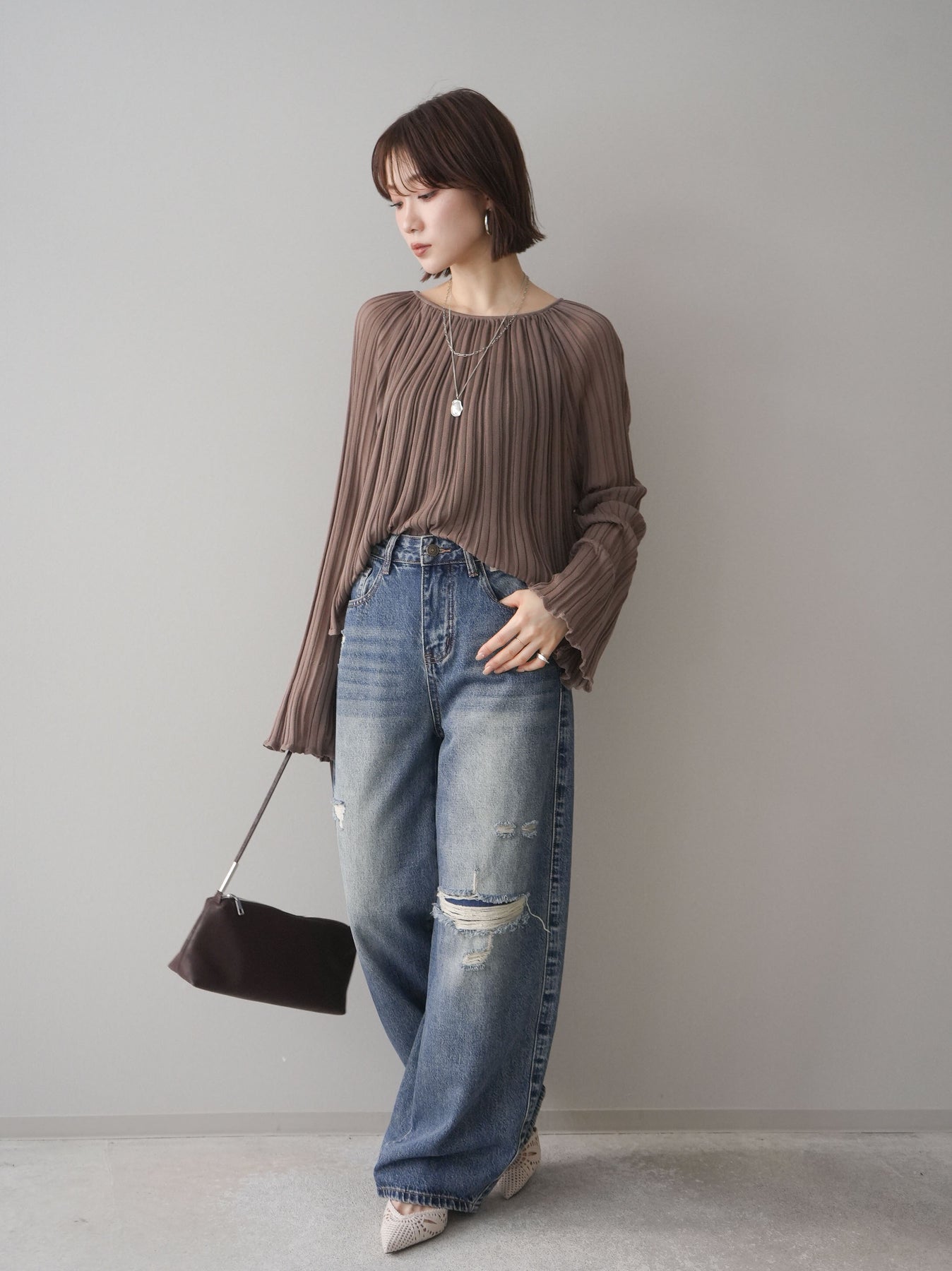 程よく施したダメージ加工がスタイリングに抜け感をプラスするデニムパンツ。ワイドなシルエットで脚のラインを拾いにくく、リラックス感のある着こなしが叶います。ヴィンテージライクな色落ちやクラッシュディテールがアクセントになり、シンプルなトップスと合わせるだけでこなれた印象に。シーズンレスで活躍する、ワードローブに加えたい一本です。 ※ボトムス、キャミソール(インナー)以外の商品は一律でインナーは付属していません