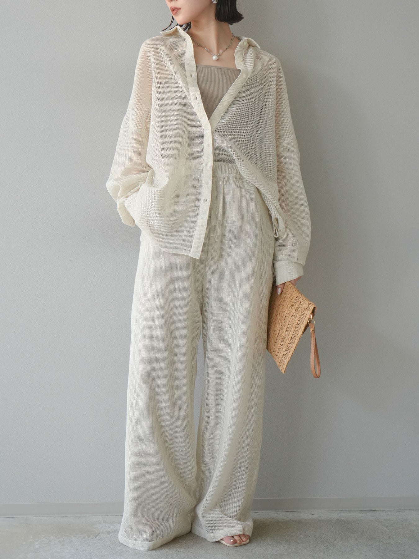 這款棉質網眼休閒褲透明度恰到好處,並帶有精緻的閃光感。光滑輕盈的網眼布料即使在盛夏也能穿著舒適。腰部採用全鬆緊設計,穿著舒適無壓力。直筒輪廓完美展現腿部線條,透視感則增添一絲休閒感。它非常適合搭配T恤和束腰外衣,也建議與洋裝搭配。這款夏季褲子非常適合成年人穿著,兼具休閒感和迷人魅力。 *除下裝和吊帶背心(內衣)外,其他商品均不含內衣。