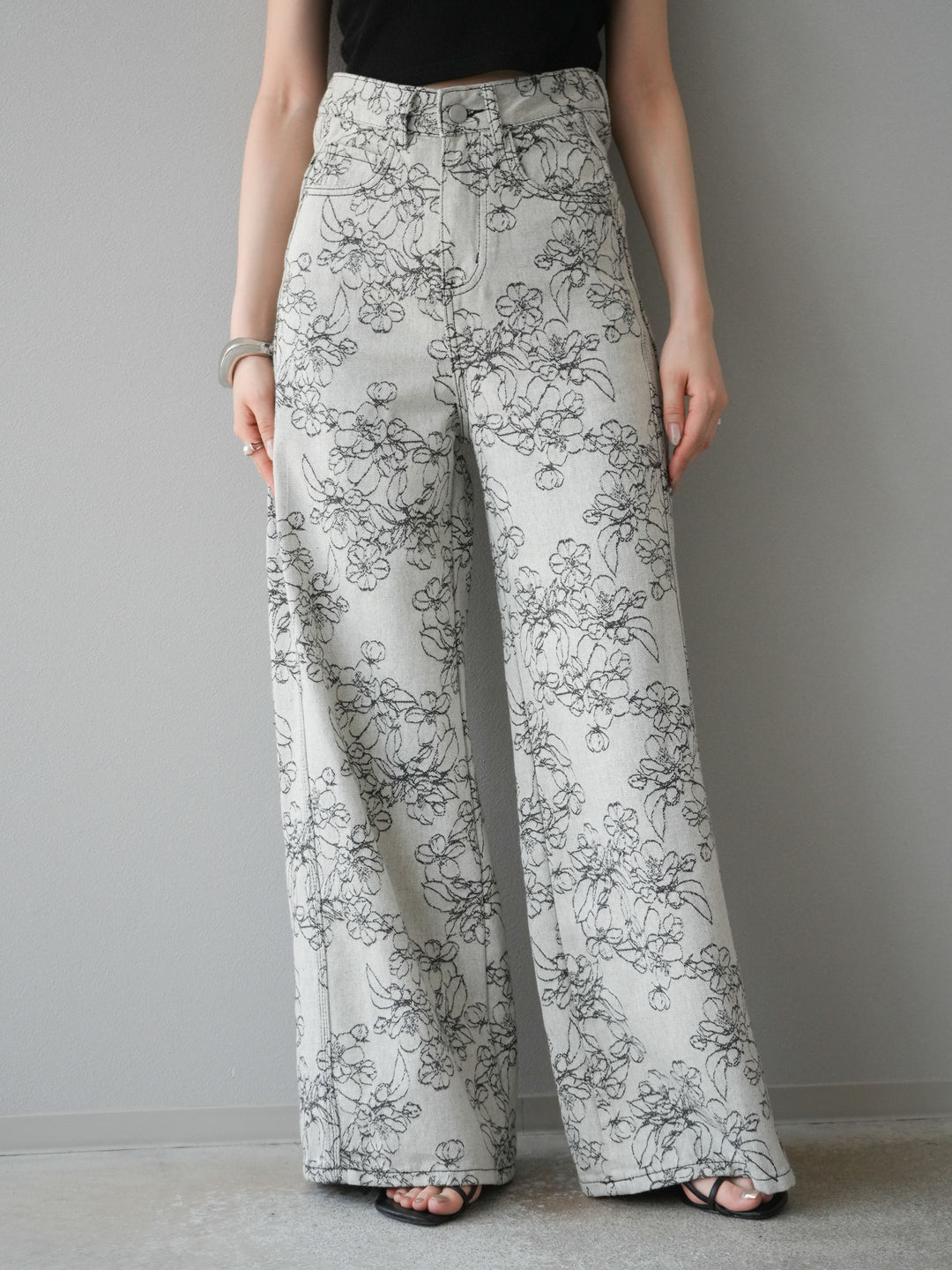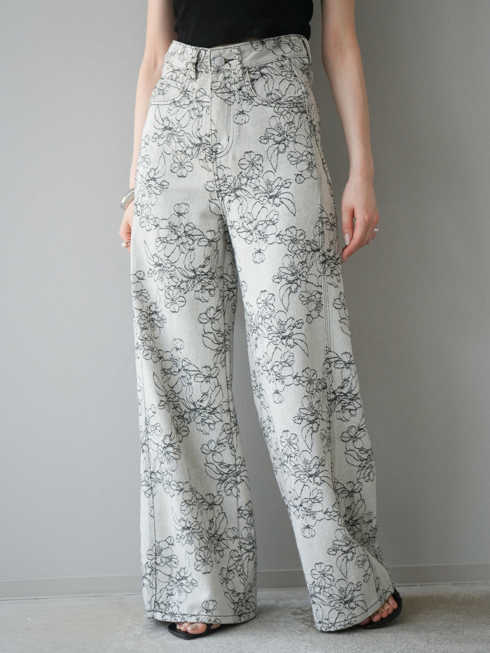 【預購】花朵提花牛仔寬褲/黑