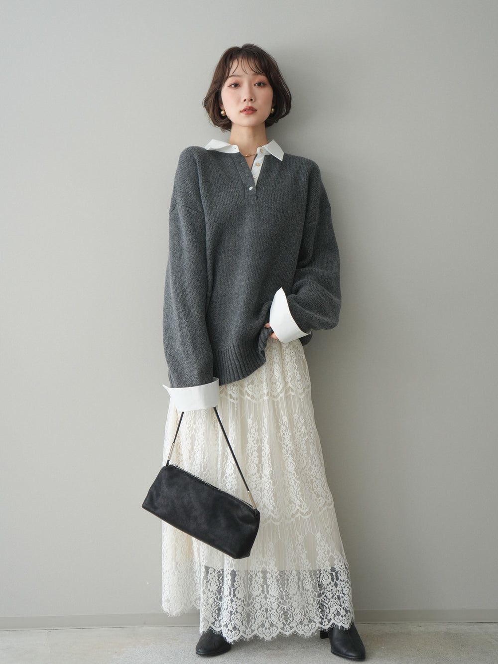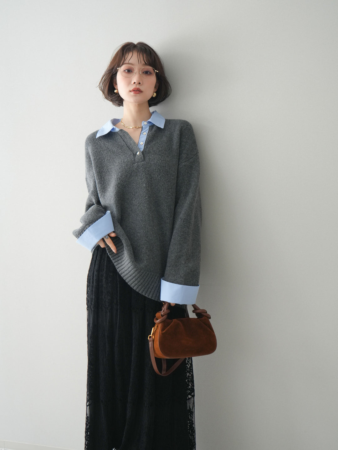 [SET]シャツドッキングオーバーニットプルオーバー+裏プリーツ総レースロングスカート(2set)
