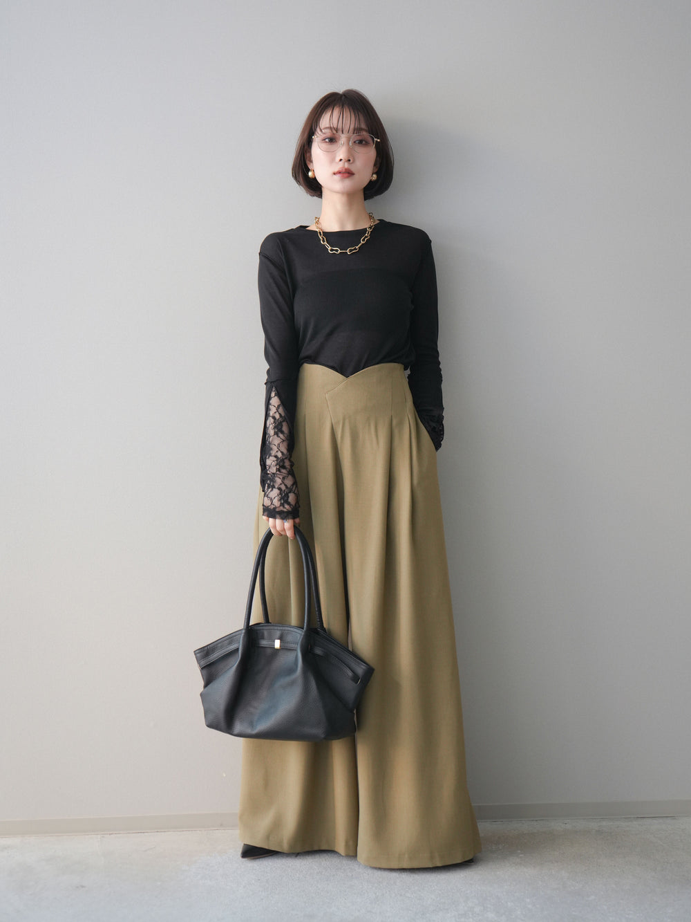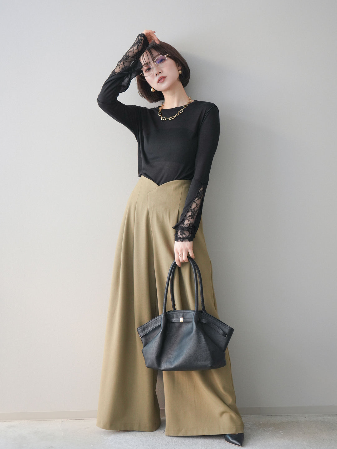 [SET]袖レースレイヤードデザインメロートップス+デザインハイウエストワイドパンツ(2set)