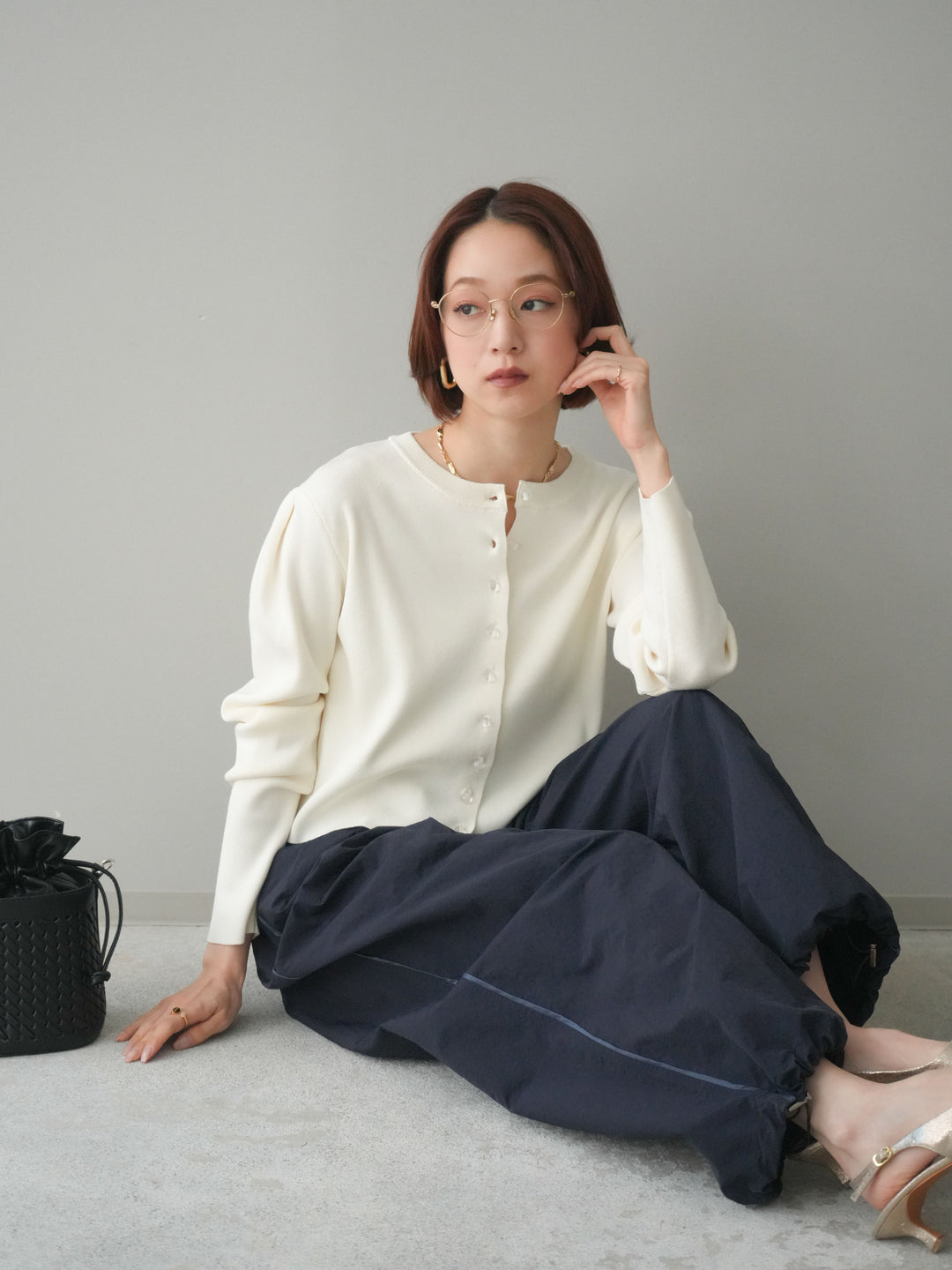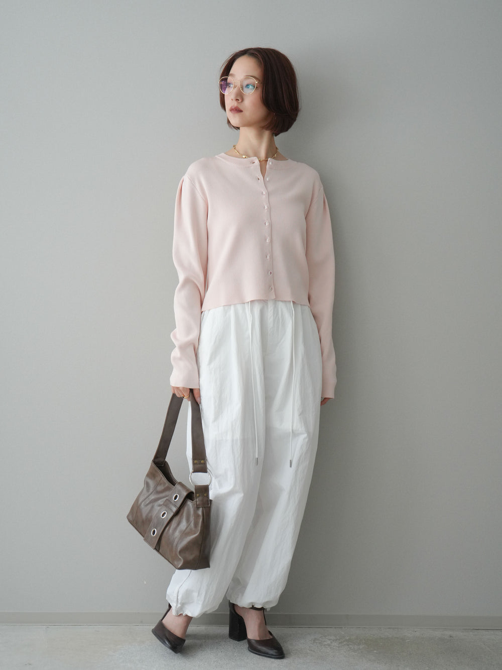 [SET]クリアボタンタックニットカーディガン+ドロストサイドラインナイロンパンツ(2set)