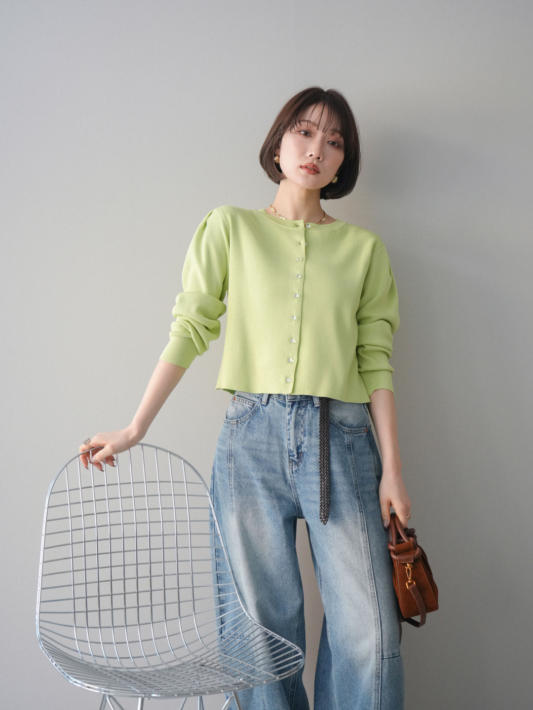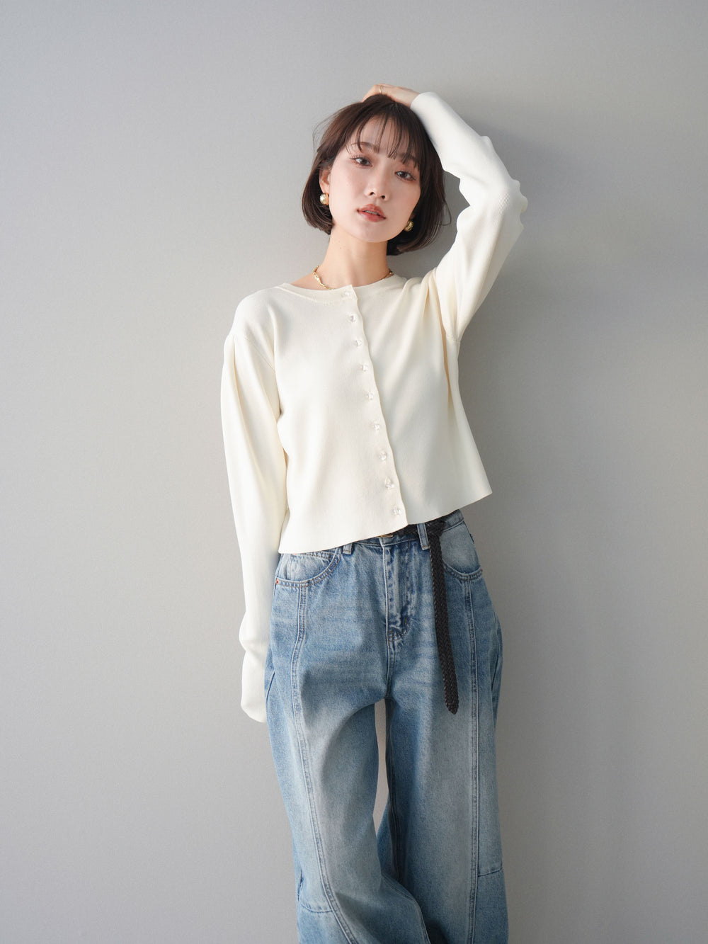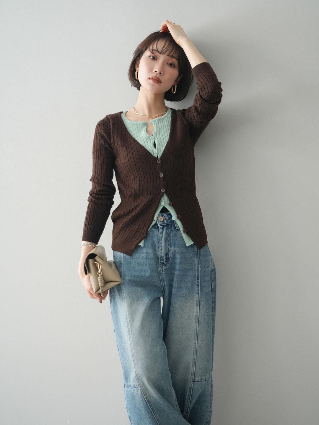 [SET]クリアボタンタックニットカーディガン+ガーメントウォッシュカーブデニムパンツ(2set)