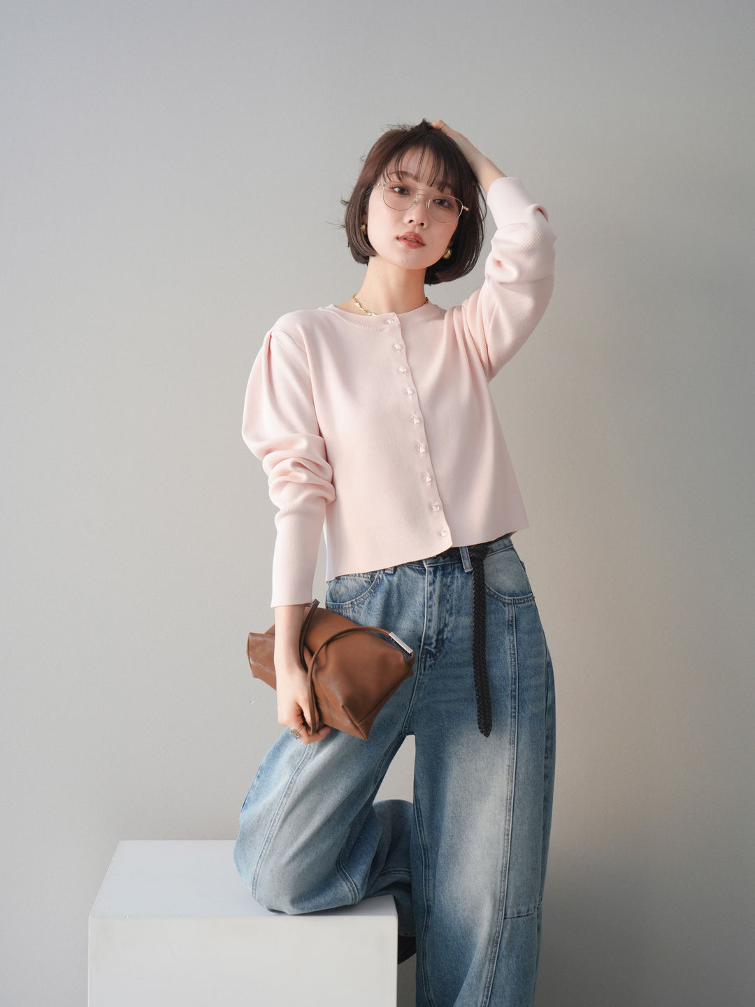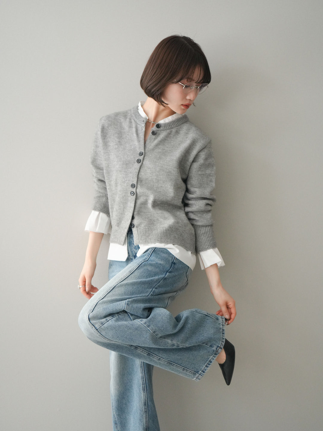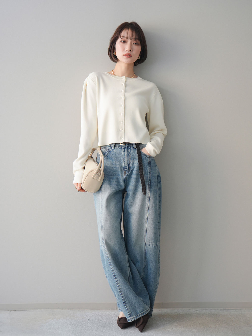 [SET]クリアボタンタックニットカーディガン+ガーメントウォッシュカーブデニムパンツ(2set)