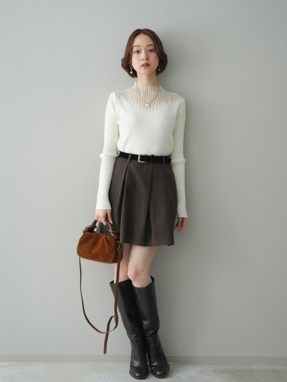 [SET]シアー切替スパンコールリブニットトップス+ベルト付きタックミニスカート(2set)