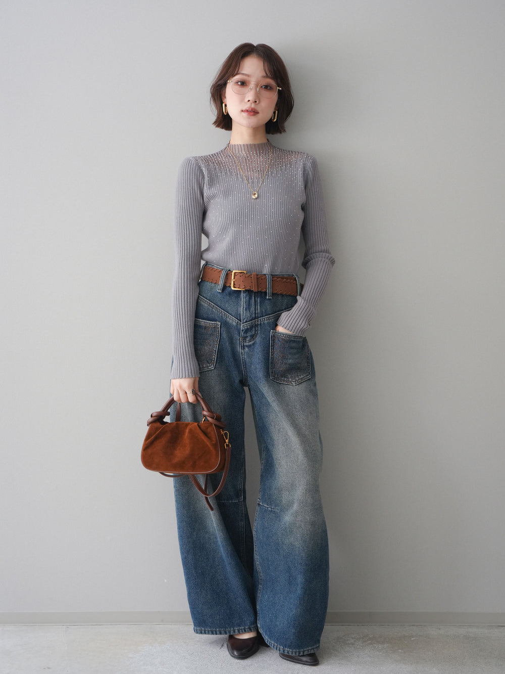 [SET]シアー切替スパンコールリブニットトップス+ベルト付ポケット刺繍カーブデニムパンツ(2set)