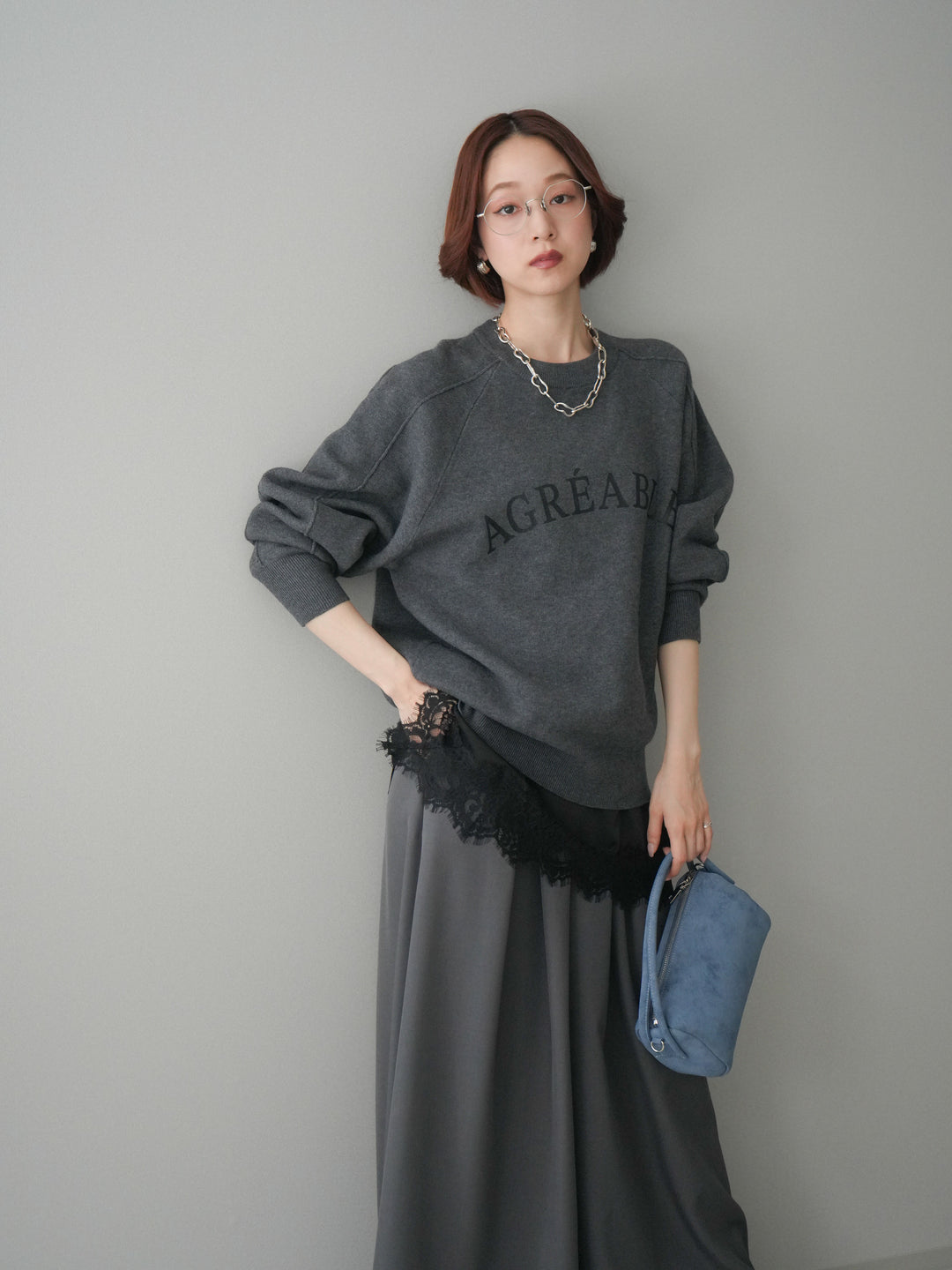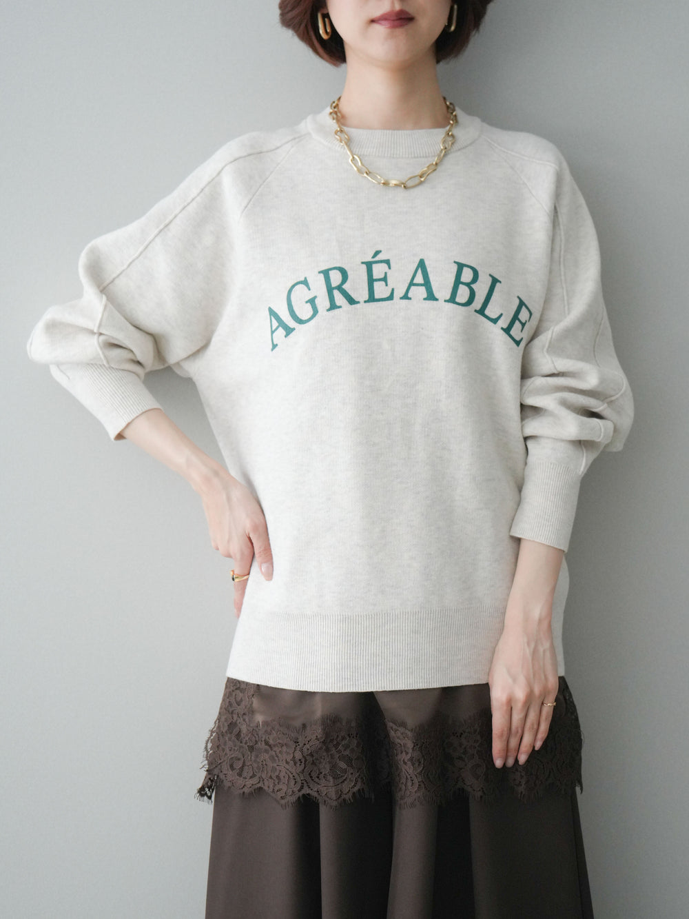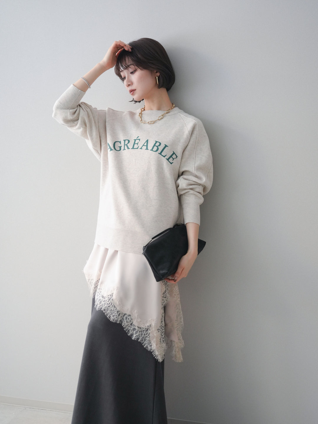[SET]半ラバープリントロゴスウェットライクニットプルオーバー+アシンメトリーサテンレースキャミソール(2set)
