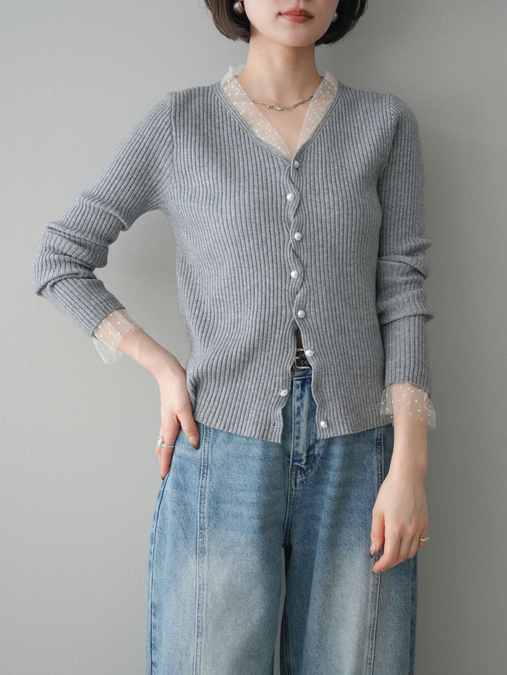 [SET]チュールドッキングパールボタンニットカーディガン+選べるアクセセット(2set)