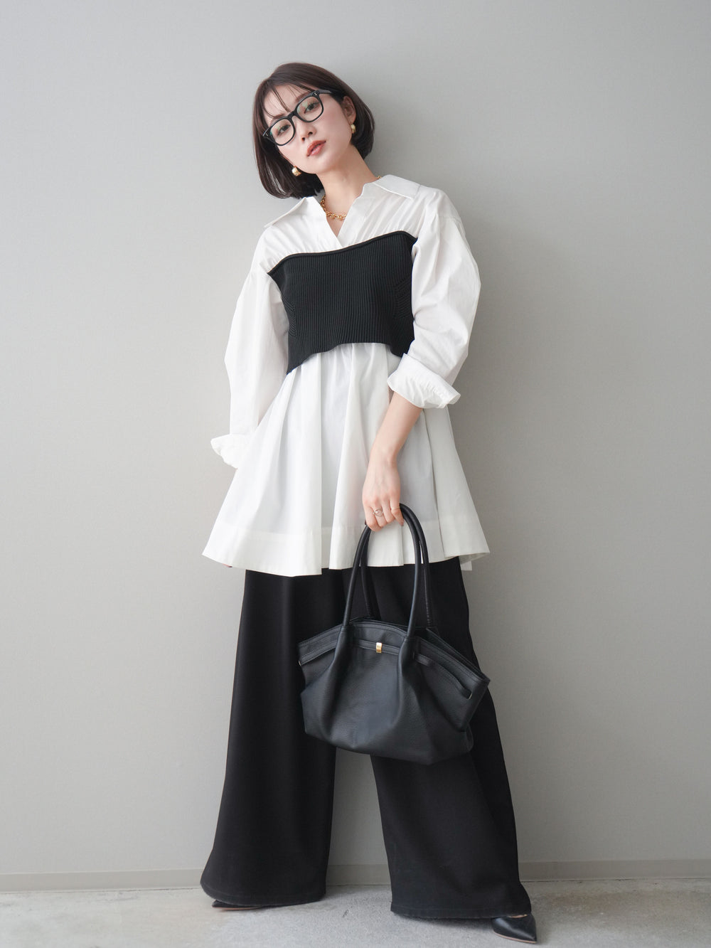 [SET]ニットビスチェドッキングフレアシャツチュニック+ベルトループデザインワイドパンツ(2set)