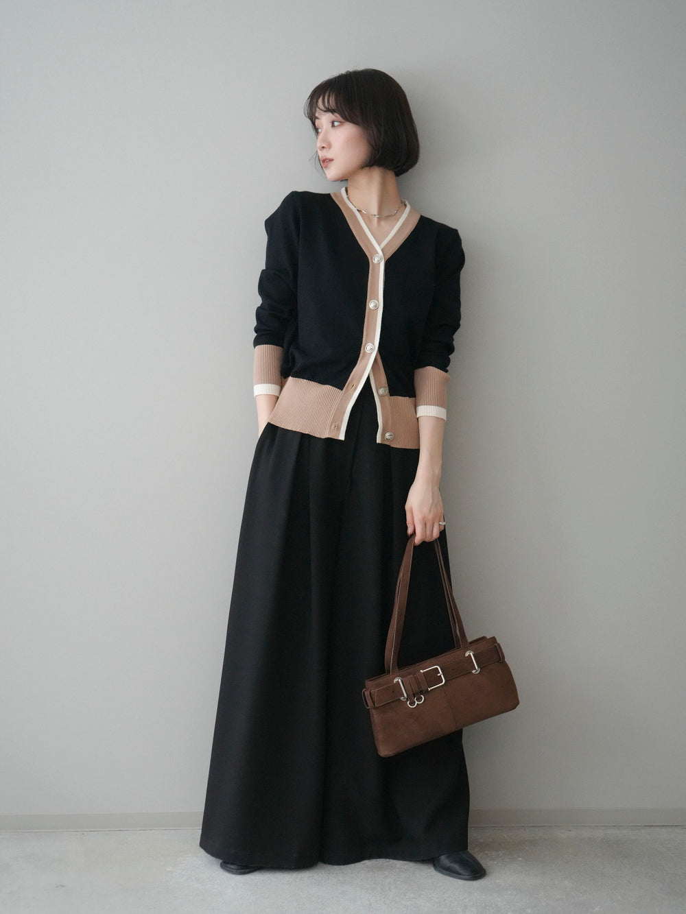 [SET]デザインボタン配色Vネックニットカーディガン+テープベルトタックバギーパンツ(2set)