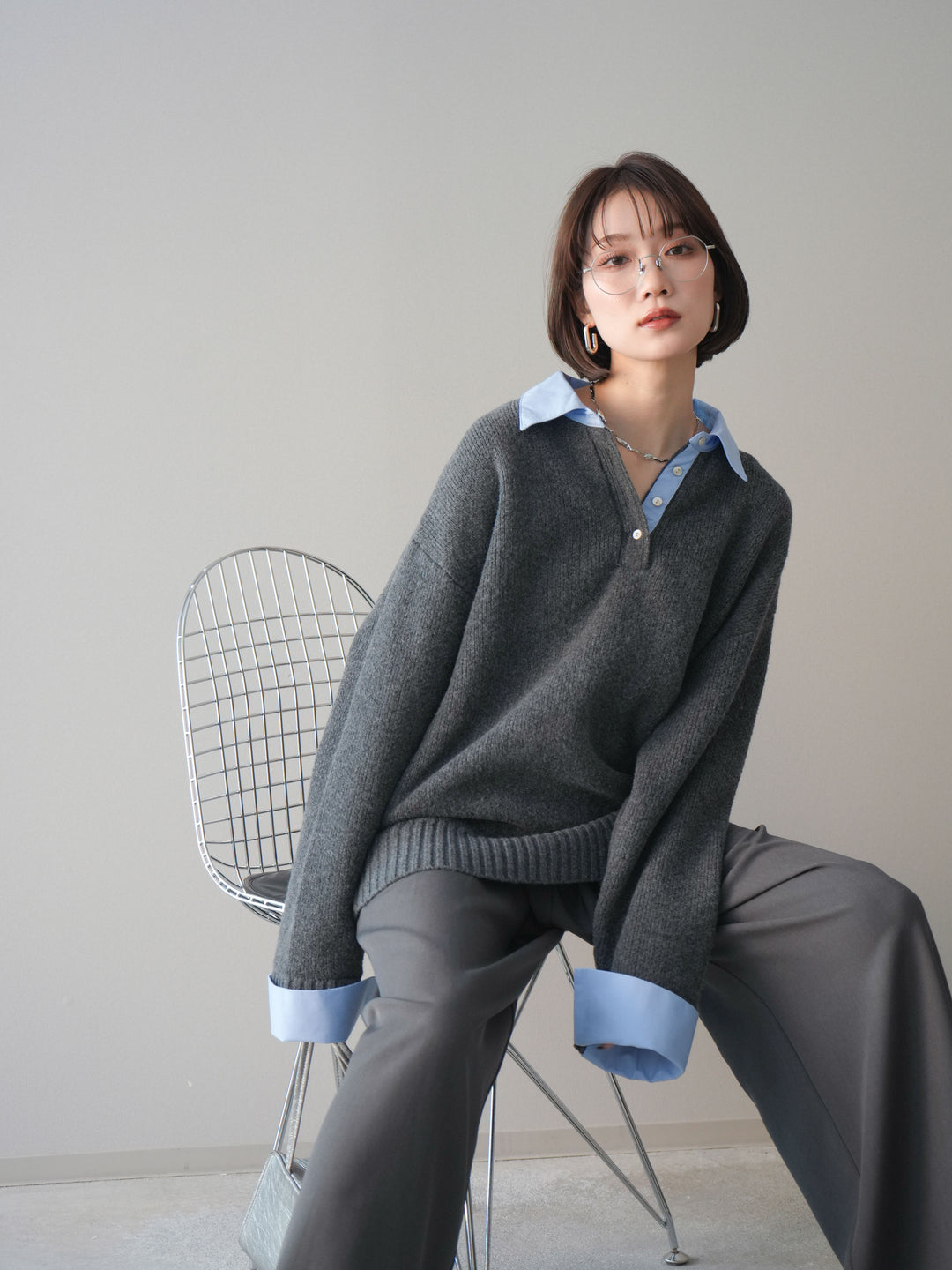 [SET]シャツドッキングオーバーニットプルオーバー+ベルトループデザインワイドパンツ(2set)