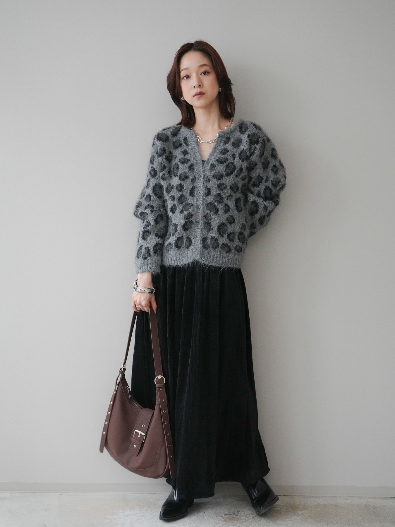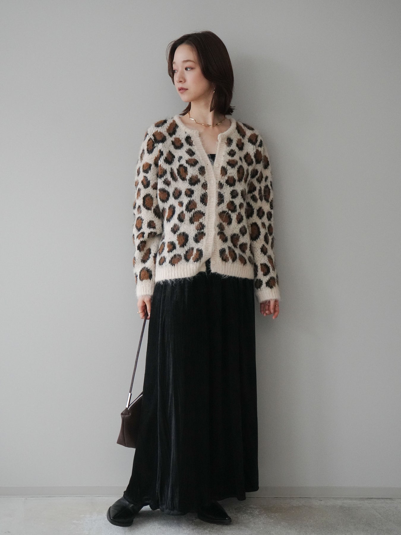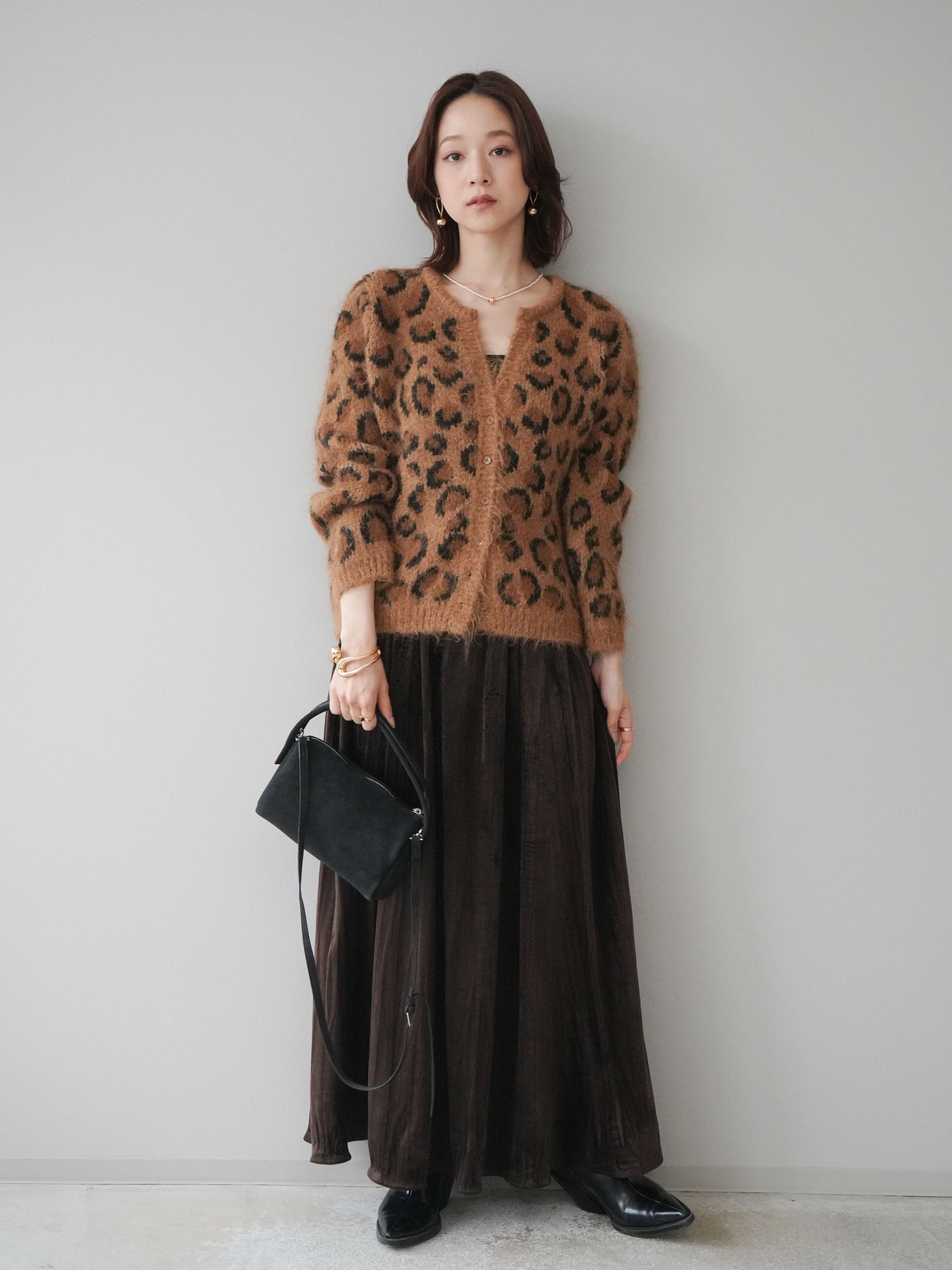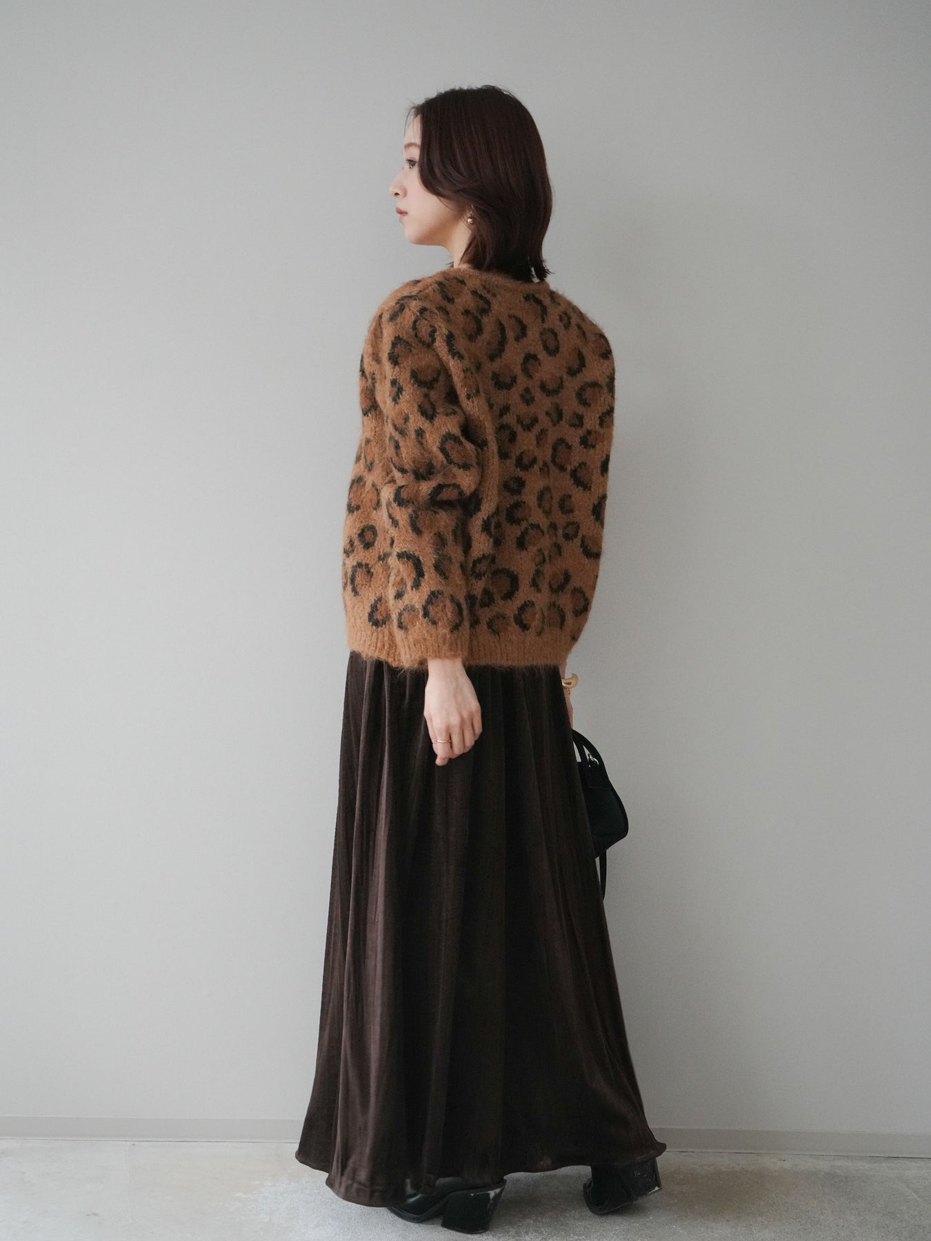 [SET]モヘアタッチレオパード柄ニットカーディガン+ワッシャーベロアプリーツスカート(2set)