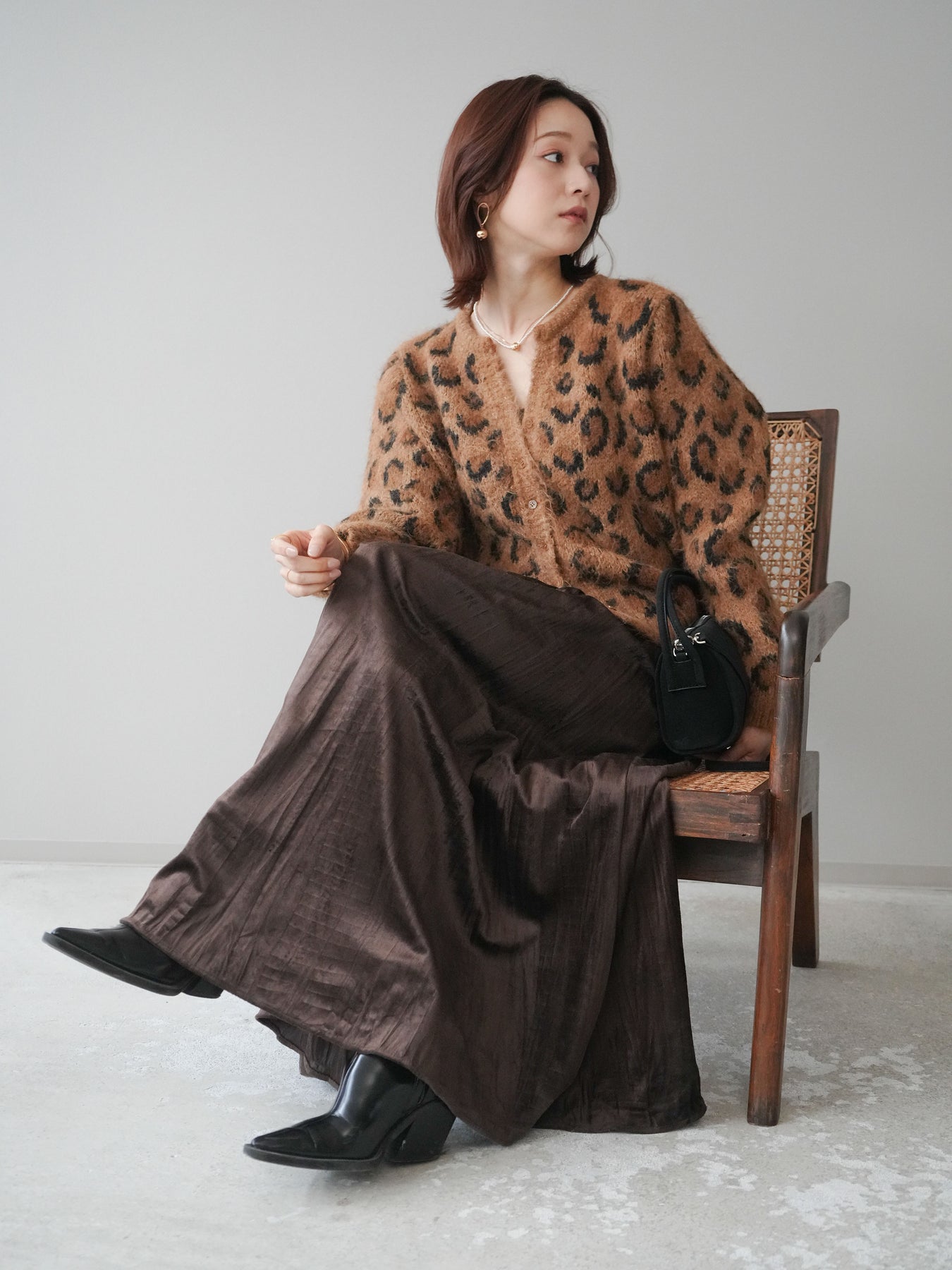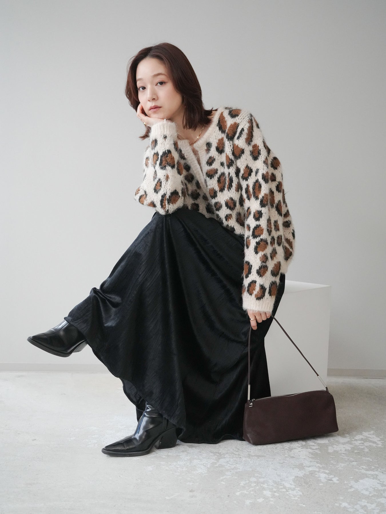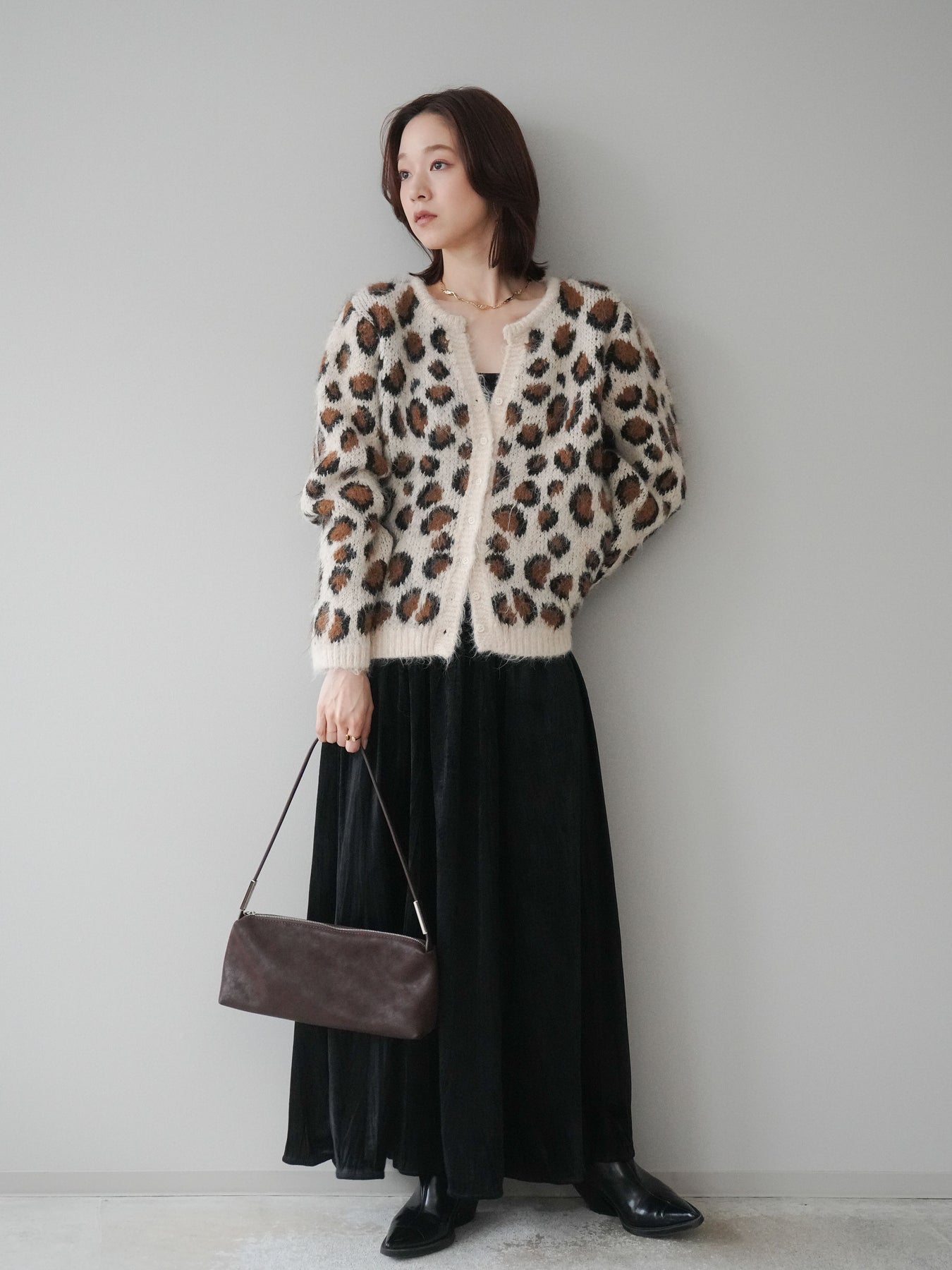 [SET]モヘアタッチレオパード柄ニットカーディガン+ワッシャーベロアプリーツスカート(2set)