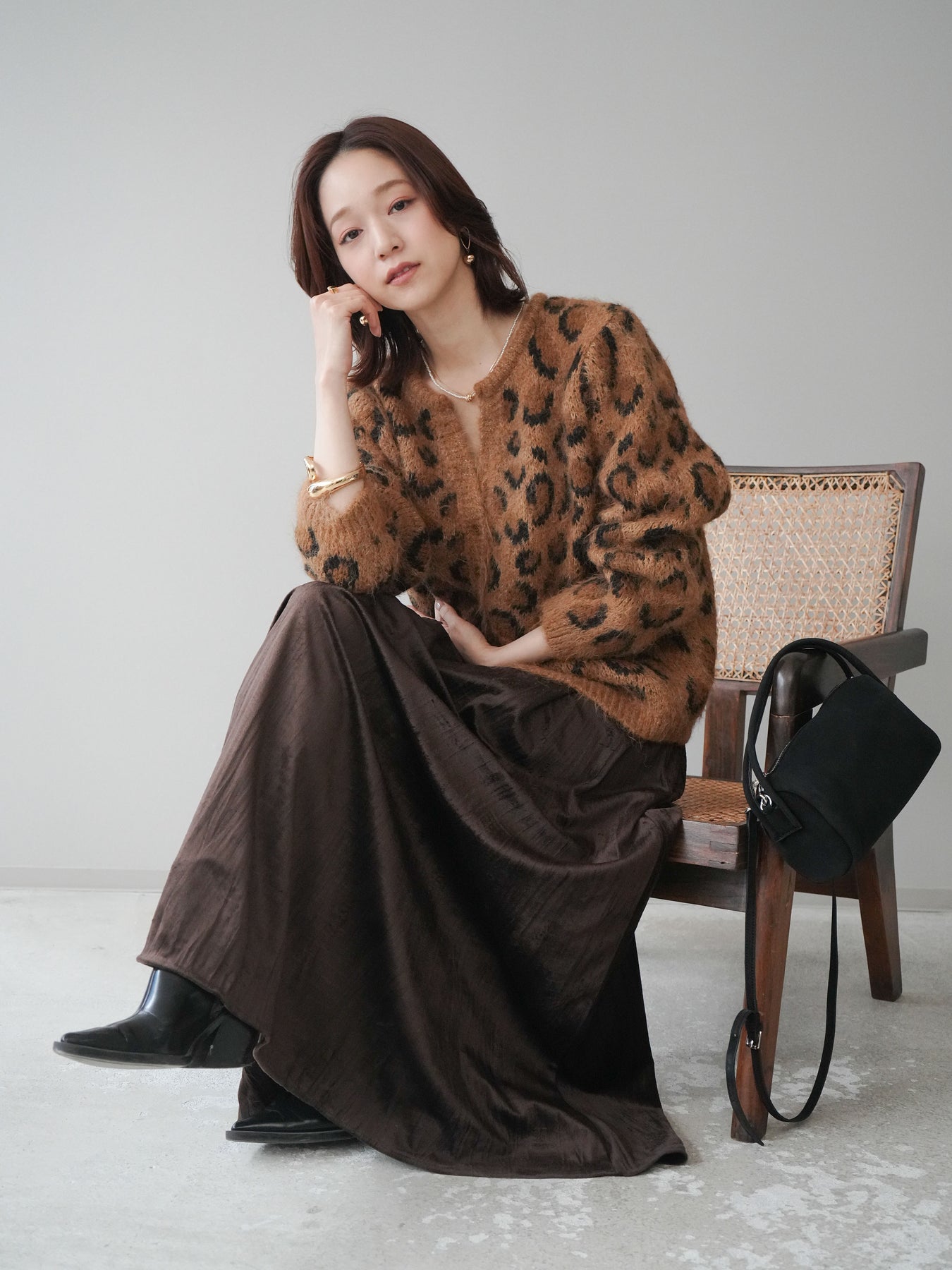 ふんわりとしたモヘアタッチの風合いが季節感を引き立てるレオパード柄ニットカーディガン。程よい厚みで暖かさがありつつ、軽やかな着心地を叶える一枚です。存在感のある柄デザインながらも着ぶくれしにくいバランスに仕上げており、羽織るだけでスタイリング全体がぐっと華やぐのが魅力。カジュアルからフェミニンまで幅広いコーデに取り入れやすく、シンプルなアイテムに合わせるだけでこなれたムードを演出できます。 ※ボトムス、キャミソール(インナー)以外の商品は一律でインナーは付属していません。