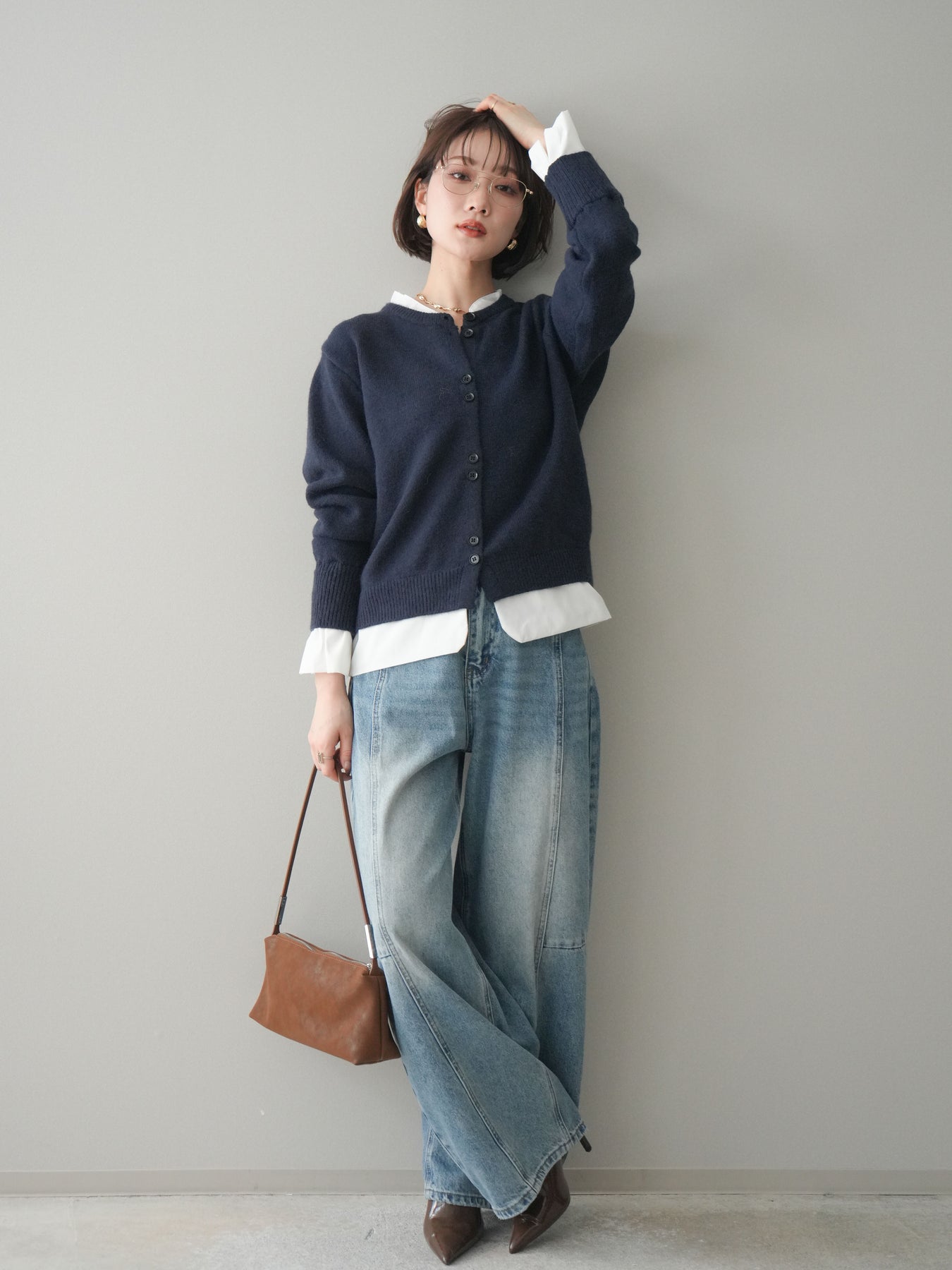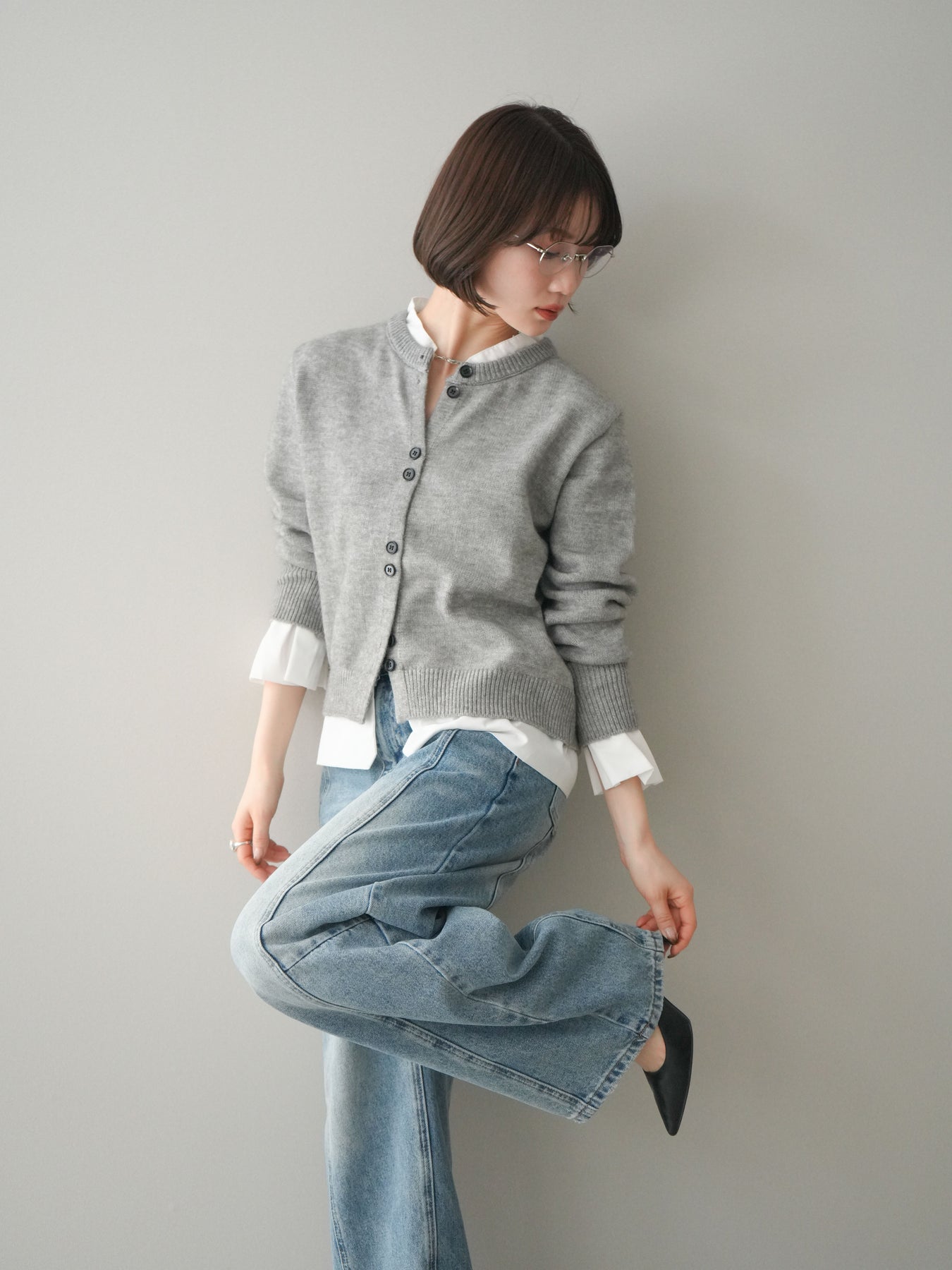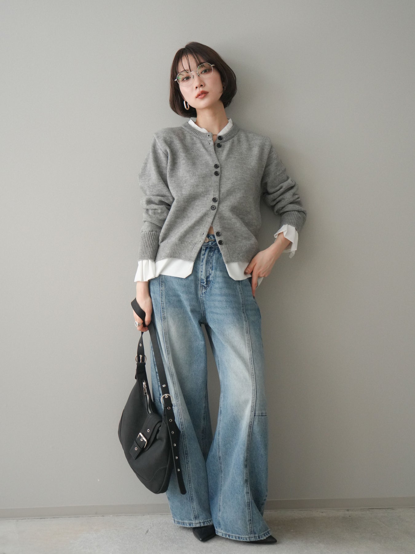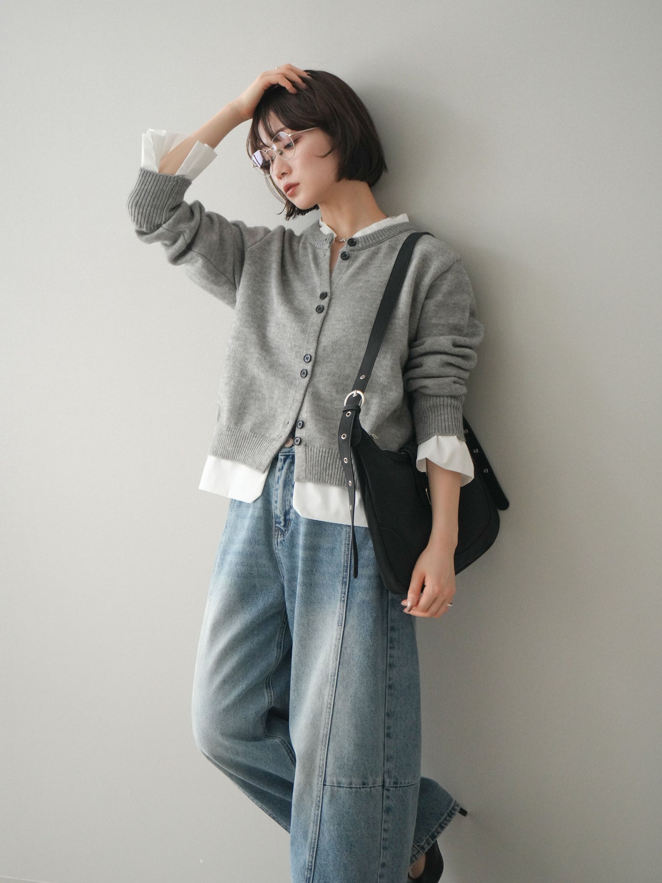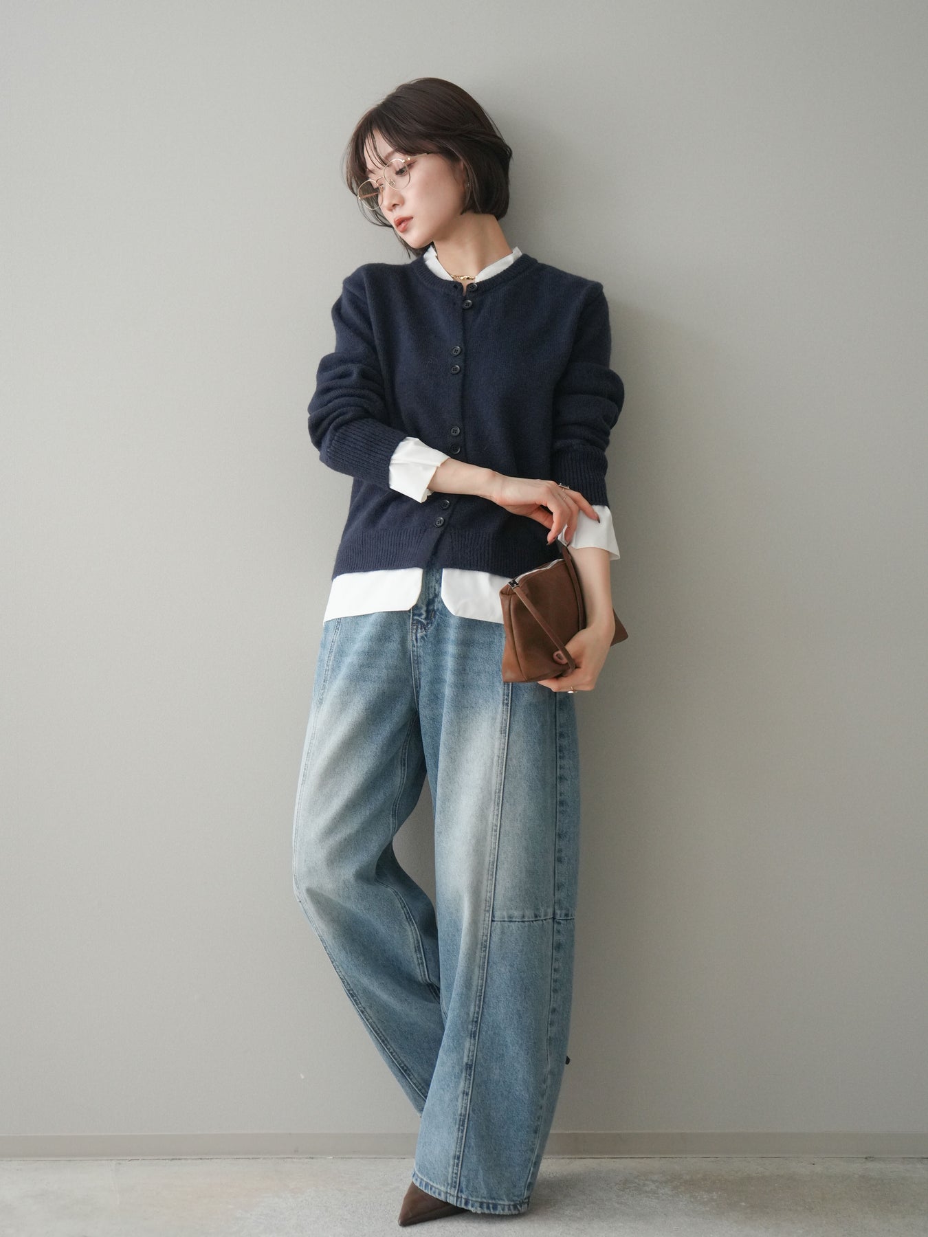 [SET]布帛ドッキングニットカーディガン+ガーメントウォッシュカーブデニムパンツ(2set)