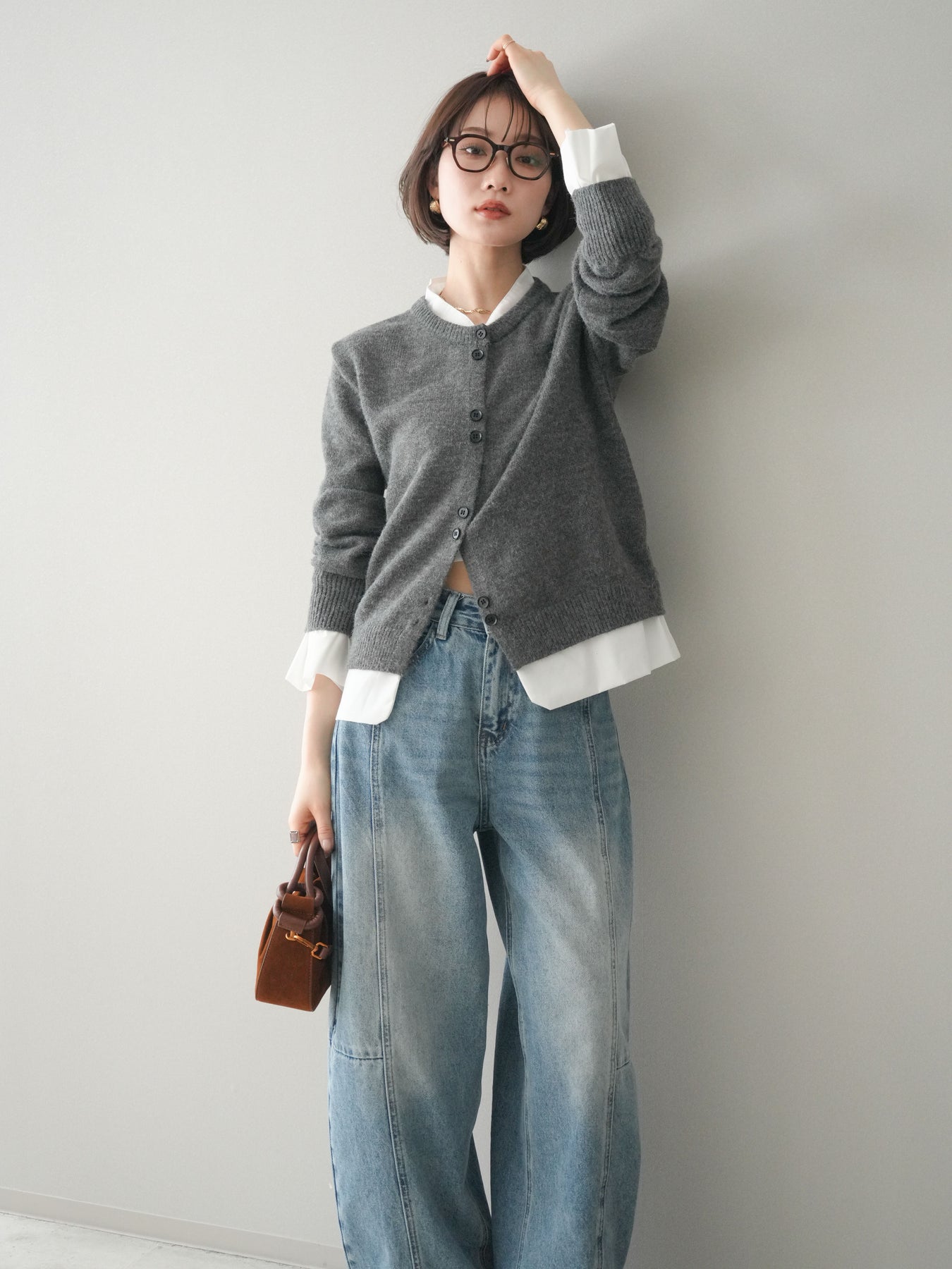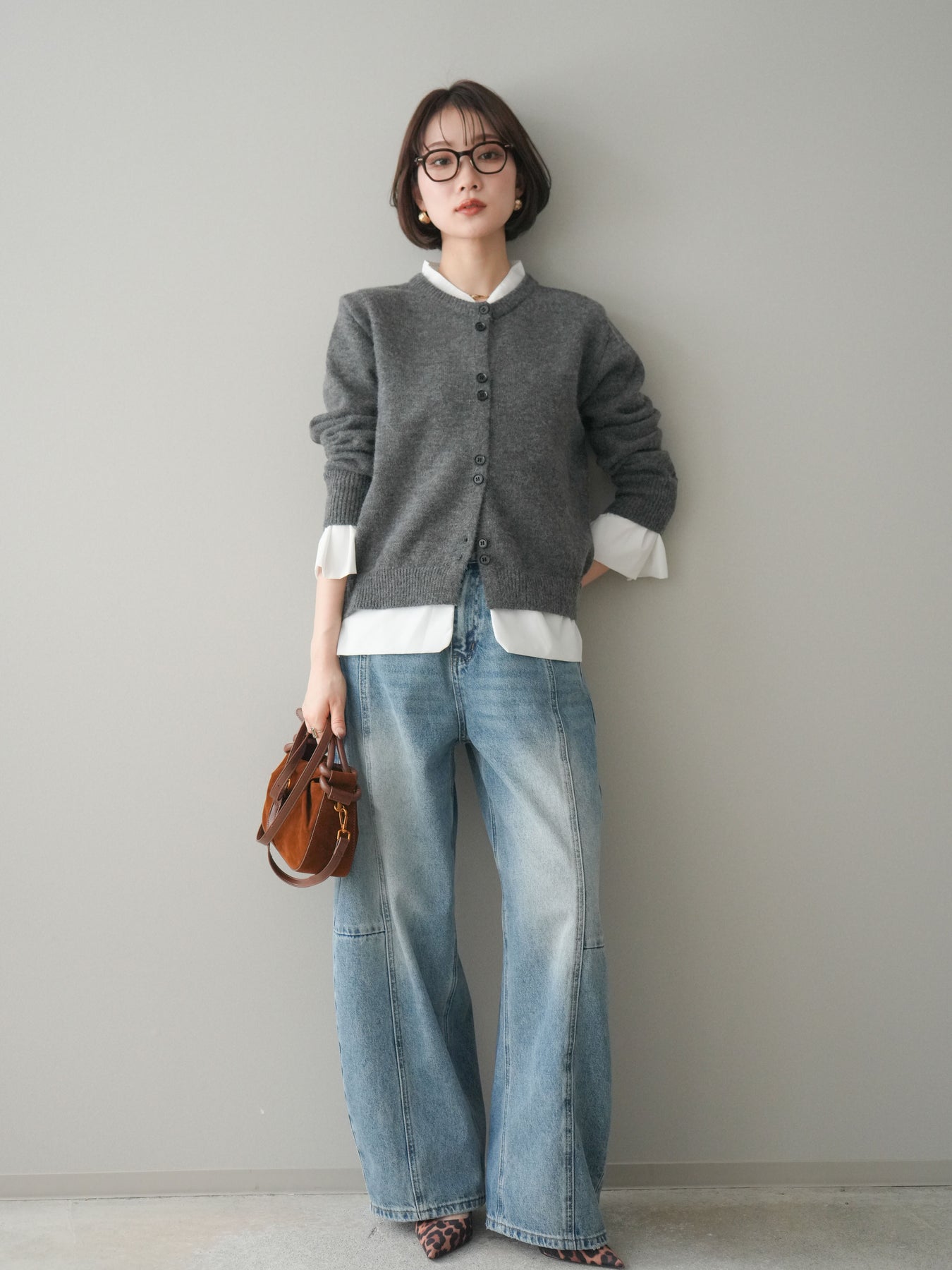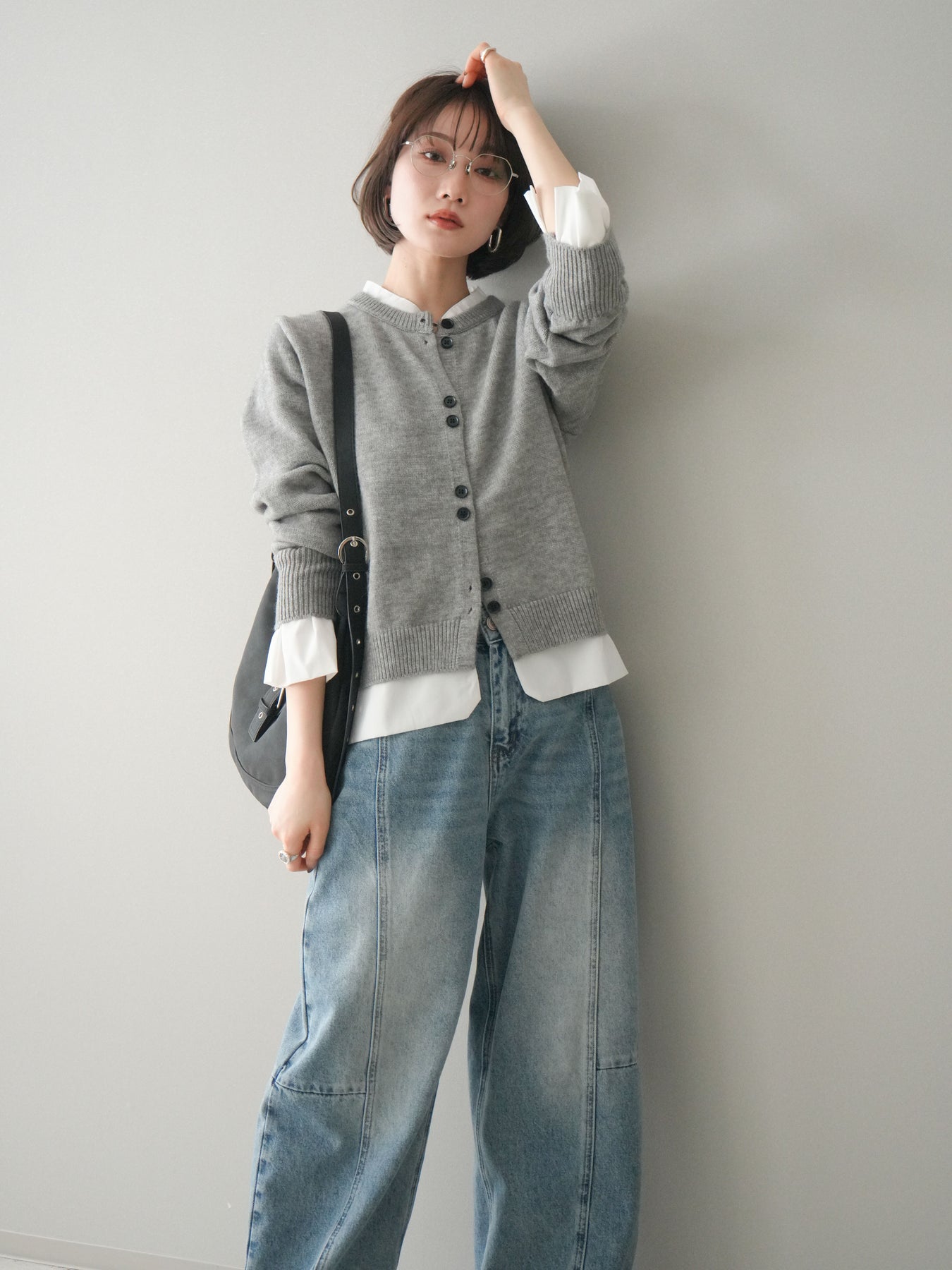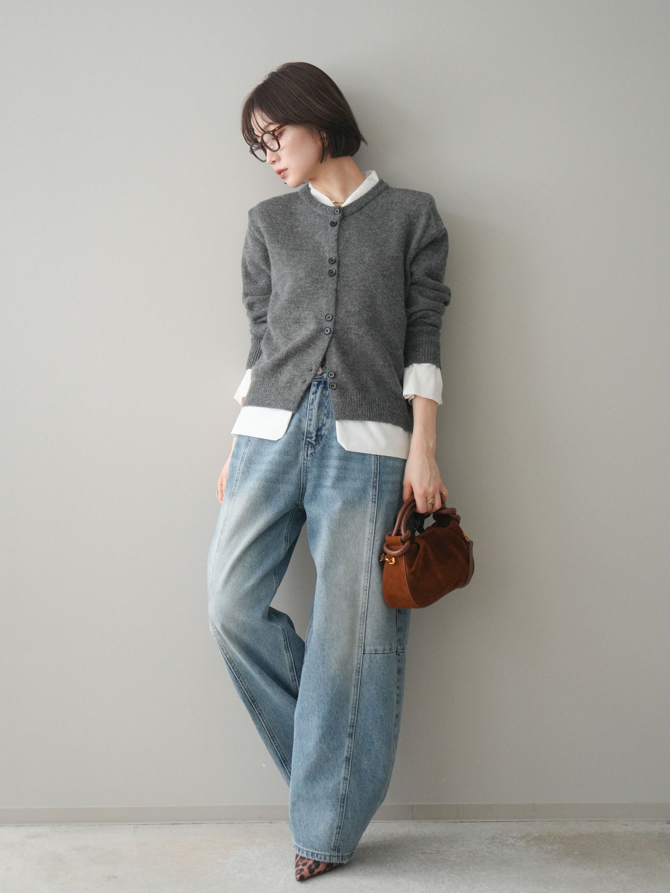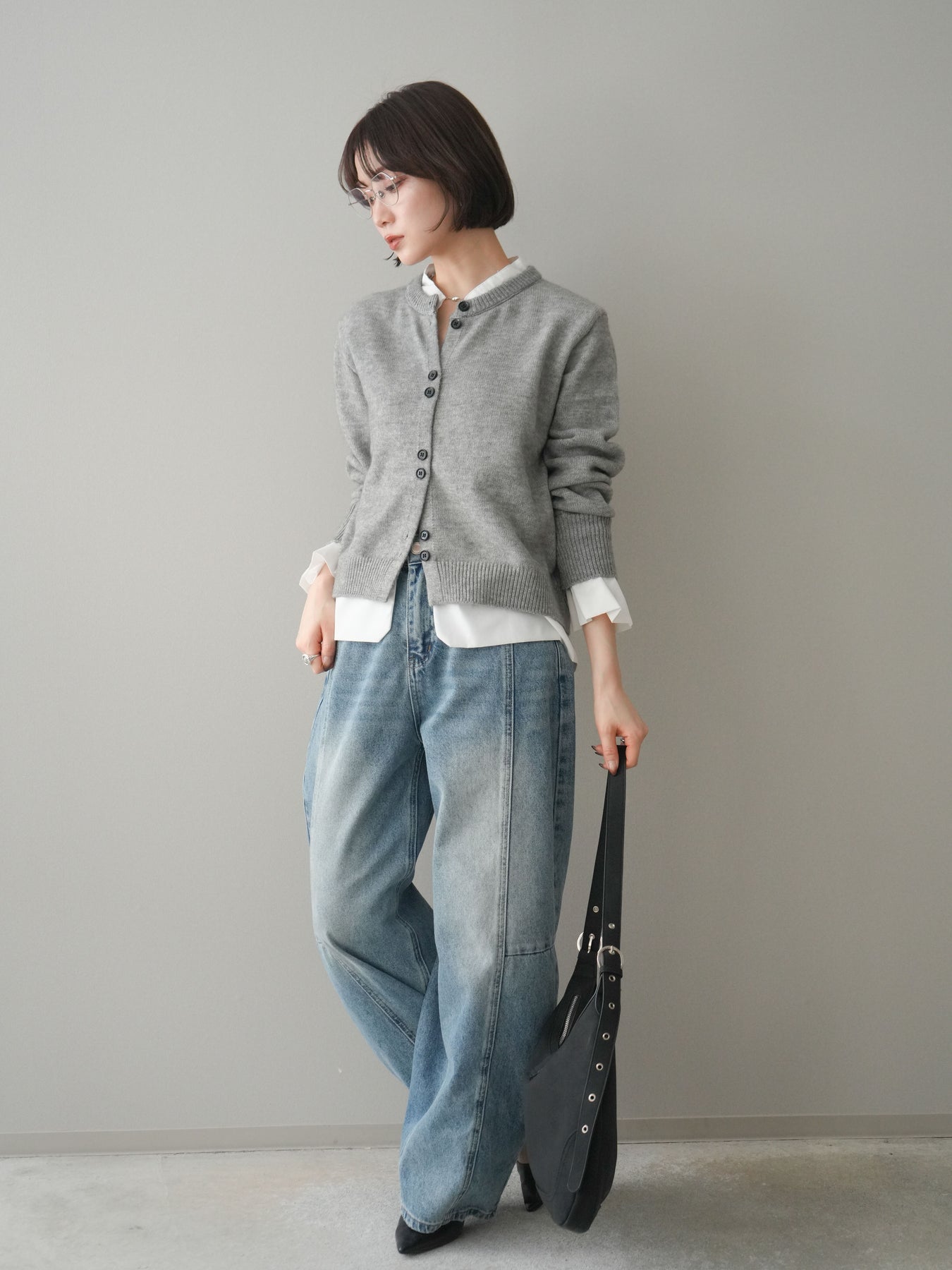 [SET]布帛ドッキングニットカーディガン+ガーメントウォッシュカーブデニムパンツ(2set)