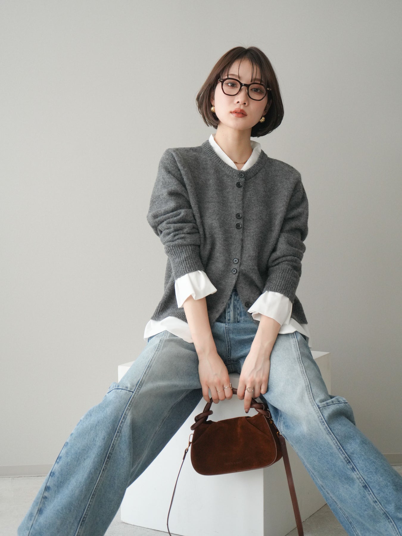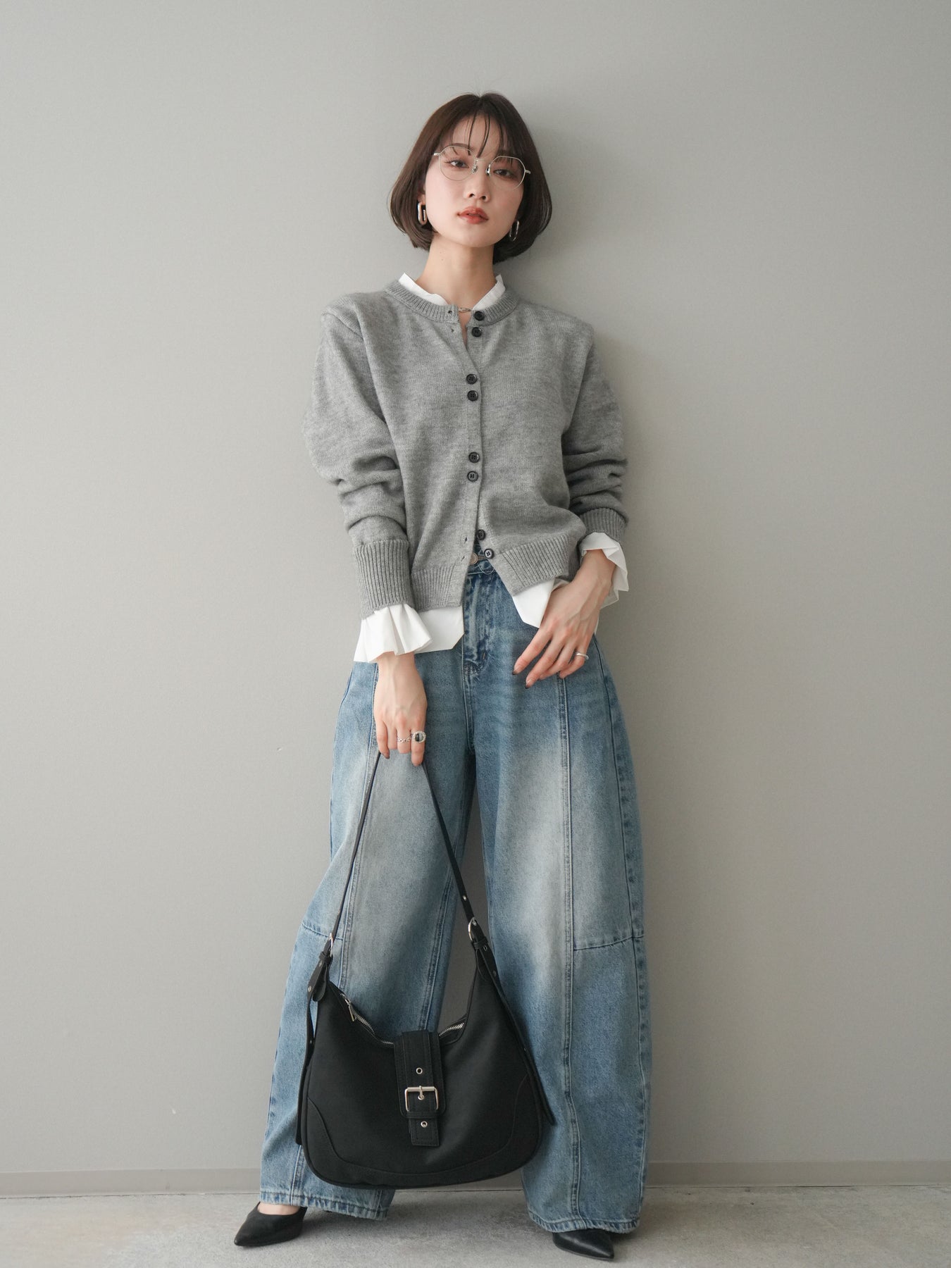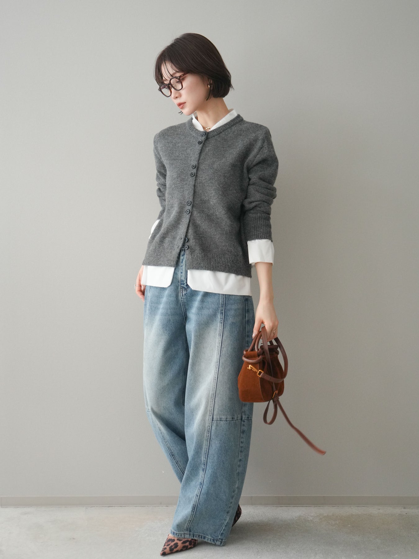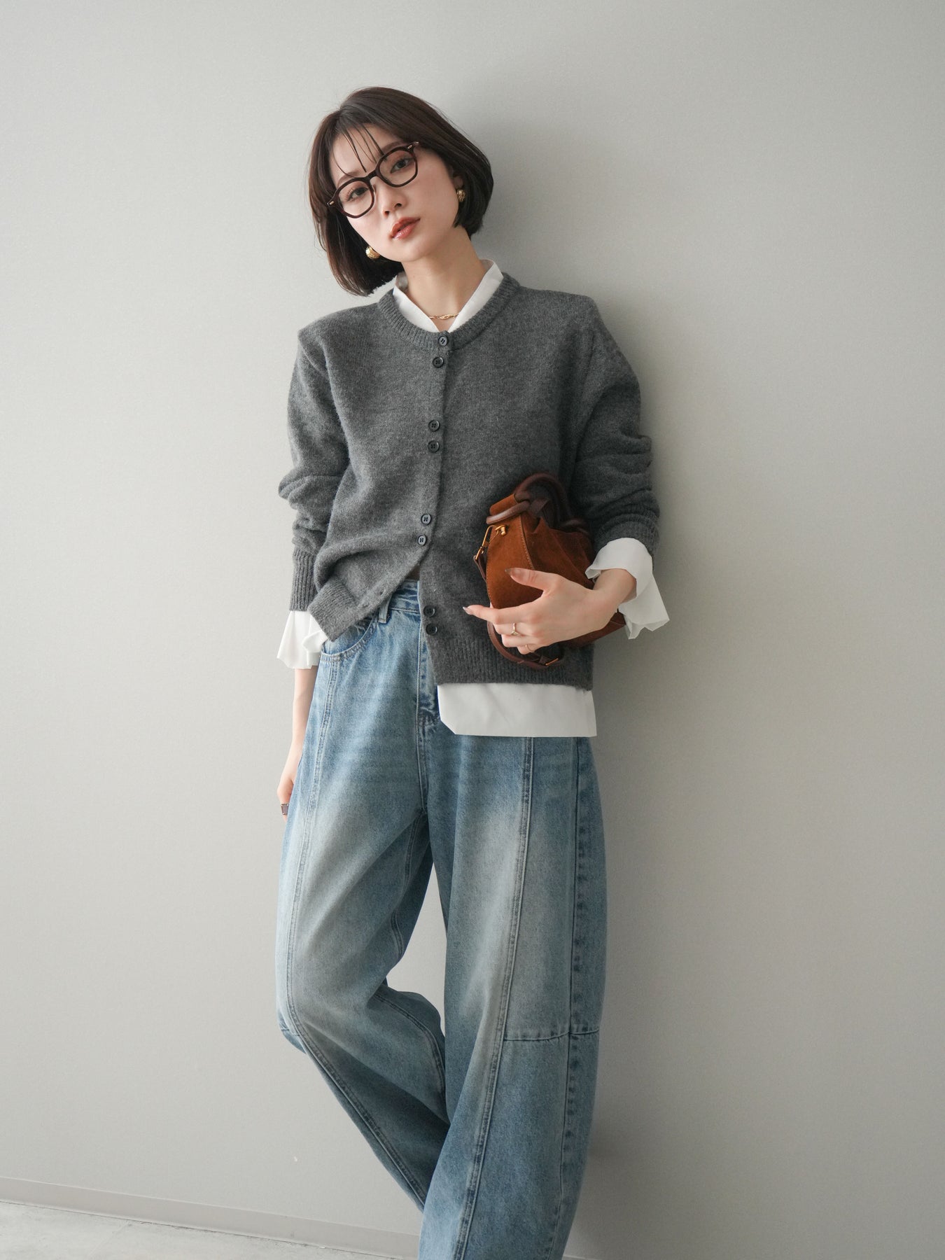 [SET]布帛ドッキングニットカーディガン+ガーメントウォッシュカーブデニムパンツ(2set)