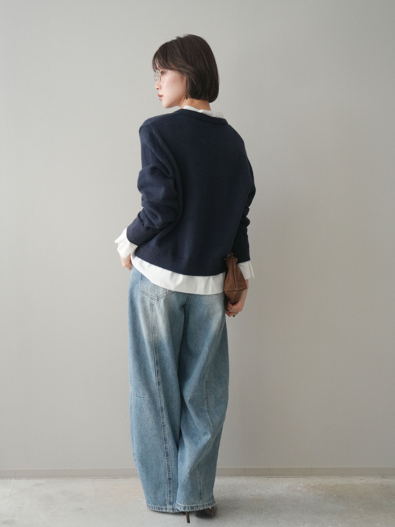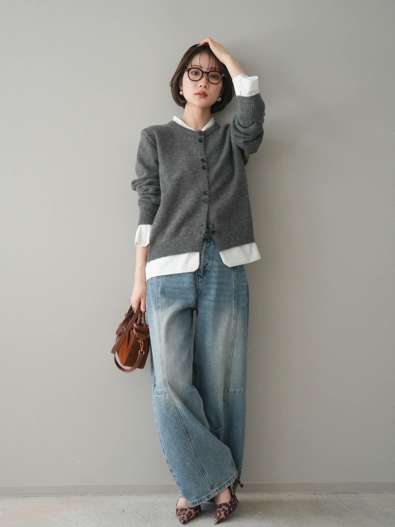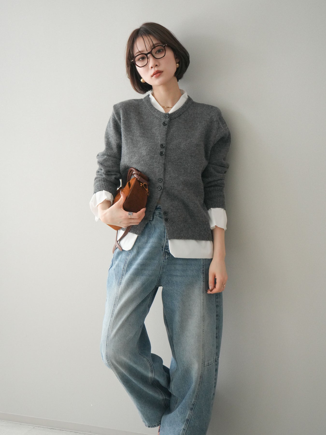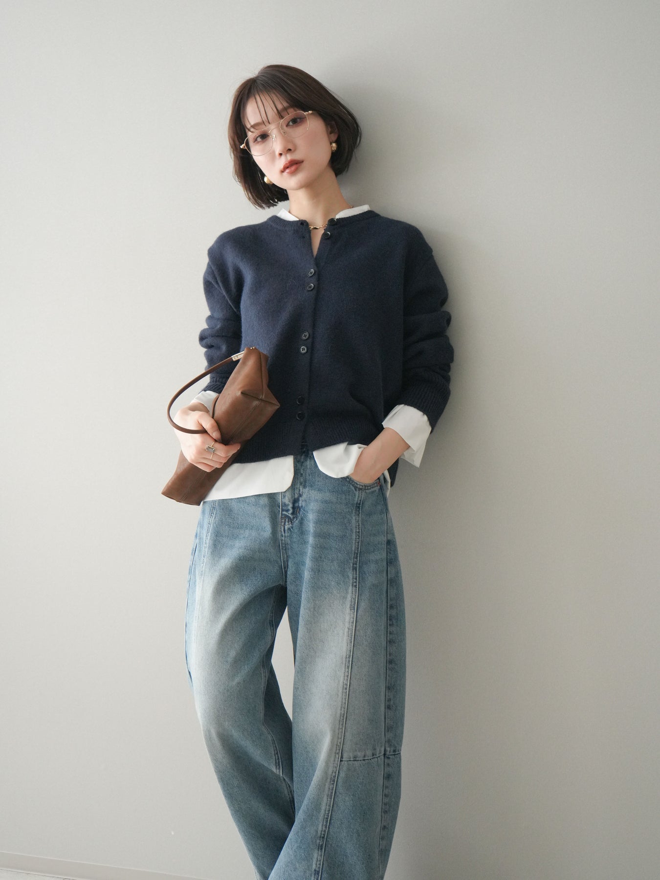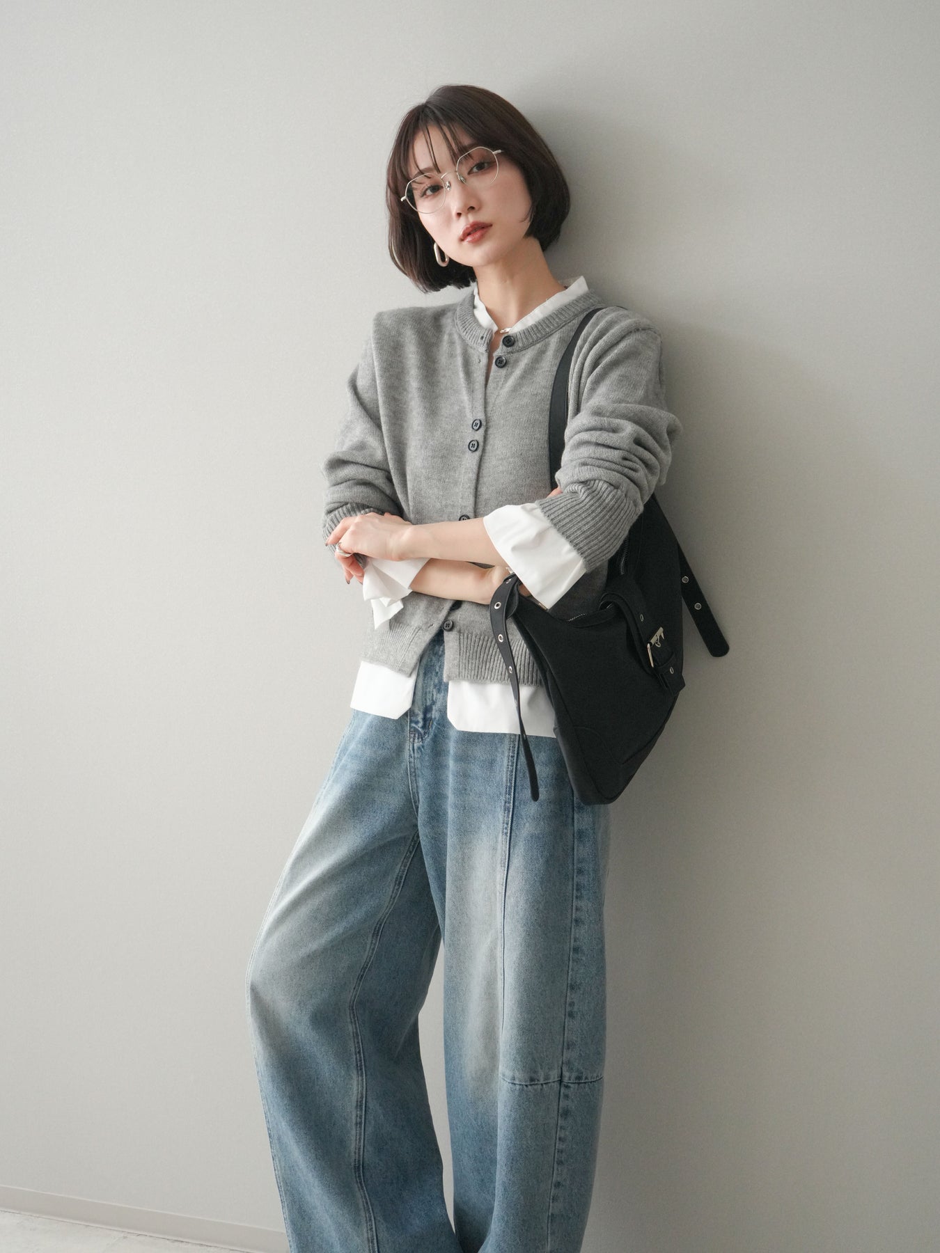 [SET]布帛ドッキングニットカーディガン+ガーメントウォッシュカーブデニムパンツ(2set)