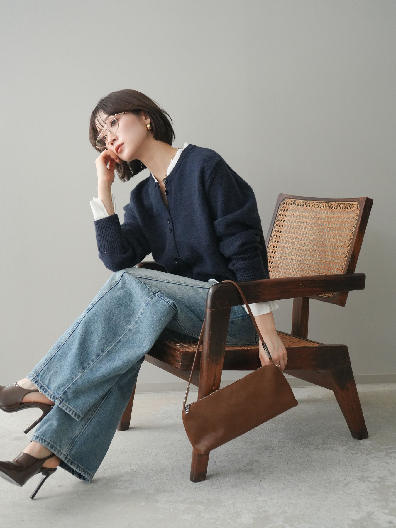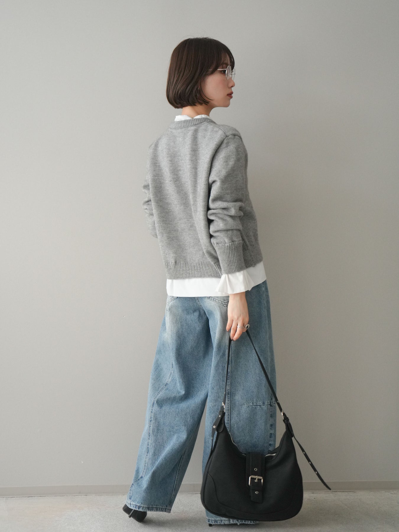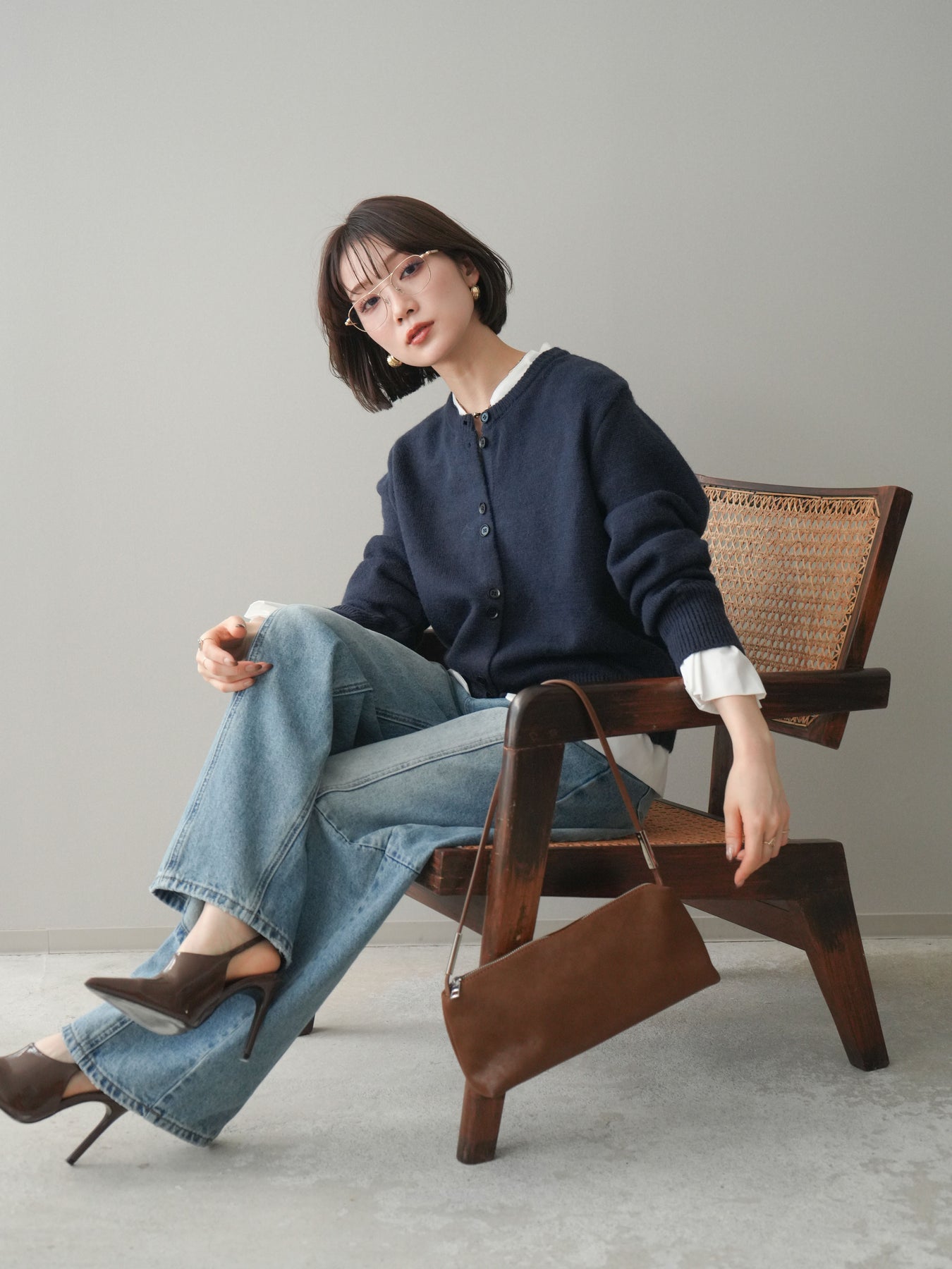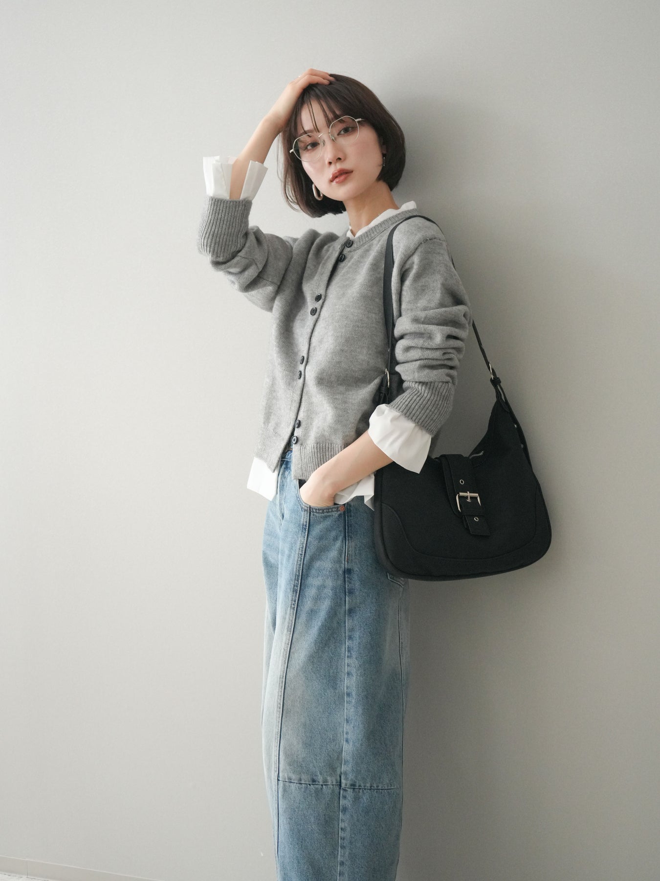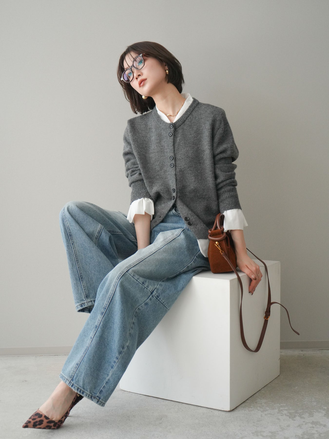 [SET]布帛ドッキングニットカーディガン+ガーメントウォッシュカーブデニムパンツ(2set)