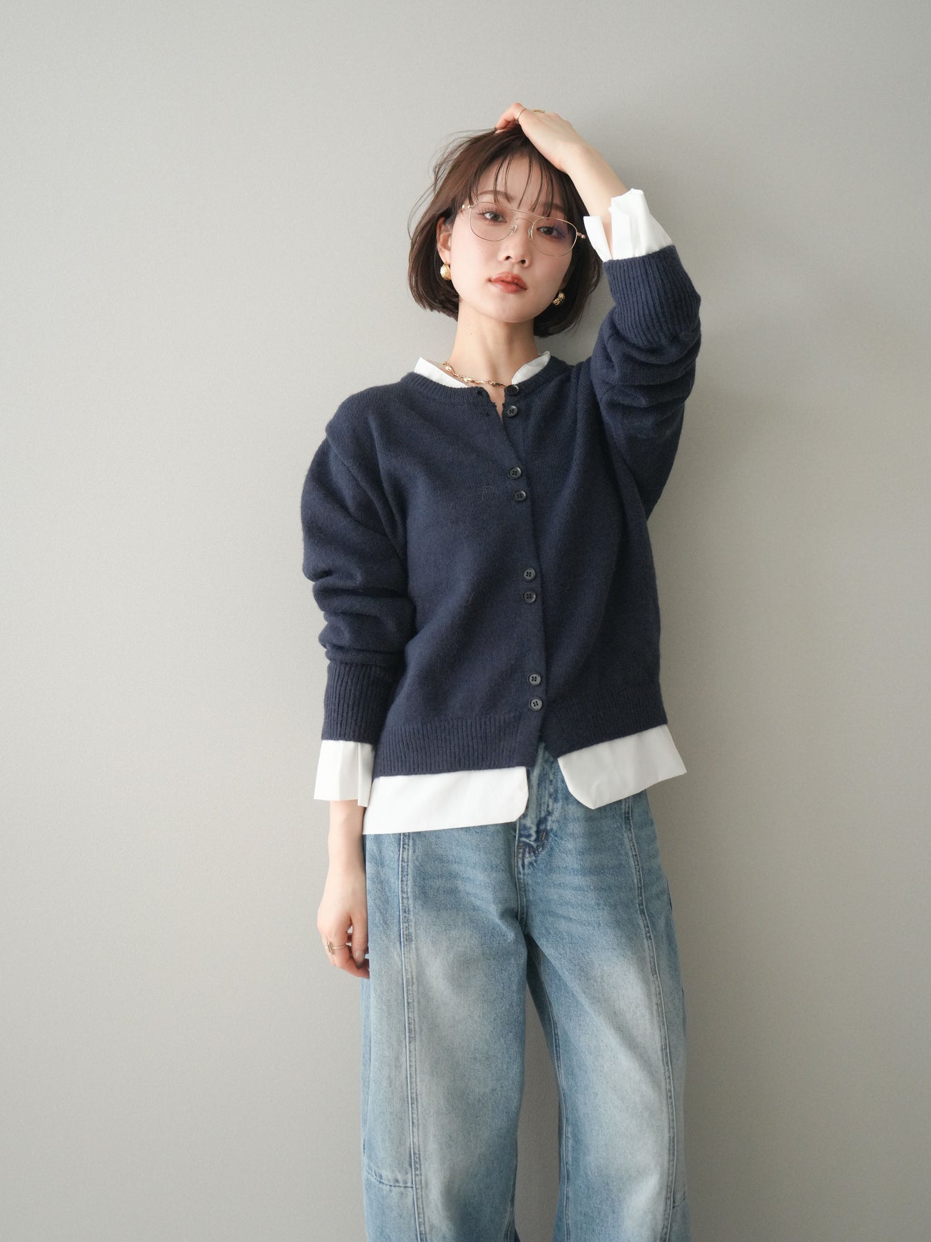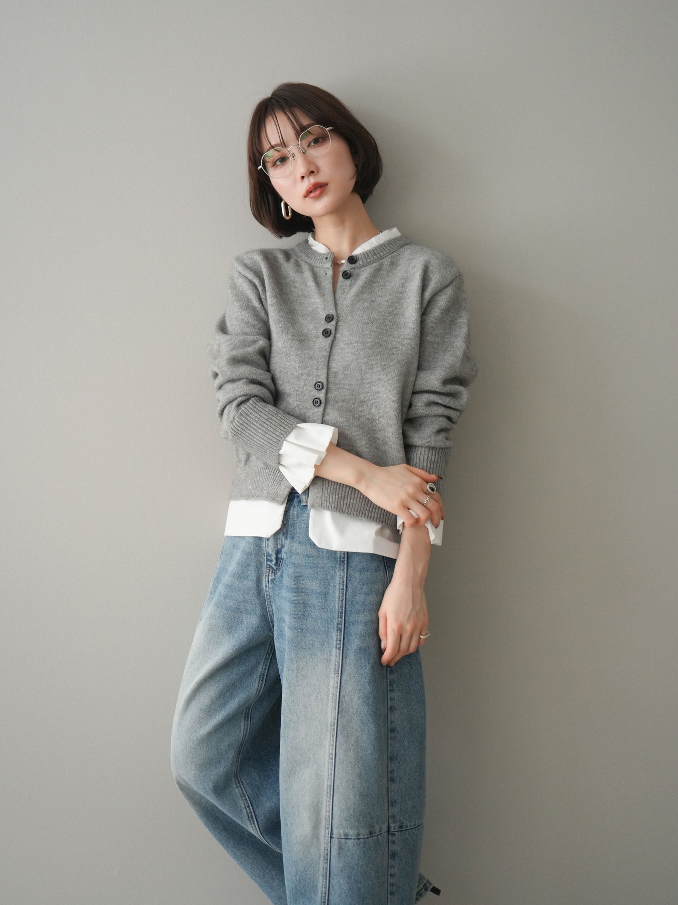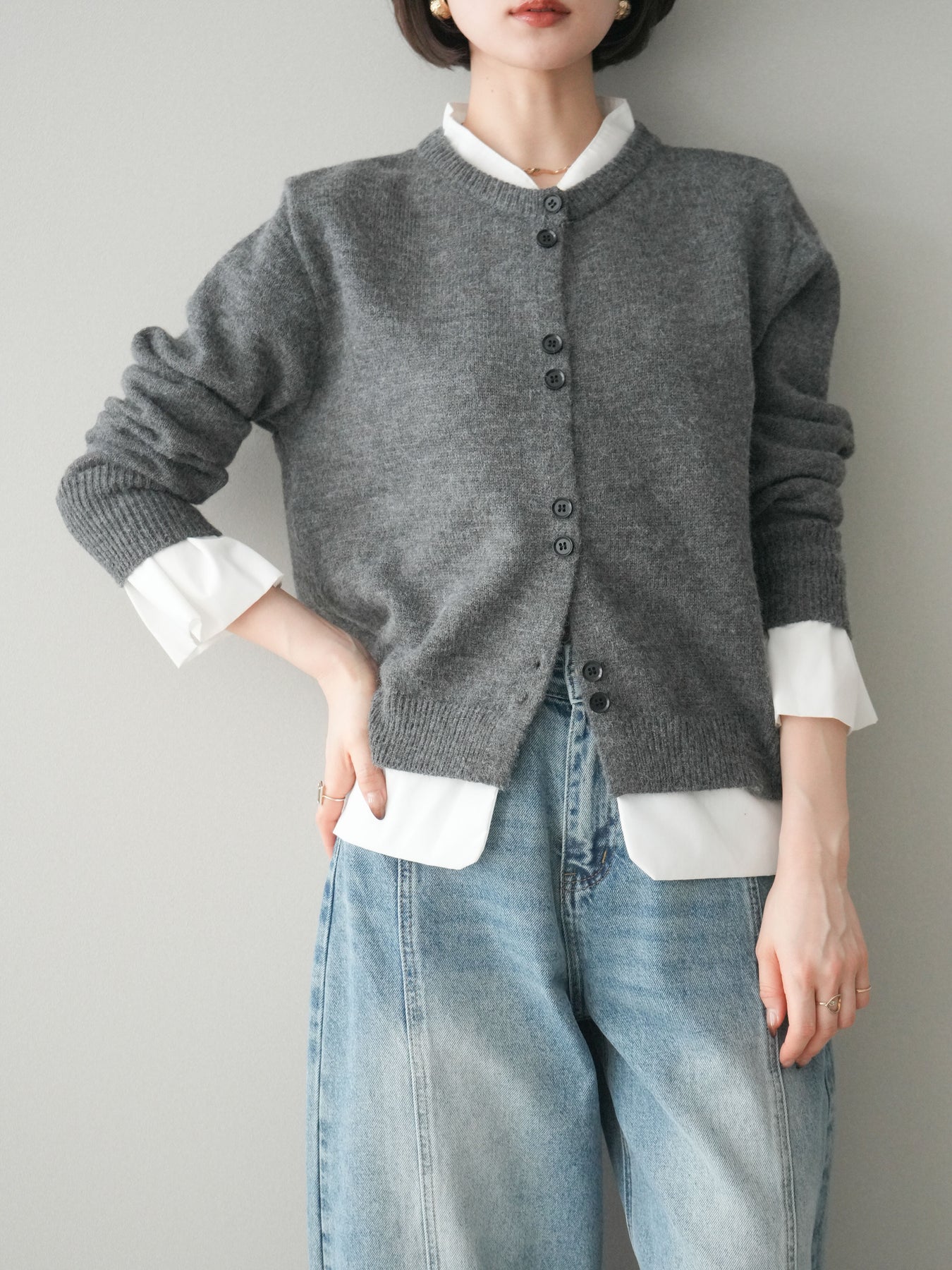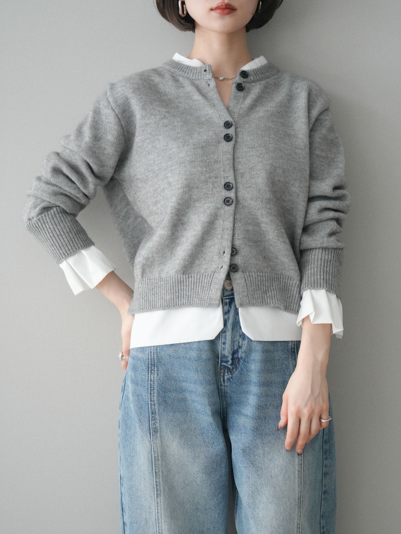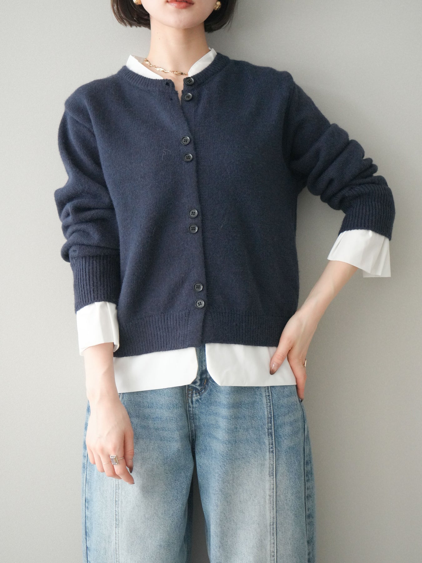 ニットと布帛素材を組み合わせた、レイヤード風デザインが魅力のニットカーディガン。襟元や裾、袖口から覗く布帛ディテールが、シンプルなニットスタイルに程よいきちんと感と軽やかさをプラスします。前を留めてトップスとしても、羽織りとしても着用でき、コーディネートの幅が広がる一着。程よくゆとりのあるシルエットで体のラインを拾いにくく、デイリーからお出かけまで幅広いシーンで活躍します。 ※ボトムス、キャミソール(インナー)以外の商品は一律でインナーは付属していません。