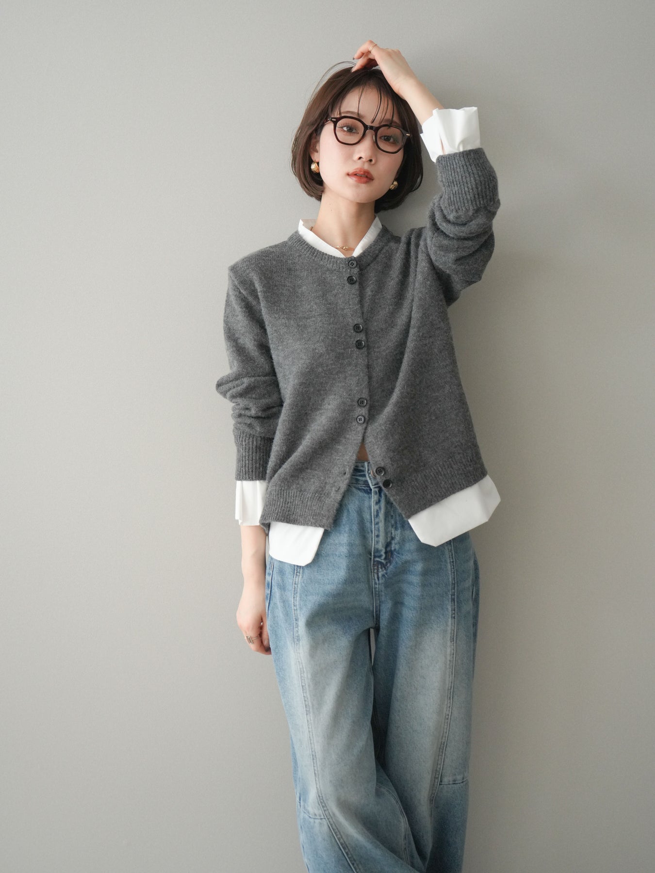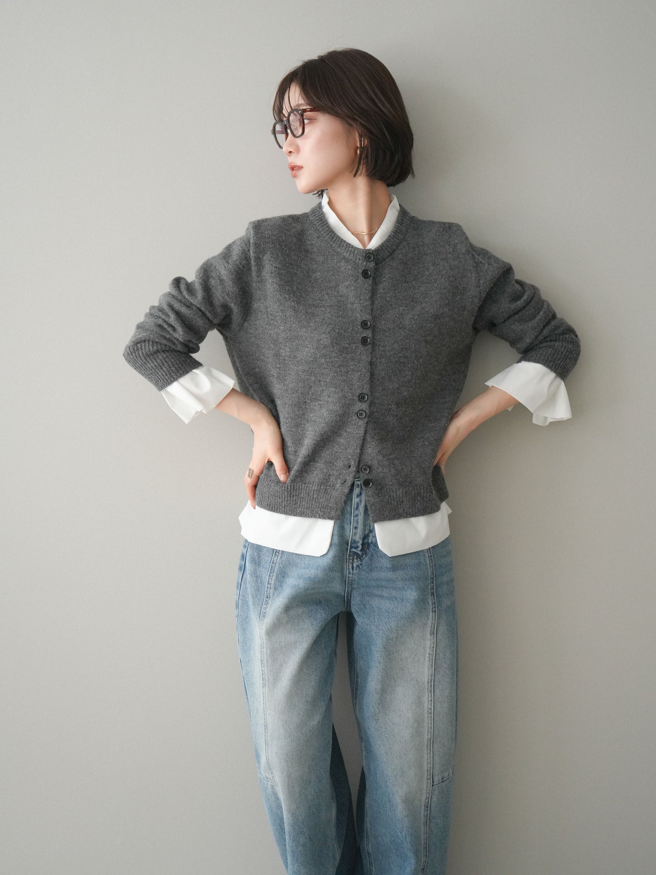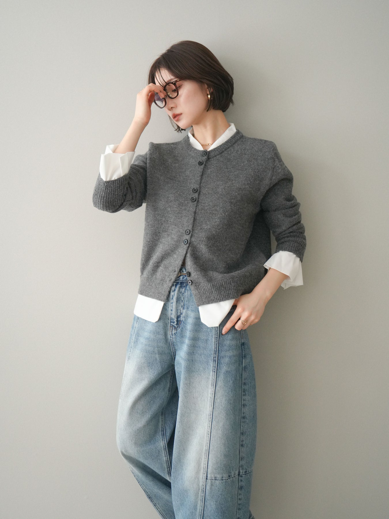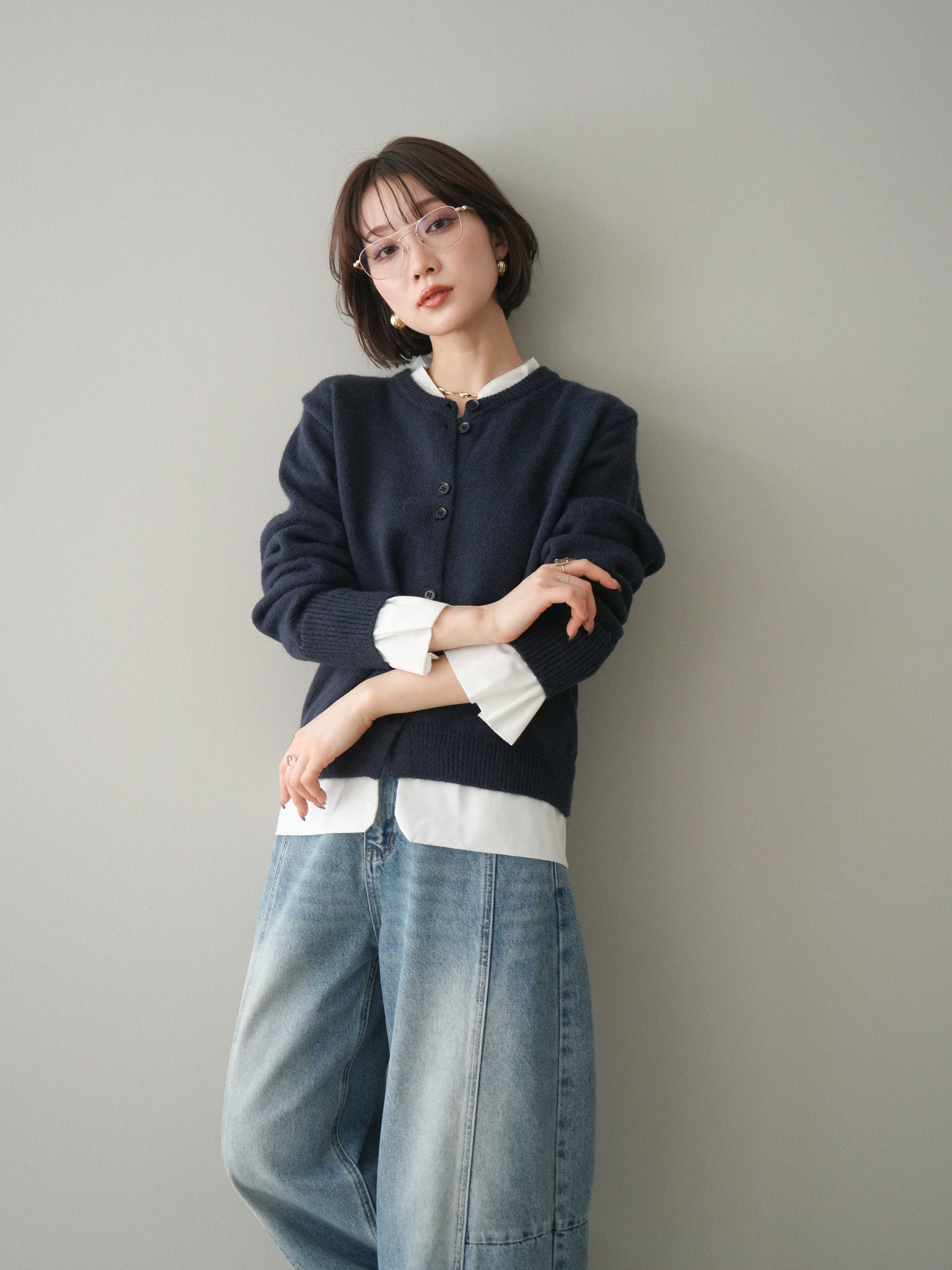 ニットと布帛素材を組み合わせた、レイヤード風デザインが魅力のニットカーディガン。襟元や裾、袖口から覗く布帛ディテールが、シンプルなニットスタイルに程よいきちんと感と軽やかさをプラスします。前を留めてトップスとしても、羽織りとしても着用でき、コーディネートの幅が広がる一着。程よくゆとりのあるシルエットで体のラインを拾いにくく、デイリーからお出かけまで幅広いシーンで活躍します。 ※ボトムス、キャミソール(インナー)以外の商品は一律でインナーは付属していません。