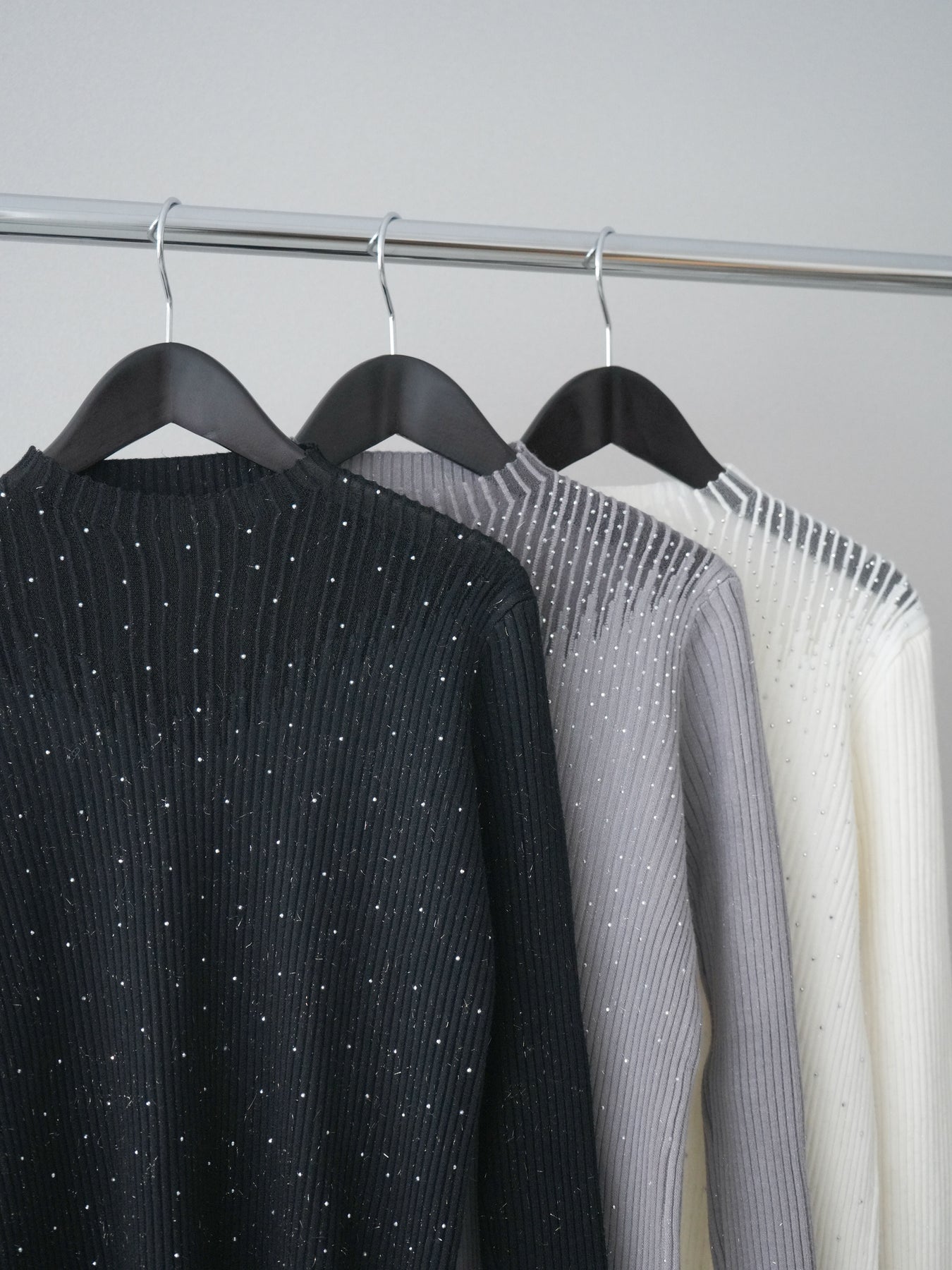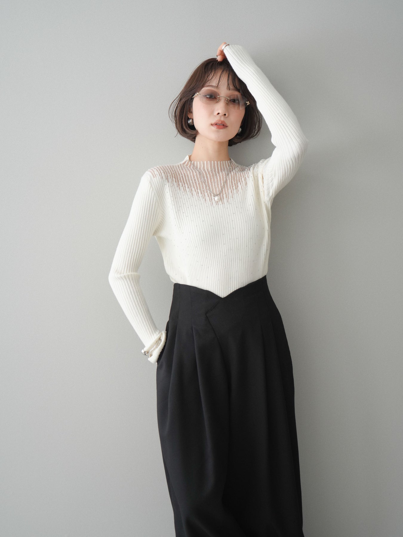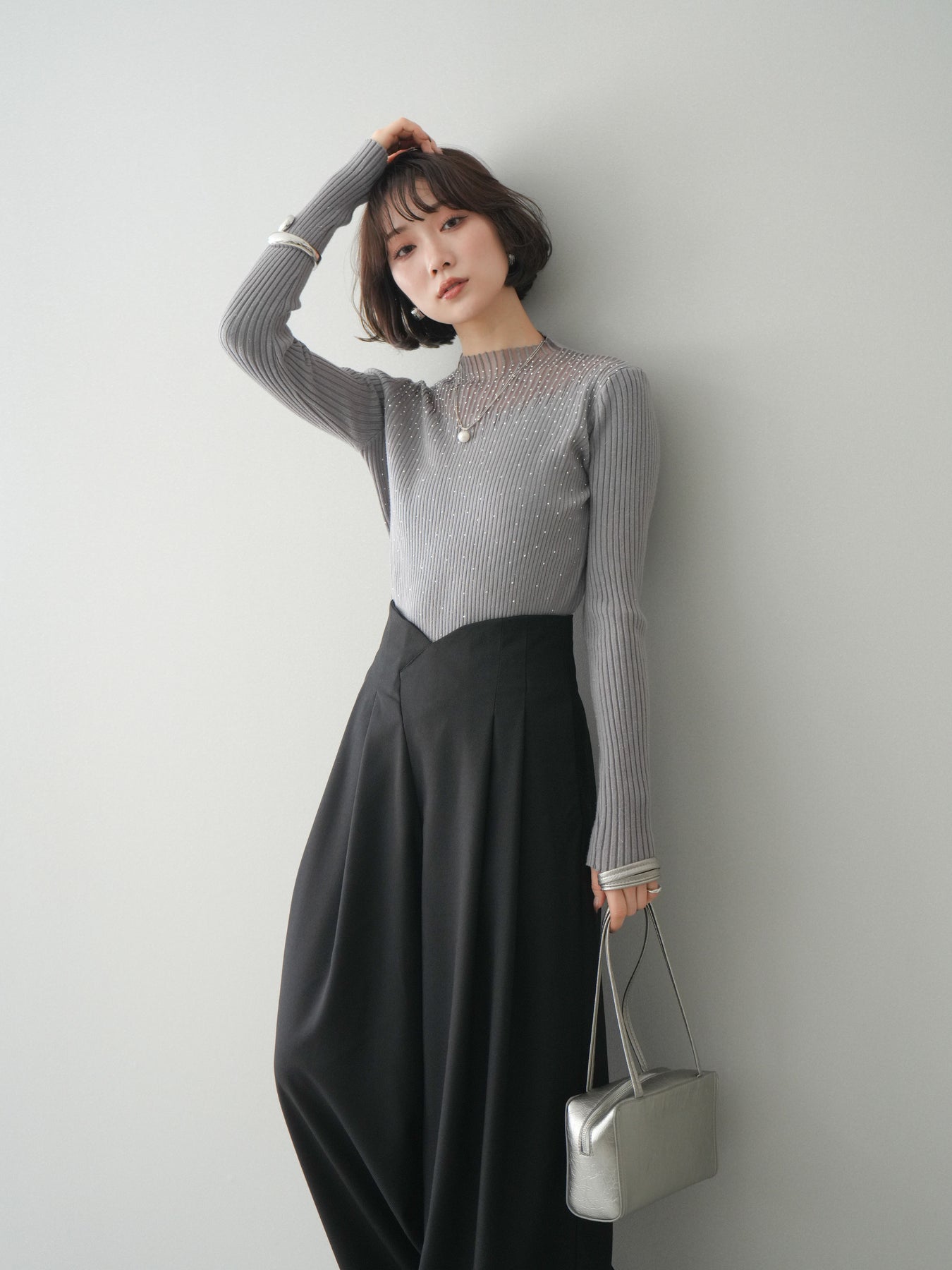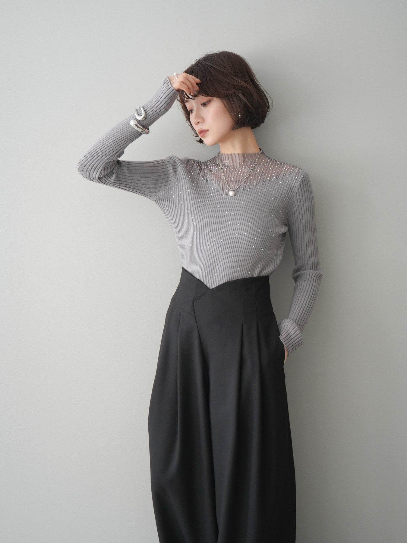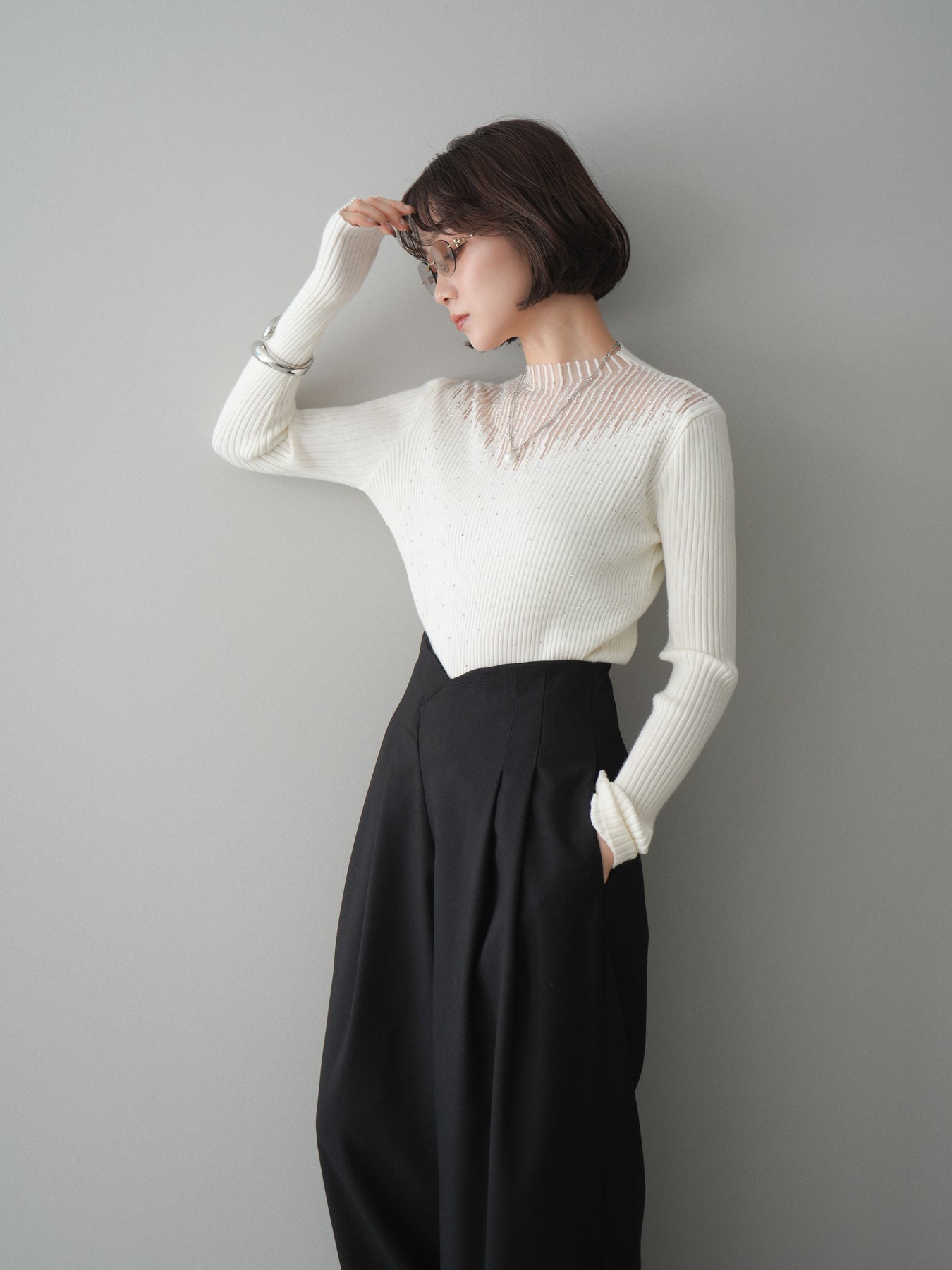◆ [予約]シアー切替スパンコールリブニットトップス