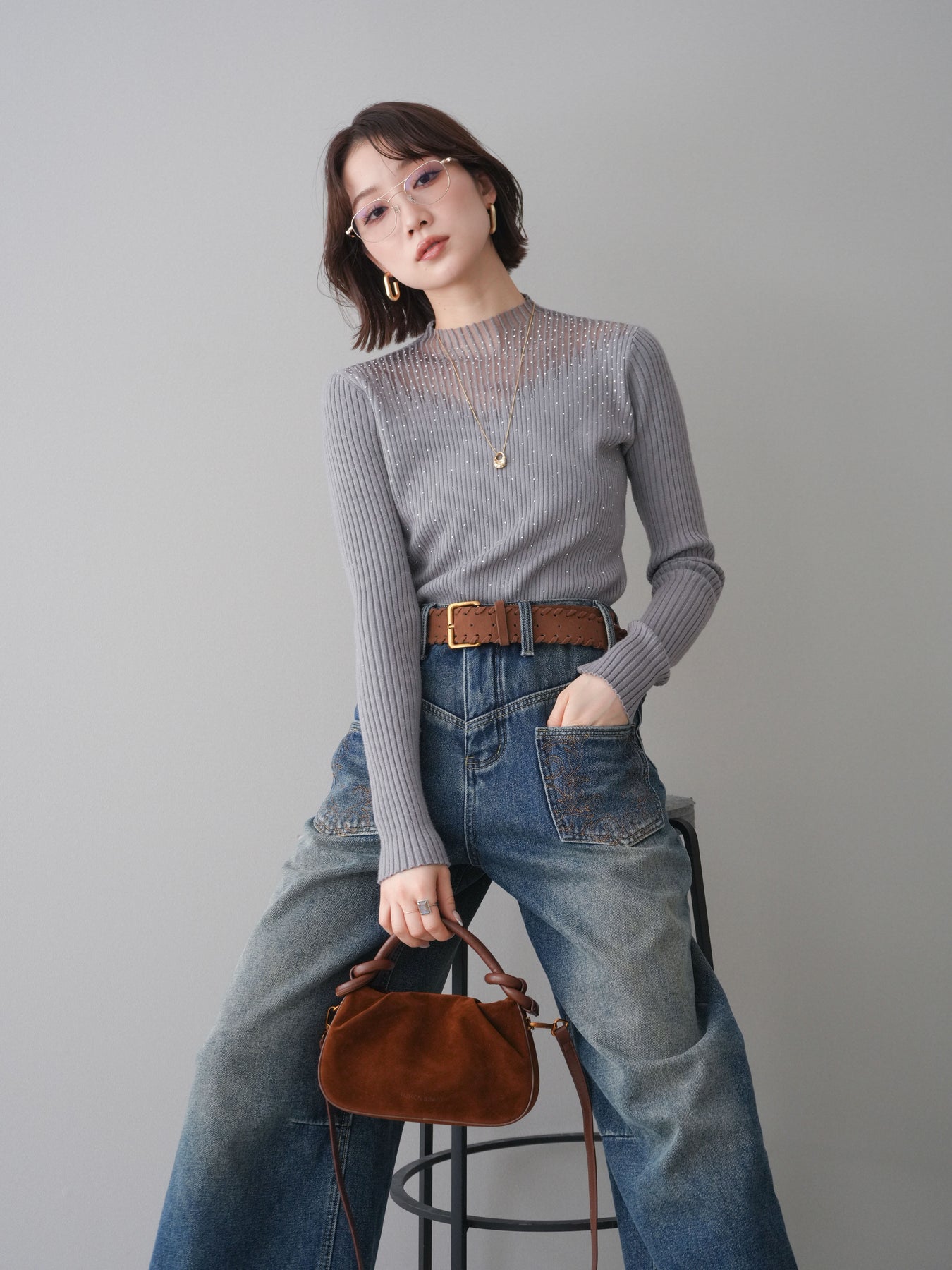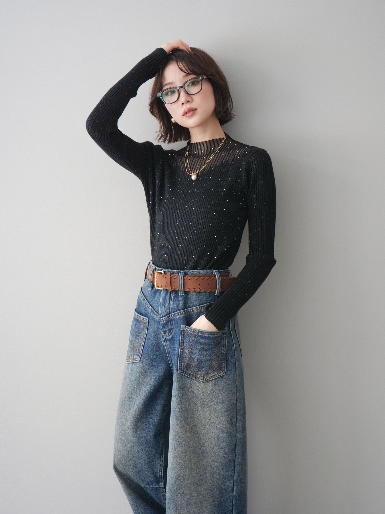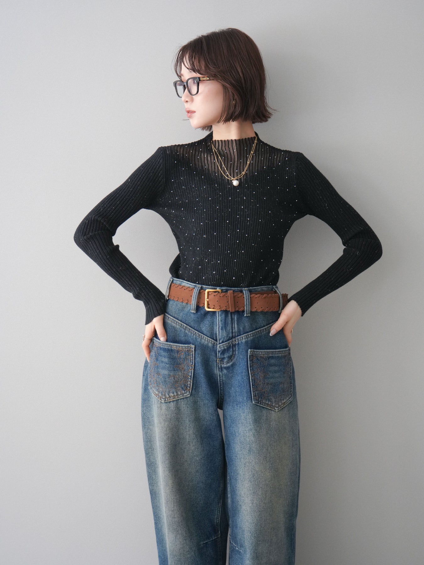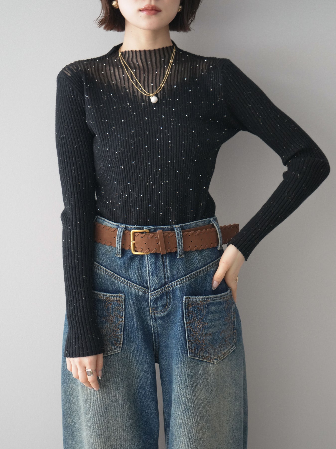 ◆ [予約]シアー切替スパンコールリブニットトップス