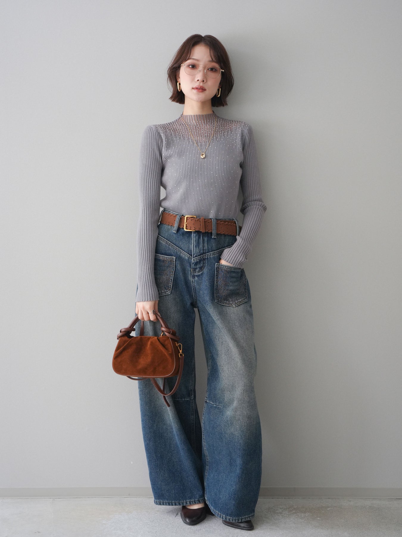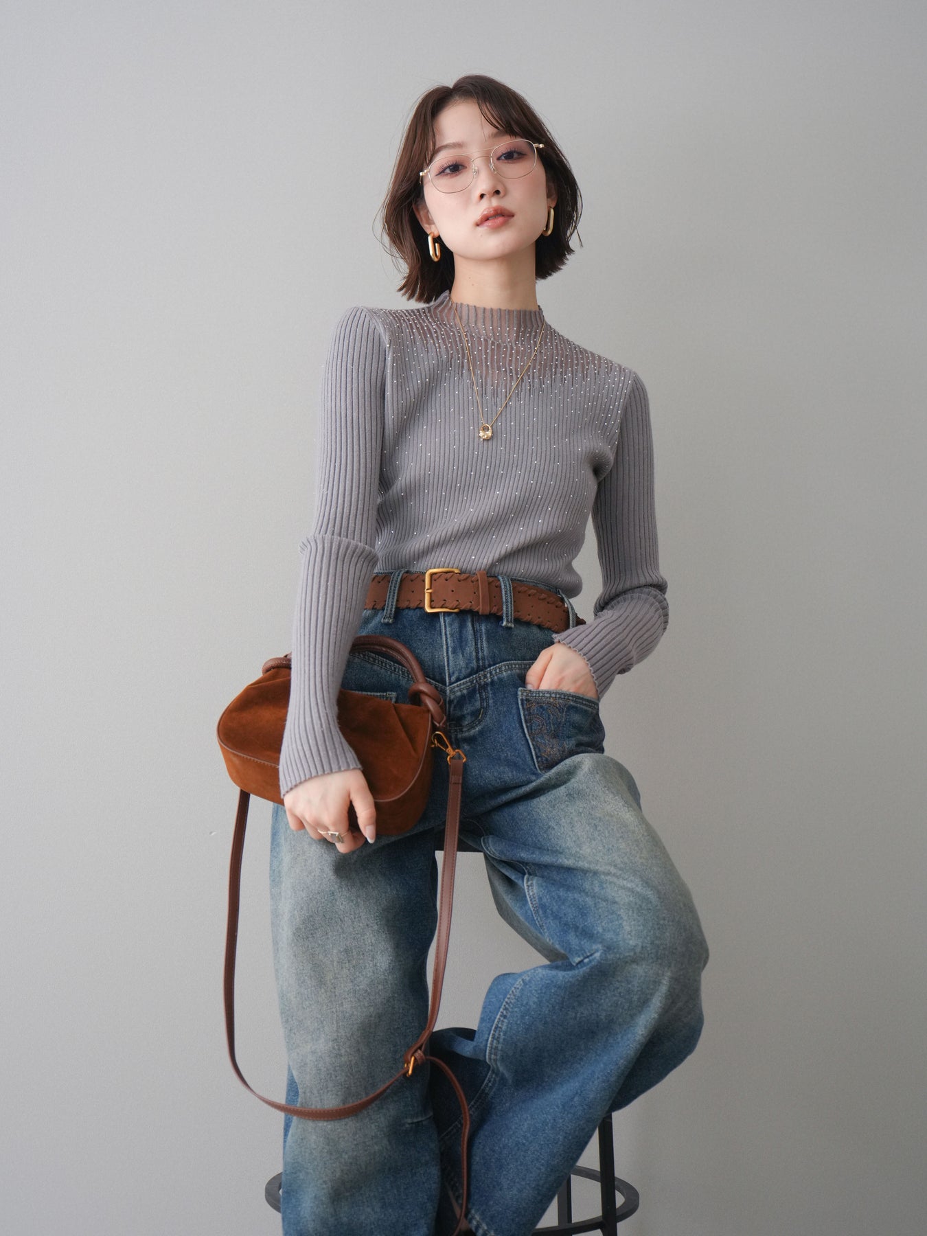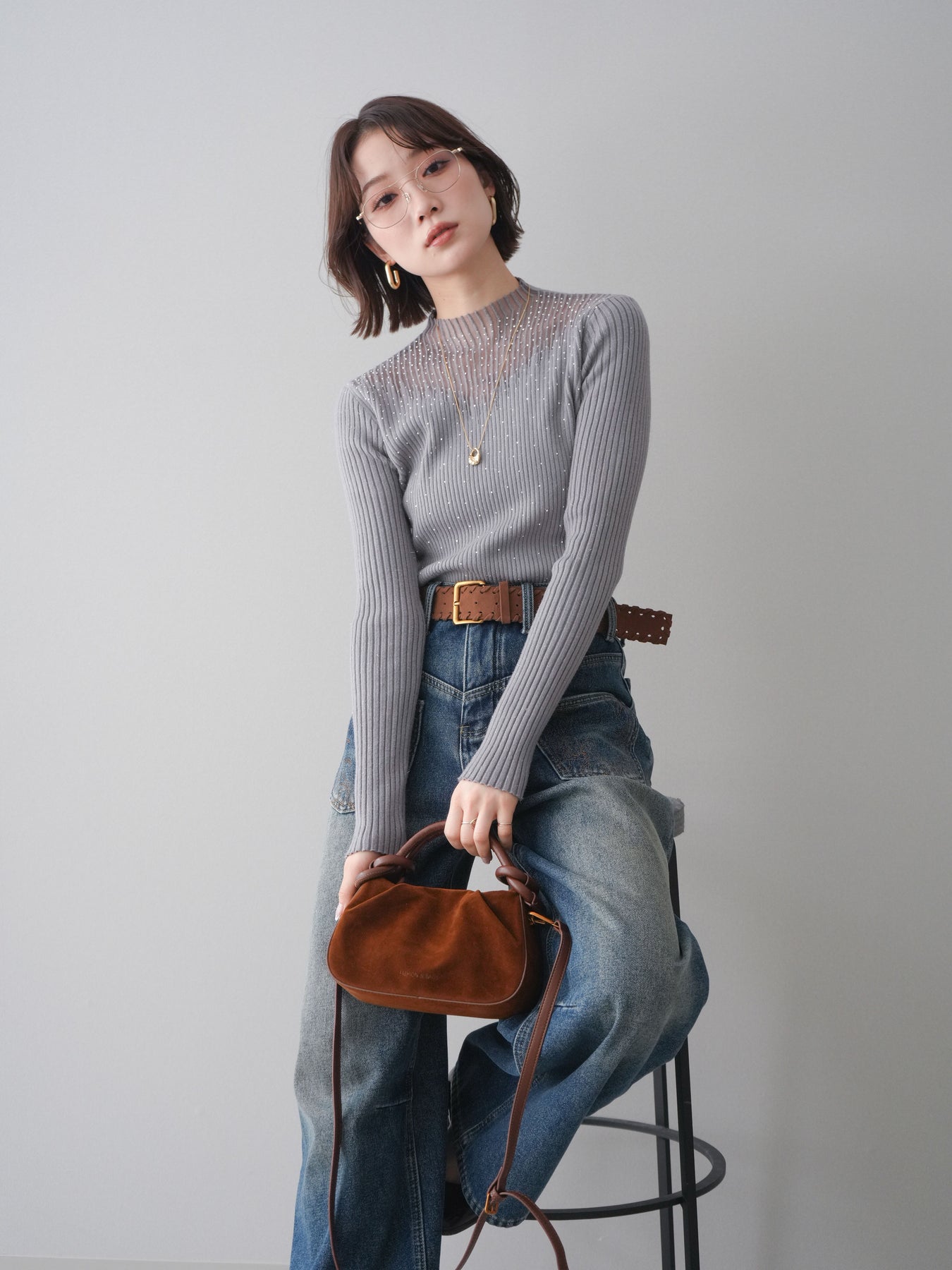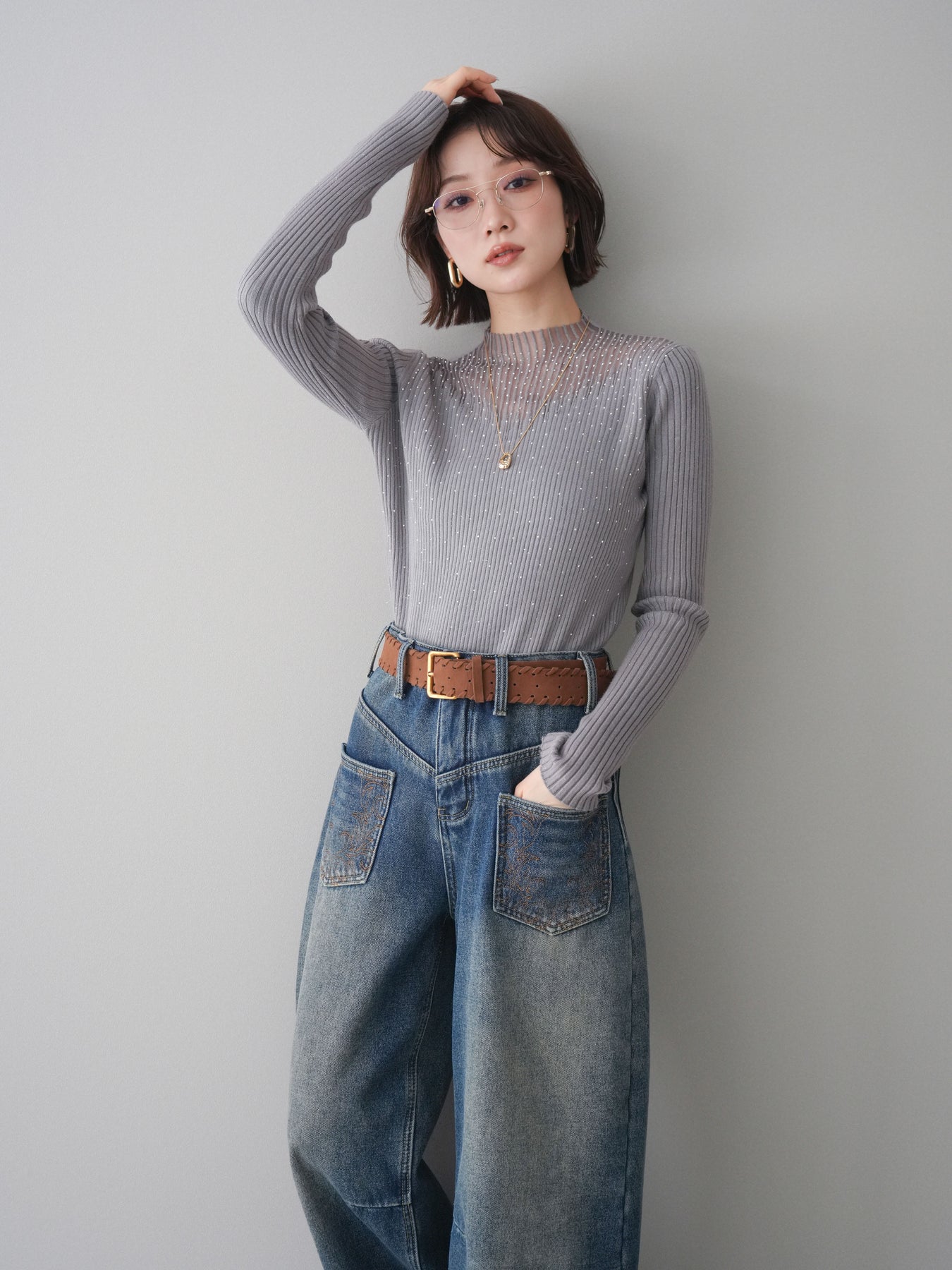◆ [予約]シアー切替スパンコールリブニットトップス