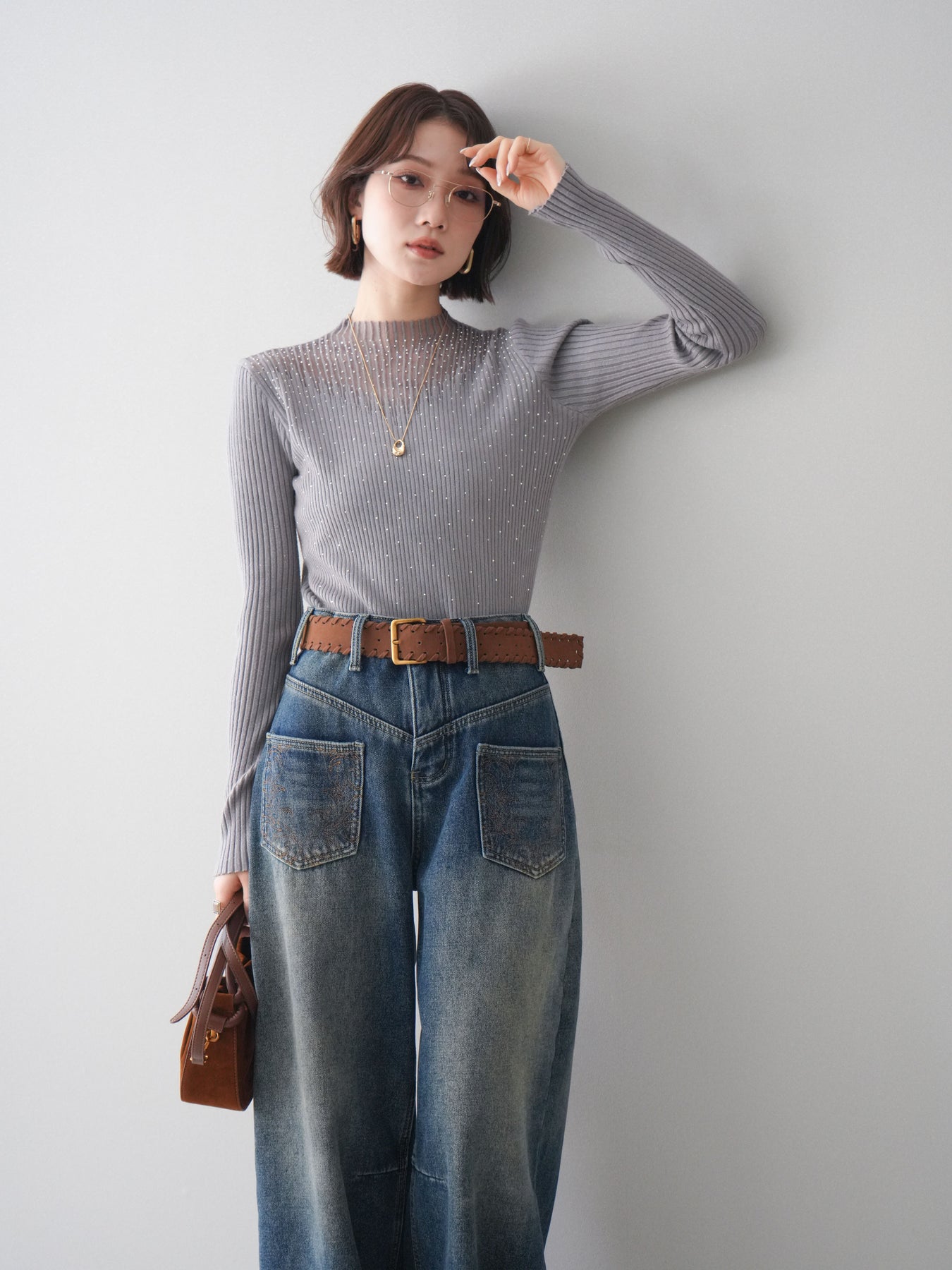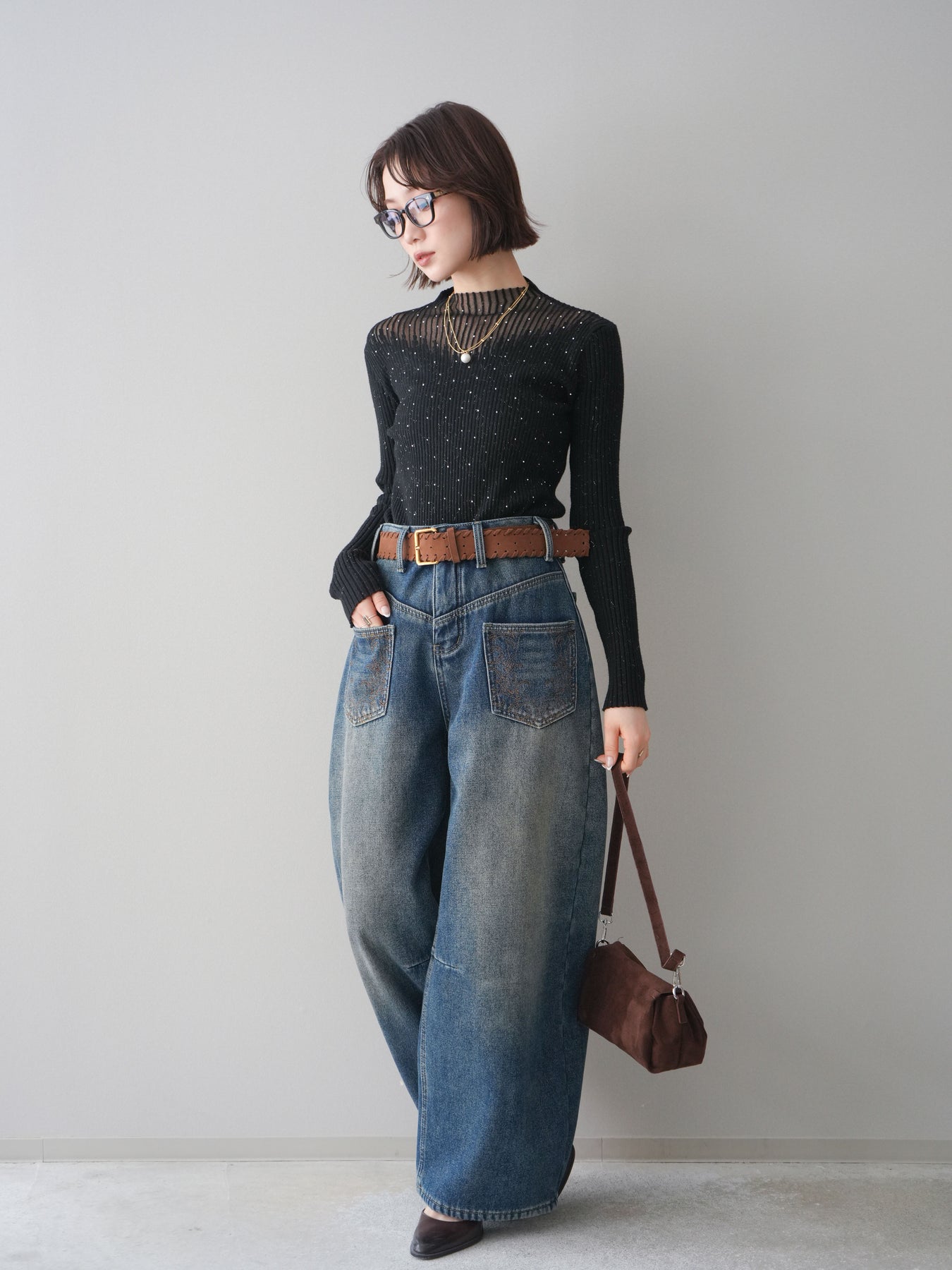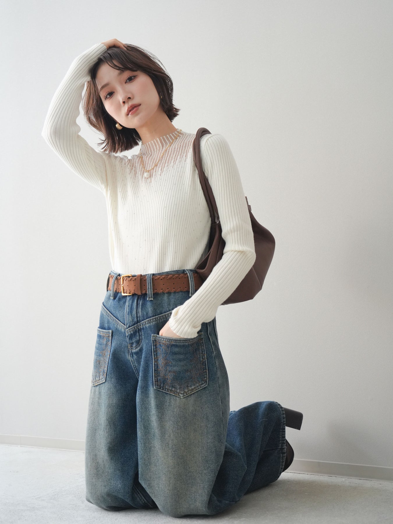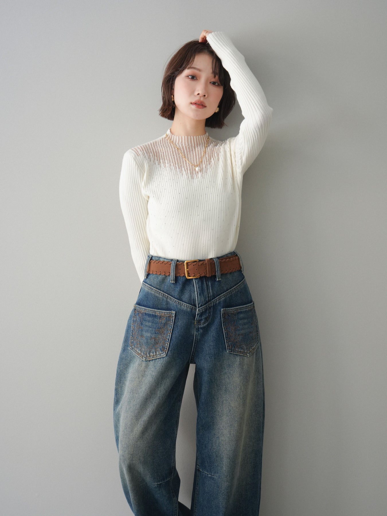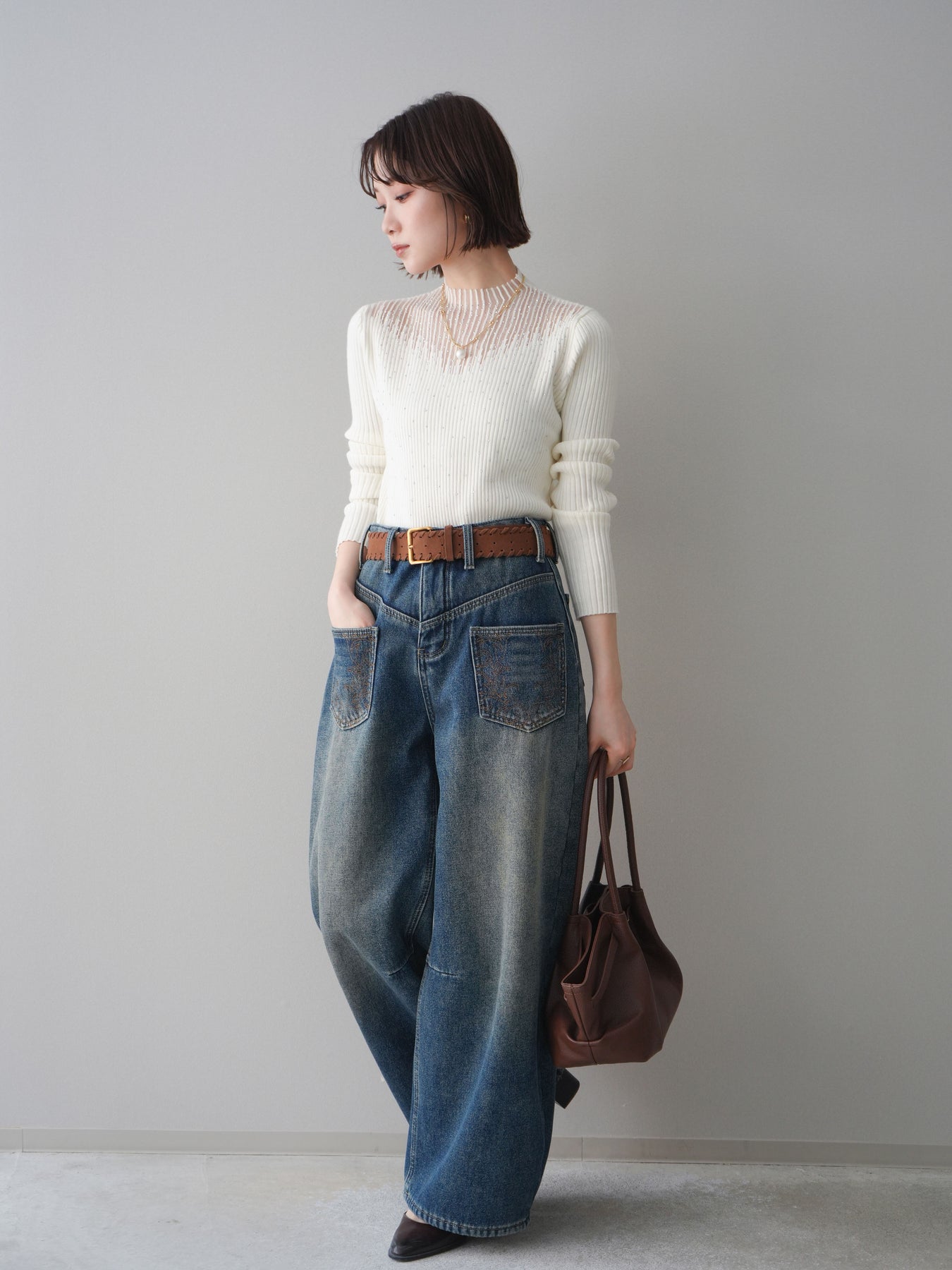 ◆ [予約]ベルト付ポケット刺繍カーブデニムパンツ