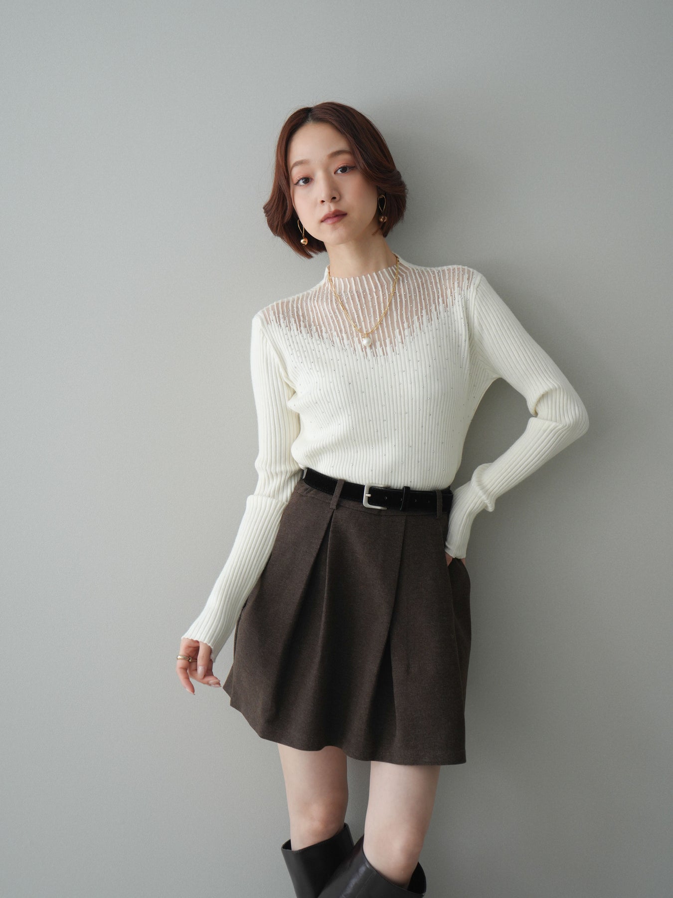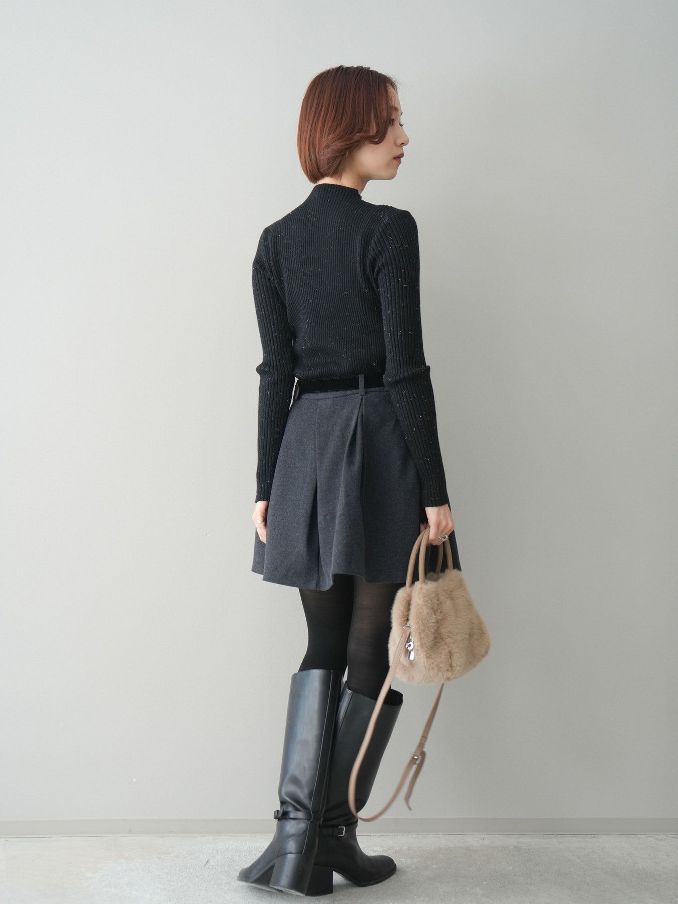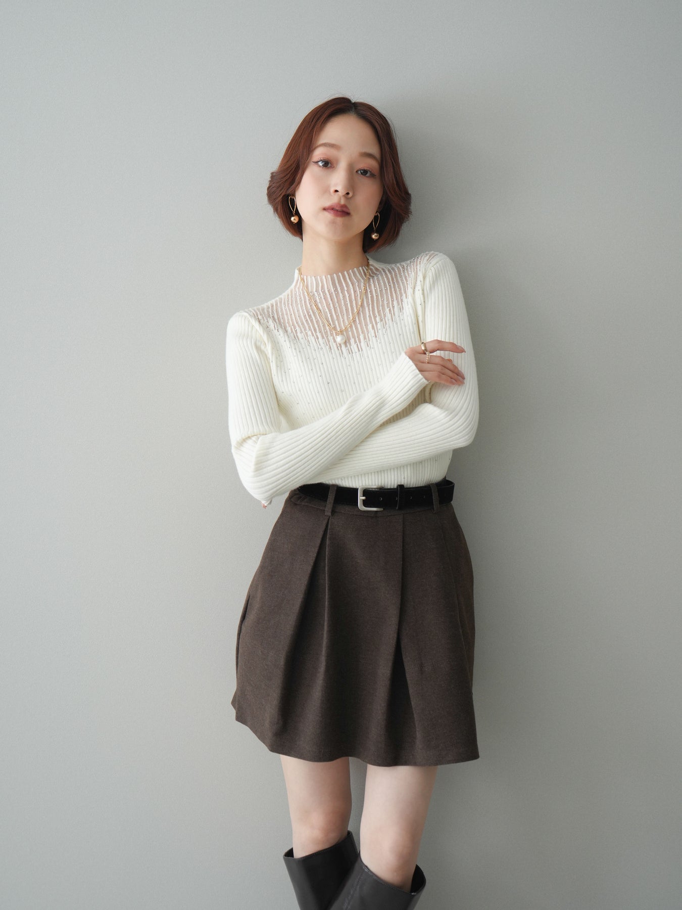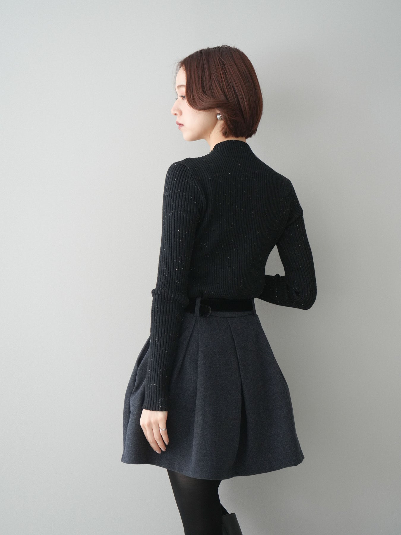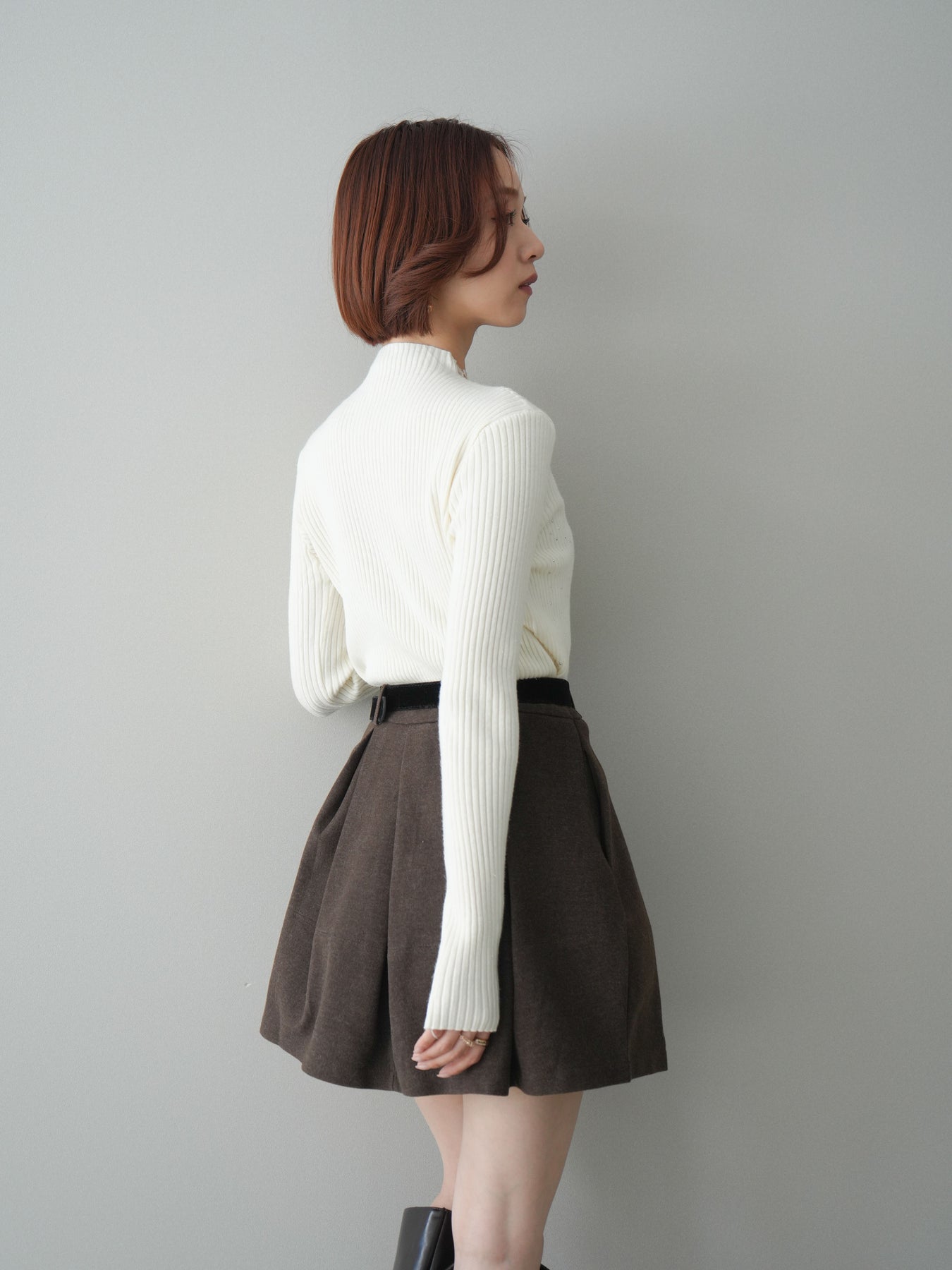 フロントに深めのタックを施し、立体感のあるシルエットに仕上げたミニスカート。ほどよいハリのある素材が美しいAラインをキープし、脚をすっきりと見せてくれます。ウエストには上品なベルトをセットし、スタイリングのアクセントになるだけでなく、スタイルアップ効果もプラス。ブーツやパンプスなど幅広いシューズと相性が良く、シンプルなトップスを合わせるだけで大人らしいバランスに仕上がる万能アイテムです。